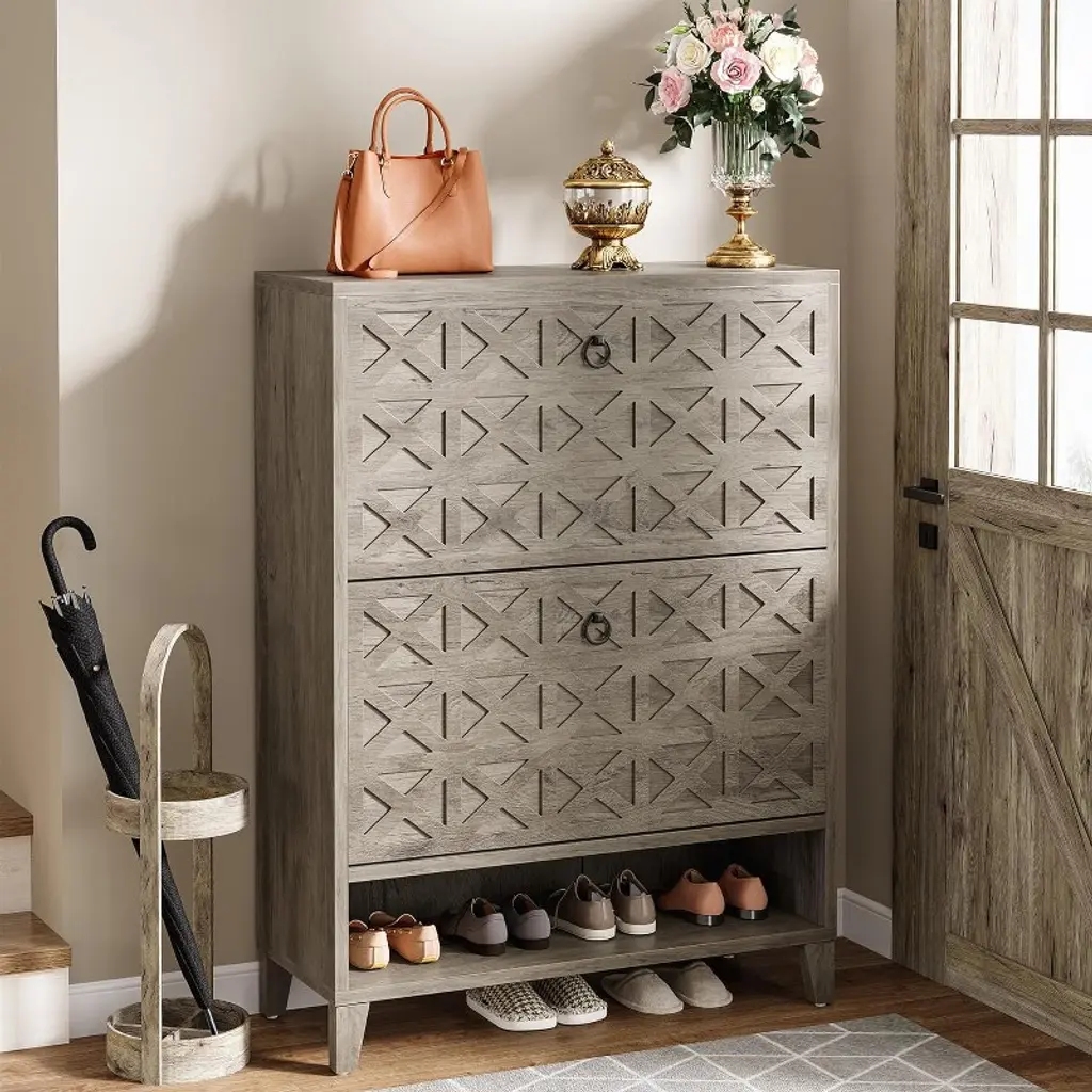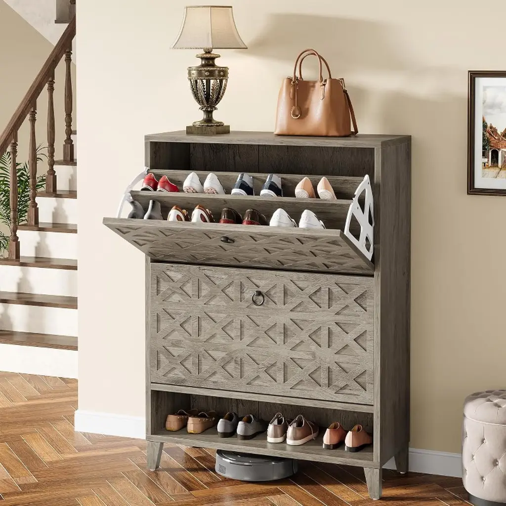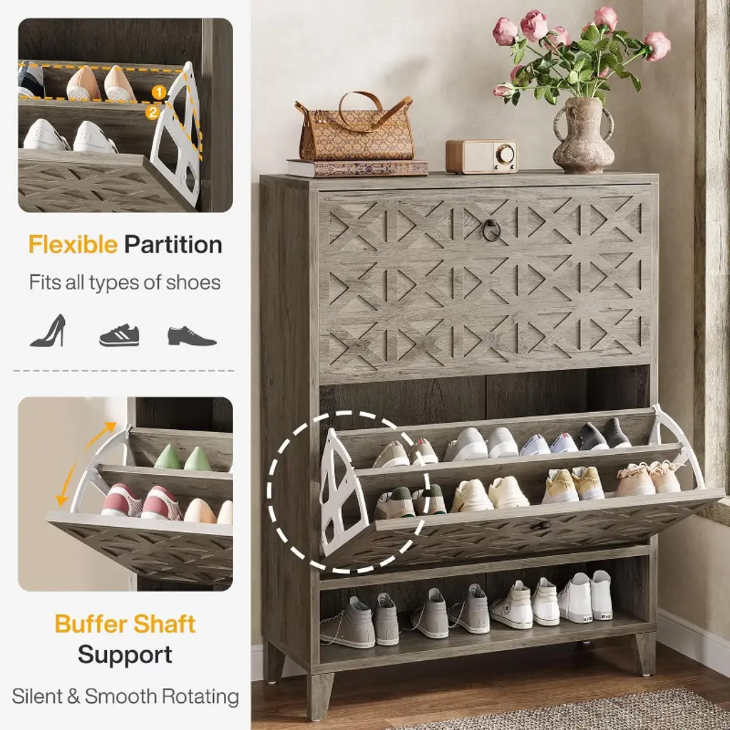 Measuring 31.5" W x 9.5" D x 43.3" H, this shoe storage cabinet offers ample space, accommodating up to 16-20 pairs of shoes. It features two flip drawers with adjustable, removable panels to accommodate shoes of different heights. Additionally, the unique stereoscopic pattern design of the cabinet doors adds the vintage farmhouse characteristic. The sleek and simple appearance can perfectly fit any corner of your living space, such as the entryway, hallway, living room, bedroom, and closet.