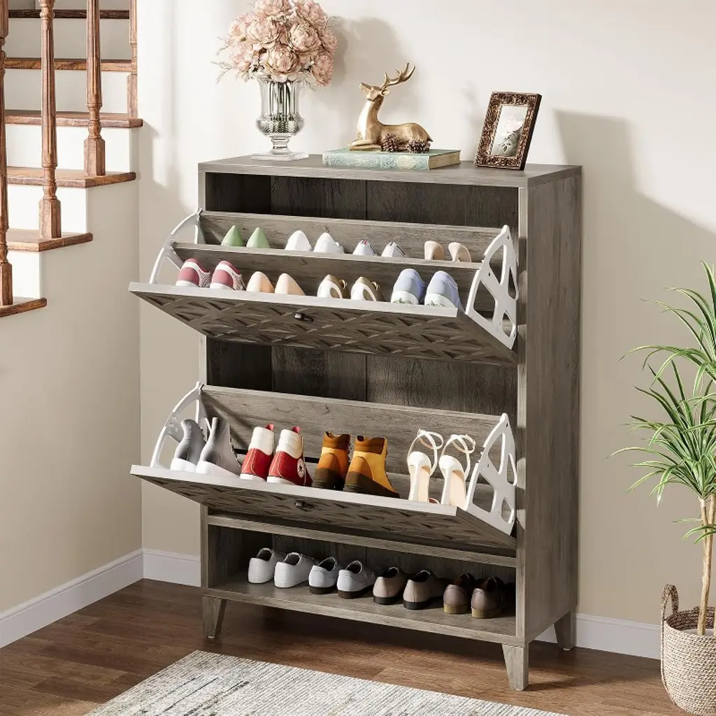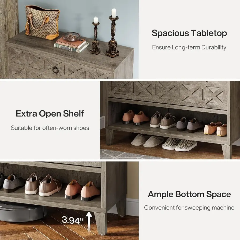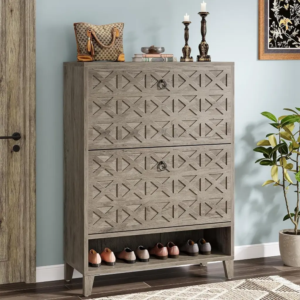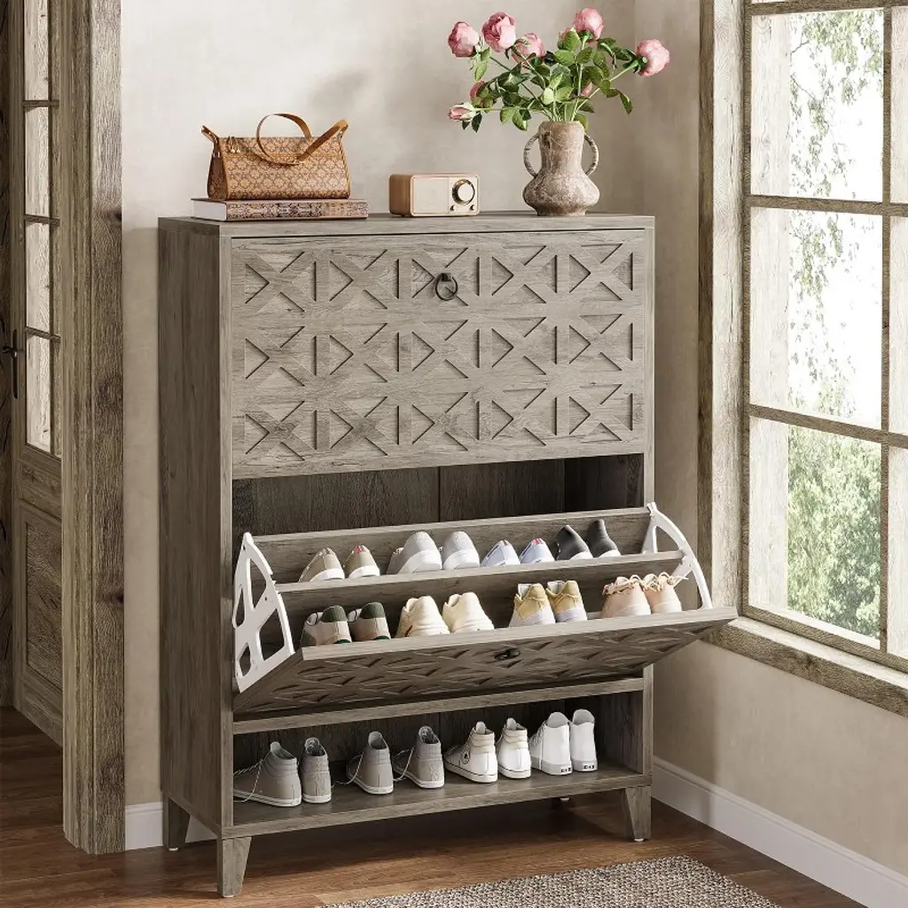 Measuring 31.5" W x 9.5" D x 43.3" H, this shoe storage cabinet offers ample space, accommodating up to 16-20 pairs of shoes. It features two flip drawers with adjustable, removable panels to accommodate shoes of different heights. Additionally, the unique stereoscopic pattern design of the cabinet doors adds the vintage farmhouse characteristic. The sleek and simple appearance can perfectly fit any corner of your living space, such as the entryway, hallway, living room, bedroom, and closet.