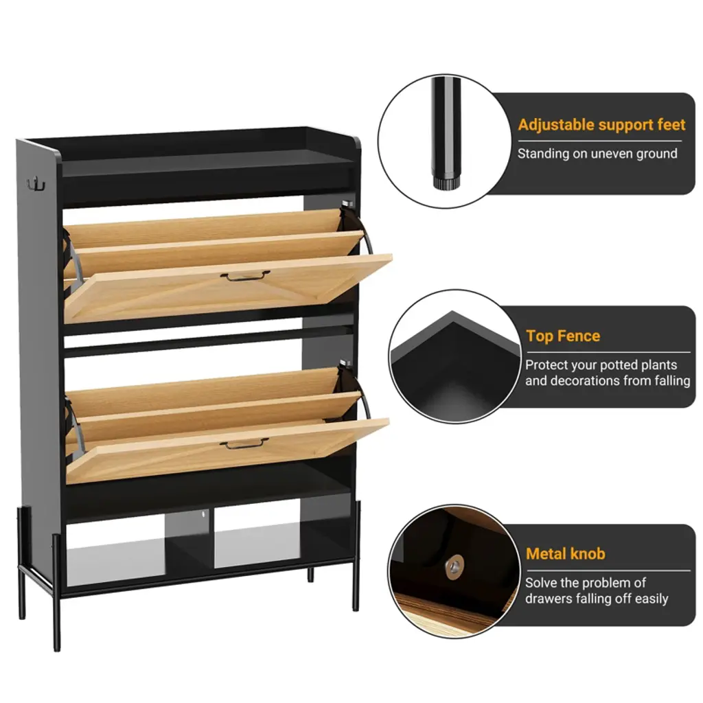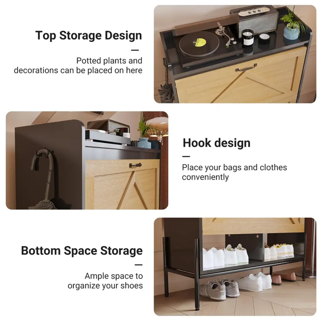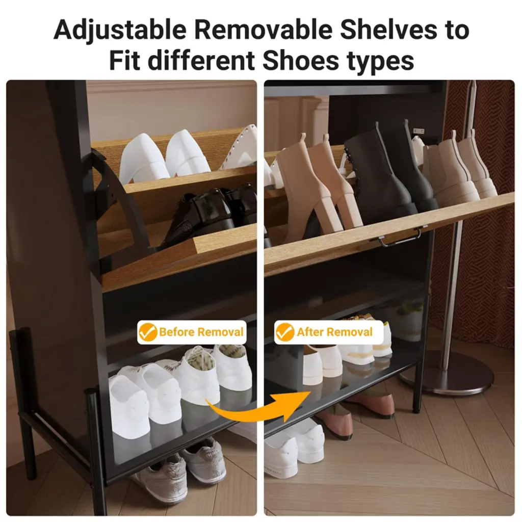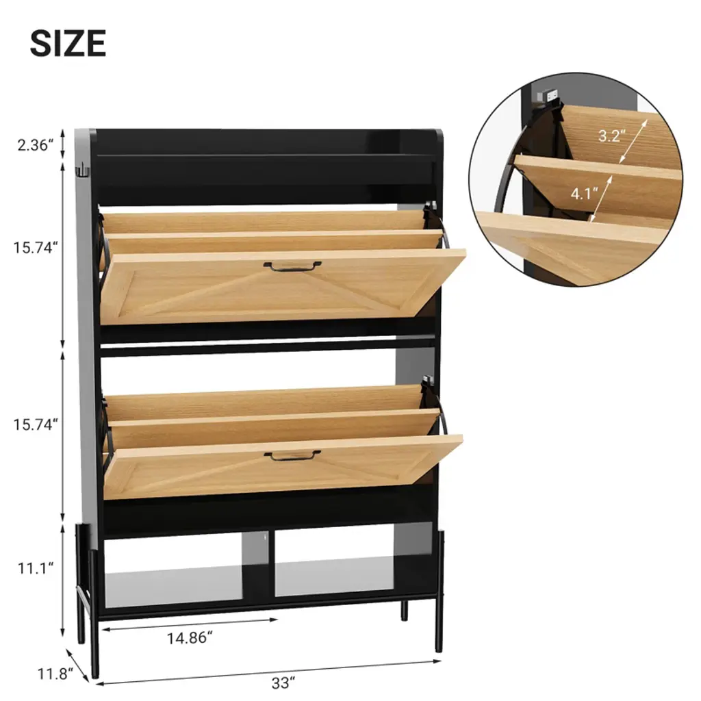 Black & Oak Shoe Cabinet with 2 Flip-Doors ¨C Farmhouse Entryway OrganizerQuick-Access StorageDimensions: 42.26"D x 18.31"W x 7.48"HFlip-down doors for instant visibility (no bending required)Large Capacity Design3-tier compartments for 20-24 pairs (flats to boots)Adjustable layouts for seasonal rotationsEco-Safe ConstructionFormaldehyde-free MDF with water-resistant surfacesRounded safety corners for child/pet protectionReinforced StabilityCross-braced steel frame (supports 220 lbs)Adjustable feet for uneven floorsTool-Free Assembly15-minute setup with pre-drilled componentsNumbered slots for intuitive installation