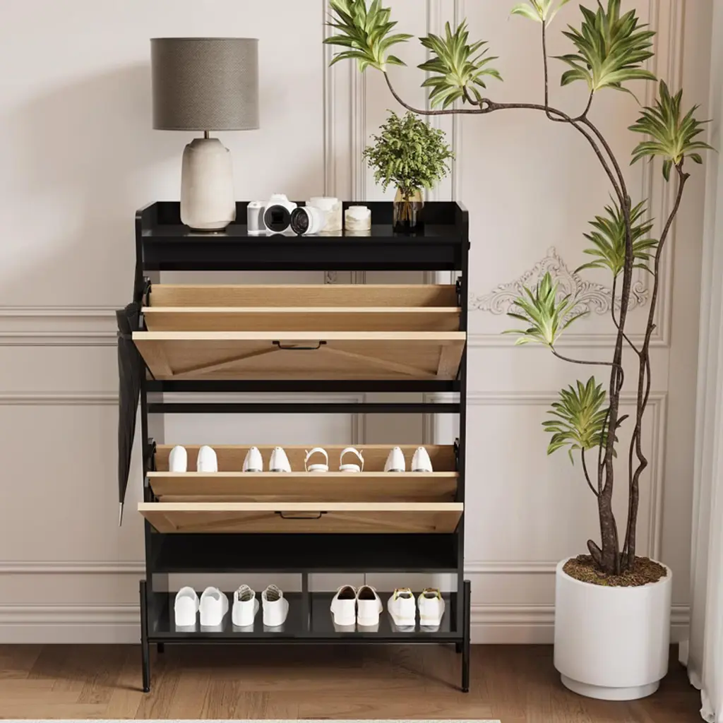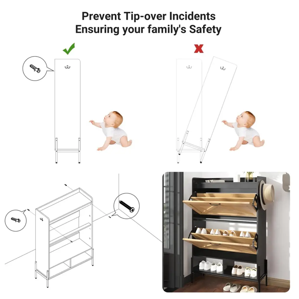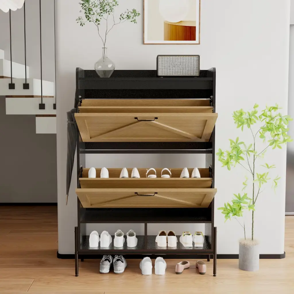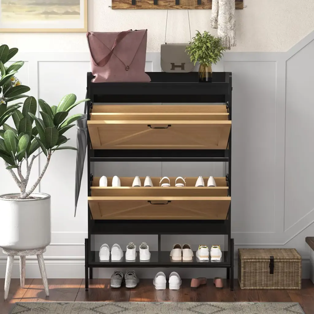 Black & Oak Shoe Cabinet with 2 Flip-Doors ¨C Farmhouse Entryway OrganizerQuick-Access StorageDimensions: 42.26"D x 18.31"W x 7.48"HFlip-down doors for instant visibility (no bending required)Large Capacity Design3-tier compartments for 20-24 pairs (flats to boots)Adjustable layouts for seasonal rotationsEco-Safe ConstructionFormaldehyde-free MDF with water-resistant surfacesRounded safety corners for child/pet protectionReinforced StabilityCross-braced steel frame (supports 220 lbs)Adjustable feet for uneven floorsTool-Free Assembly15-minute setup with pre-drilled componentsNumbered slots for intuitive installation
