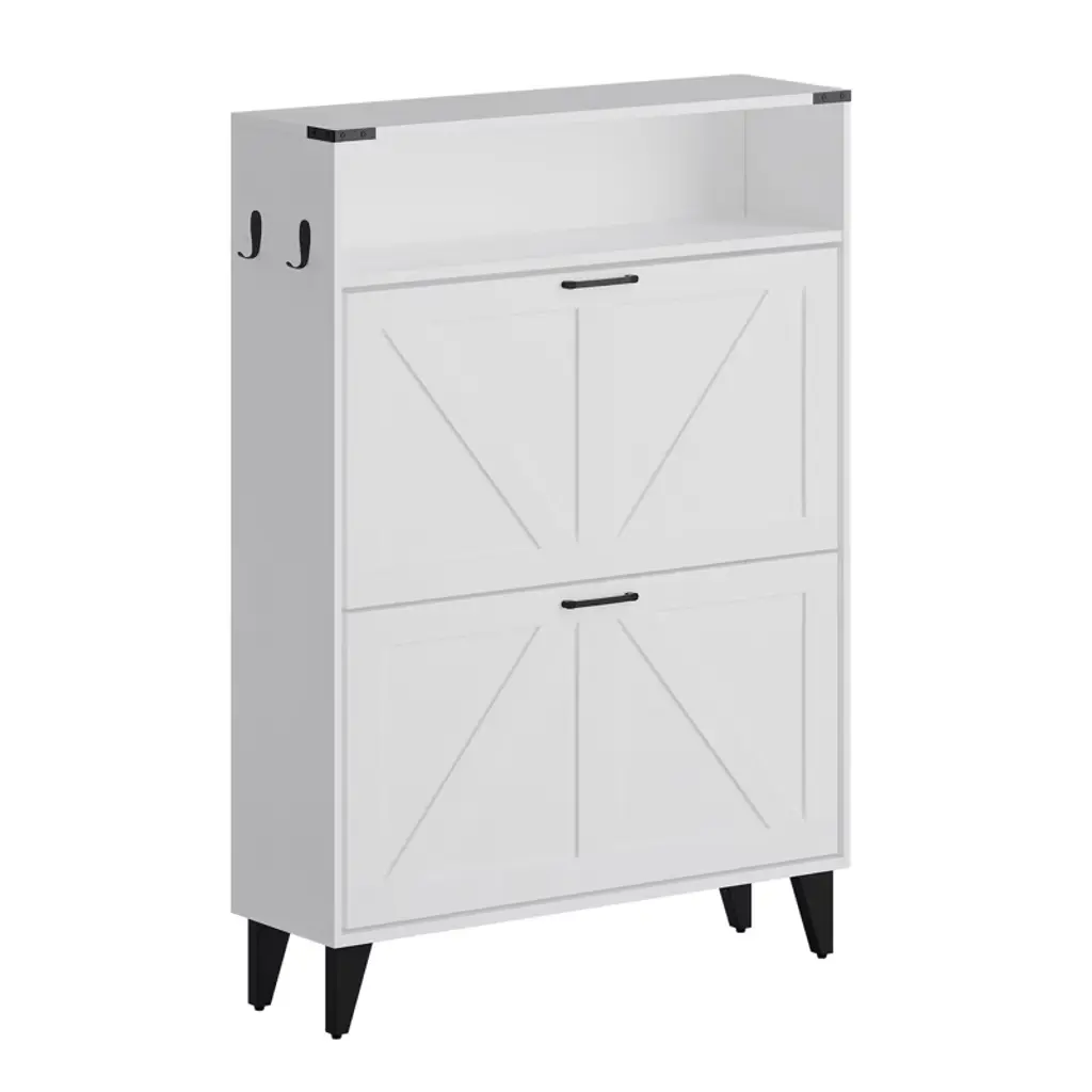 White Slim Shoe Cabinet with 2 Flip Drawers ¨C Freestanding Entryway OrganizerSpace-Saving Storage SolutionDimensions: 31.5"D x 9.45"W x 44.49"H (slim profile for tight spaces)2 flip drawers with removable dividers for customizable shoe organizationVersatile & Functional DesignAdjustable feet for stability on uneven surfaces4 integrated hooks for hanging umbrellas/keysPremium ConstructionEngineered wood (P2 particle board) frameSturdy metal legs with protective floor padsSafety FeaturesAnti-tipping device for child/pet safetySupports heavy shoe collections (60 lbs total weight)Easy AssemblyIncludes labeled parts + clear instructions24-hour customer support