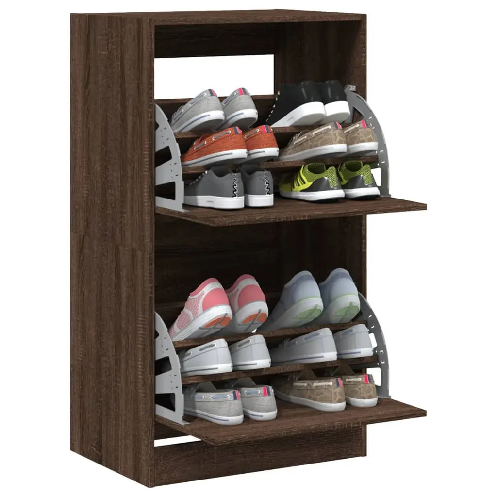 This shoe cabinet is all about function and modern looks. The tall unit has a gorgeous brown oak finish that'll spruce up your entryway or living room while giving you a nice amount of space for your shoes. Flip-Down Drawers: The nifty flip-down design makes it easy to access your shoes, so keeping tidy is a breeze. Just a gentle pull and you can show off your shoes with ease, making space-saving effortless.Ample Storage: With three shelves and two handy flip-down drawers, this cabinet has tons of storage potential. You can easily store different shoe sizes and styles, ensuring everything's neat and handy when you need it.Contemporary Aesthetic: Finished in lovely brown oak, this shoe cabinet fits right into modern decor. Its smooth texture and matte finish give a sophisticated vibe to your space.Space-Saving Design: This cabinet's built for wall mounting, freeing up floor space—ideal for narrow hallways or smaller apartments. The tidy design keeps shoes off the floor and your area looking organized.Durable Materials: Made from engineered wood, this cabinet looks refined and promises to last. Its moisture-wicking structure keeps your shoes safe from damage while standing up to daily use.