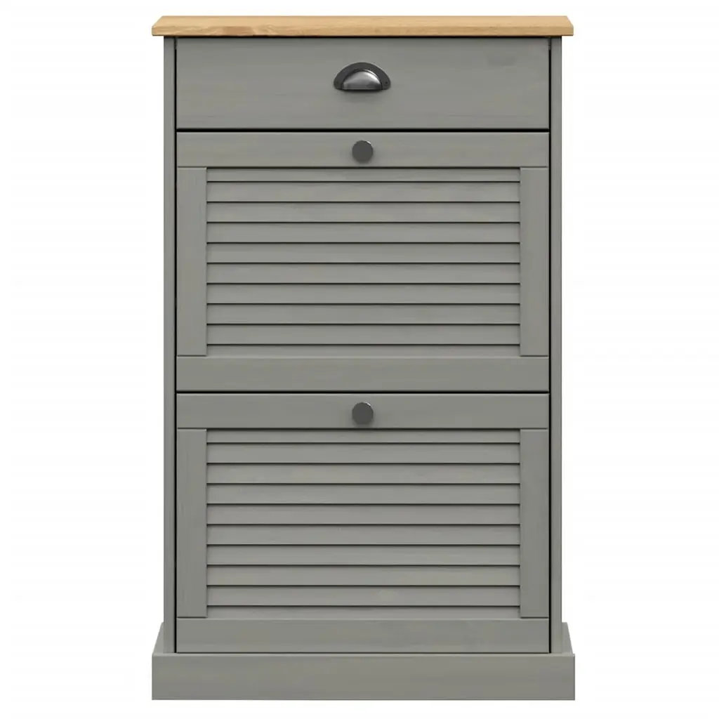 This shoe cabinet is a smart solution for keeping your shoes organized, designed to fit into your hallway or living room while offering plenty of space for your favorite pairs. With its modern grey finish and sleek lines, it doesn't just store shoes; it enhances your space's decor, making it a practical yet stylish addition everyone can appreciate. High storage capacity: Offers plenty of space for shoes, perfect for keeping your place tidy.Modern aesthetics: The clean grey finish and contemporary design fit with various styles, adding both function and flair to your home.Quality materials: Made from solid pine wood with a wax finish, giving it durability and a nice, smooth feel for long-lasting use.Organizational features: Comes with two built-in shelves and a drawer, making it easy to sort and grab your favorite shoes.Stable and safe: Includes a wall attachment device to keep it secure, preventing tipping and helping you stay organized.