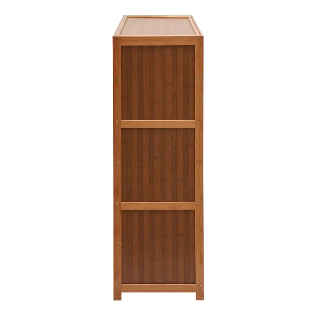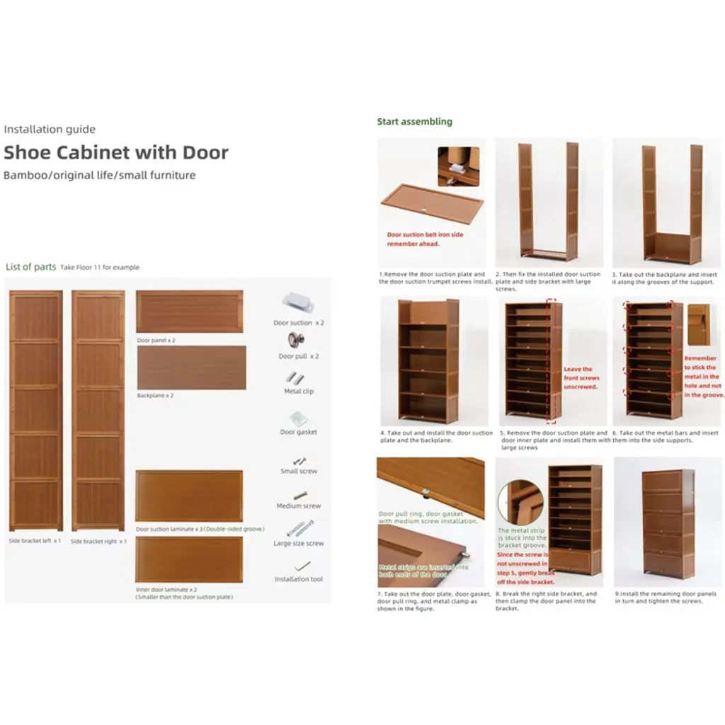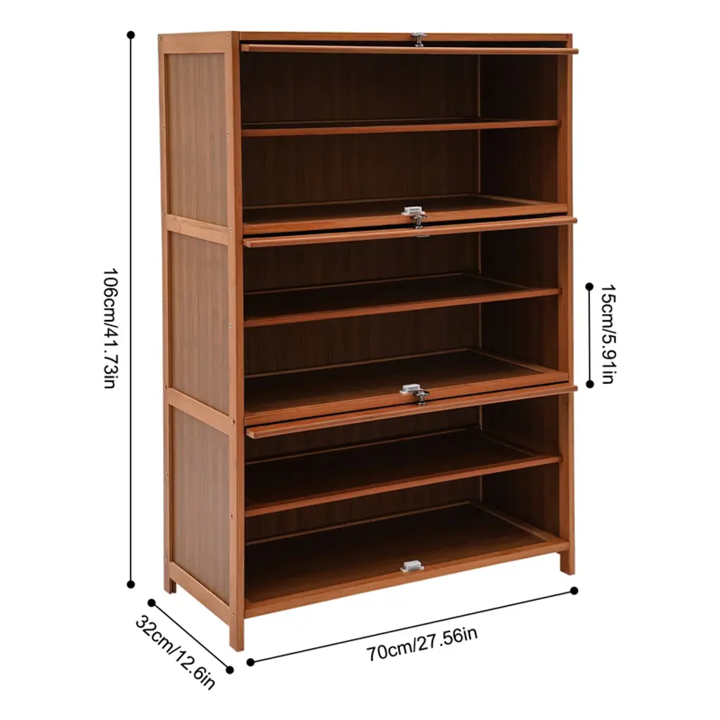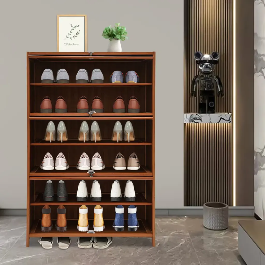 This sturdy and well-designed 6-tier shoe cabinet offers versatile storage. Made from durable bamboo and composite board, it's environmentally friendly and resistant to wear and corrosion. Inside, the 6 tiers (plus a top platform) neatly organize shoes, while the flip-up doors keep them clean, dry, and odor-free. The cabinet also features a spacious top for bags and keys, a raised bottom for ventilation, and smooth edges for safety. Easy to assemble, it's a practical and stylish addition to any home, ideal for keeping your entryway neat and organized. Specifications Material: Bamboo, Composite BoardProcess: PaintingColor: BrownStyle: ModernShape: RectangularMounting Type: Floor StandingAssembly Required: YesNumber of Tiers: 7( Including the Top Floor)Each Tier Bearing Capacity: 10-15kg/22.05-33.07lbsTier-spacing: 15cm/5.91inProduct Size: 70*32*106cm/27.56*12.6*41.73in