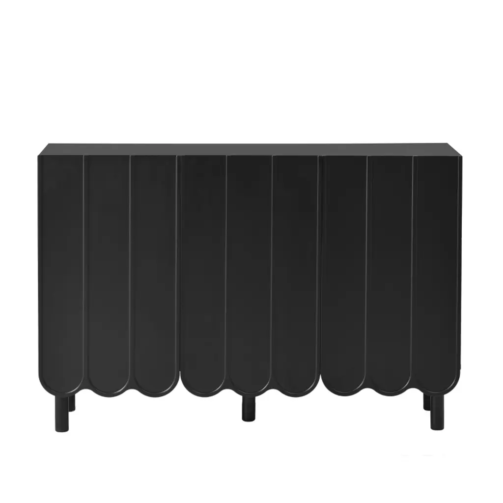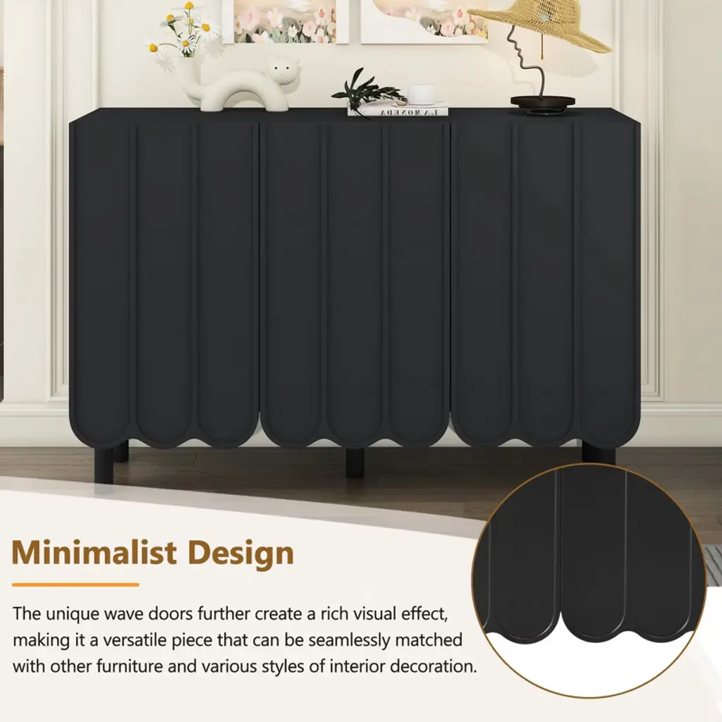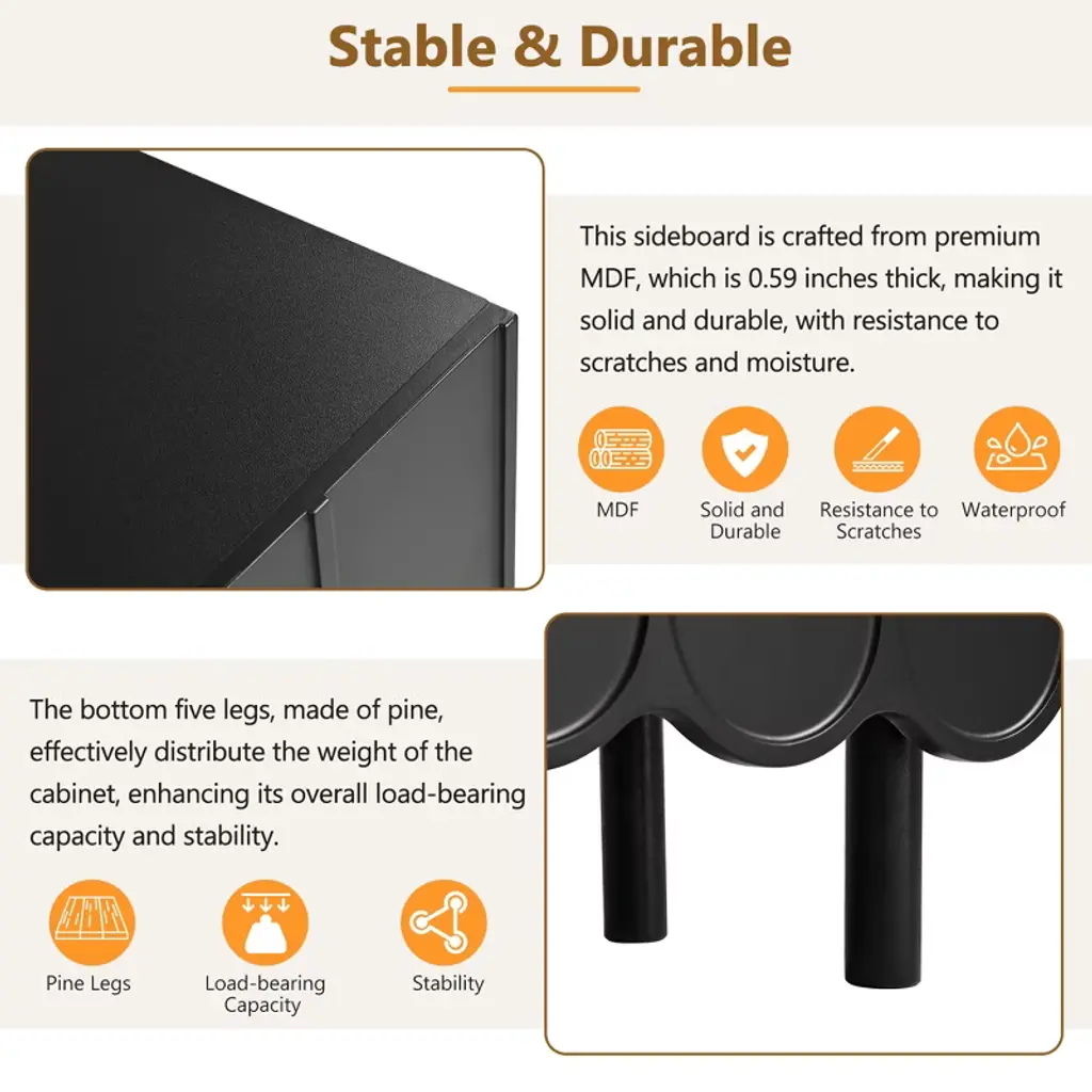 This shoe cabinet blends simplicity and style with classic colors, clean lines, and sleek finishes—its unique wave doors add rich visual depth,while bringing comfort to your living space. Storage flexibility is key: the right cabinet has two adjustable shelves, letting you tweak heights to fit tall shoes or create space for smaller items, making it adaptable to your changing needs. It’s far more than a shoe cabinet: use it as a buffet in the dining room/kitchen, accent storage in the bedroom/home office, or credenza in the study—its versatility fits every room. Built to last, it’s made of 0.59-inch premium MDF, which is solid, scratch-resistant, and moisture-resistant, standing up to daily wear. Five pine legs at the bottom evenly distribute weight, enhancing both load-bearing capacity and overall stability, so it stays secure for years.