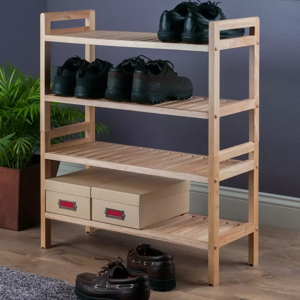 The Mercury 2-Piece Stackable Shoe Rack Set from Winsome keeps your entryway, mudroom or guest room well organized while providing a functional space to store your shoes. This set includes two open-shelf shoe racks that can be set over each other or placed side by side to suit your storage needs and space. Made from sturdy wood, this wooden shoe rack offers you plenty of space to hold up to 12 pairs of shoes, while the natural wood finish goes well with a variety of decor styles.