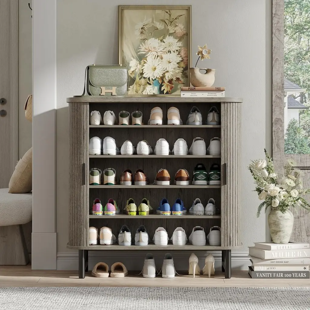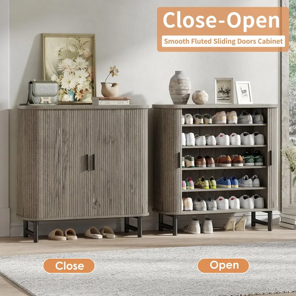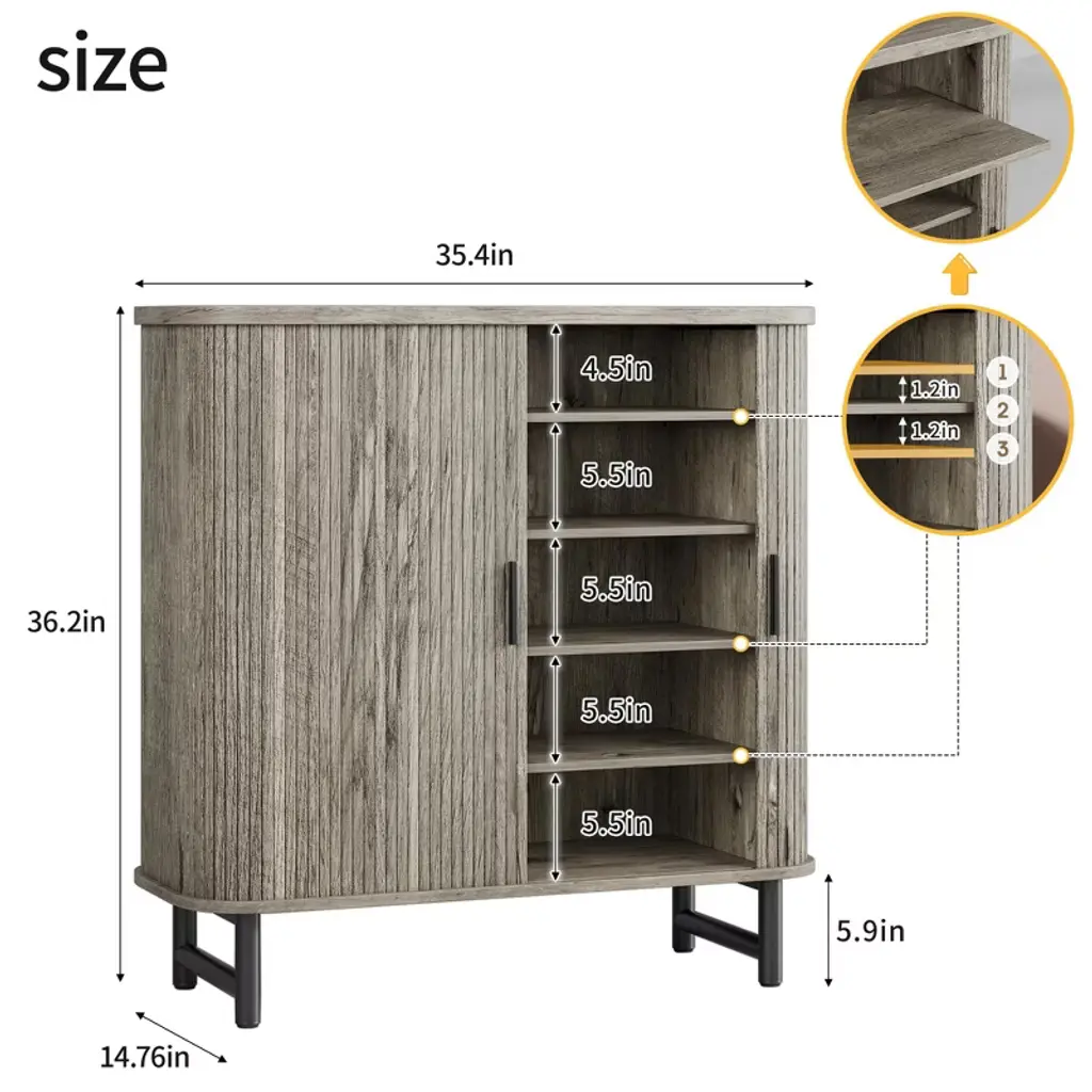 This shoe cabinet features smooth fluted sliding doors with "More Smooth with Use" technology—polished and waxed for easier operation over time, plus easy assembly. Its natural wood grain design adds modern elegance, blending with neutral decor. With 7 layers of storage (5 in doors, 1 top, 1 heightened bottom), it holds various shoes; the bottom eases cleaning. Four adjustable shelves (3 heights each, except the fixed 2nd) fit shoes of all types, even boots. Stylish and moisture-proof, it works as a shoe rack, kitchen pantry, etc., suitable for humid spaces like bathrooms.