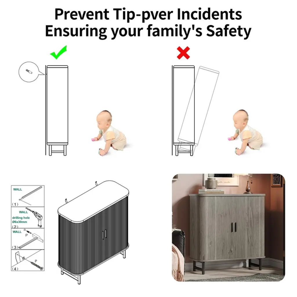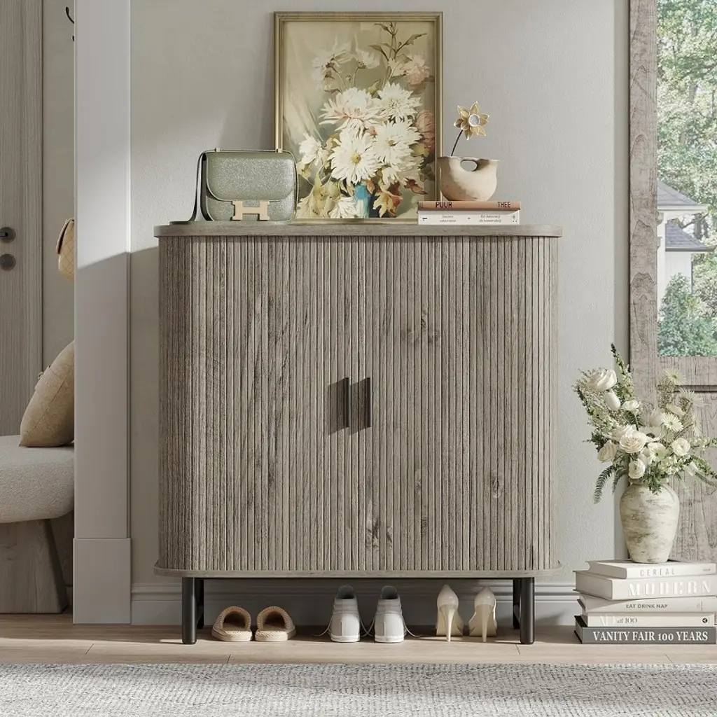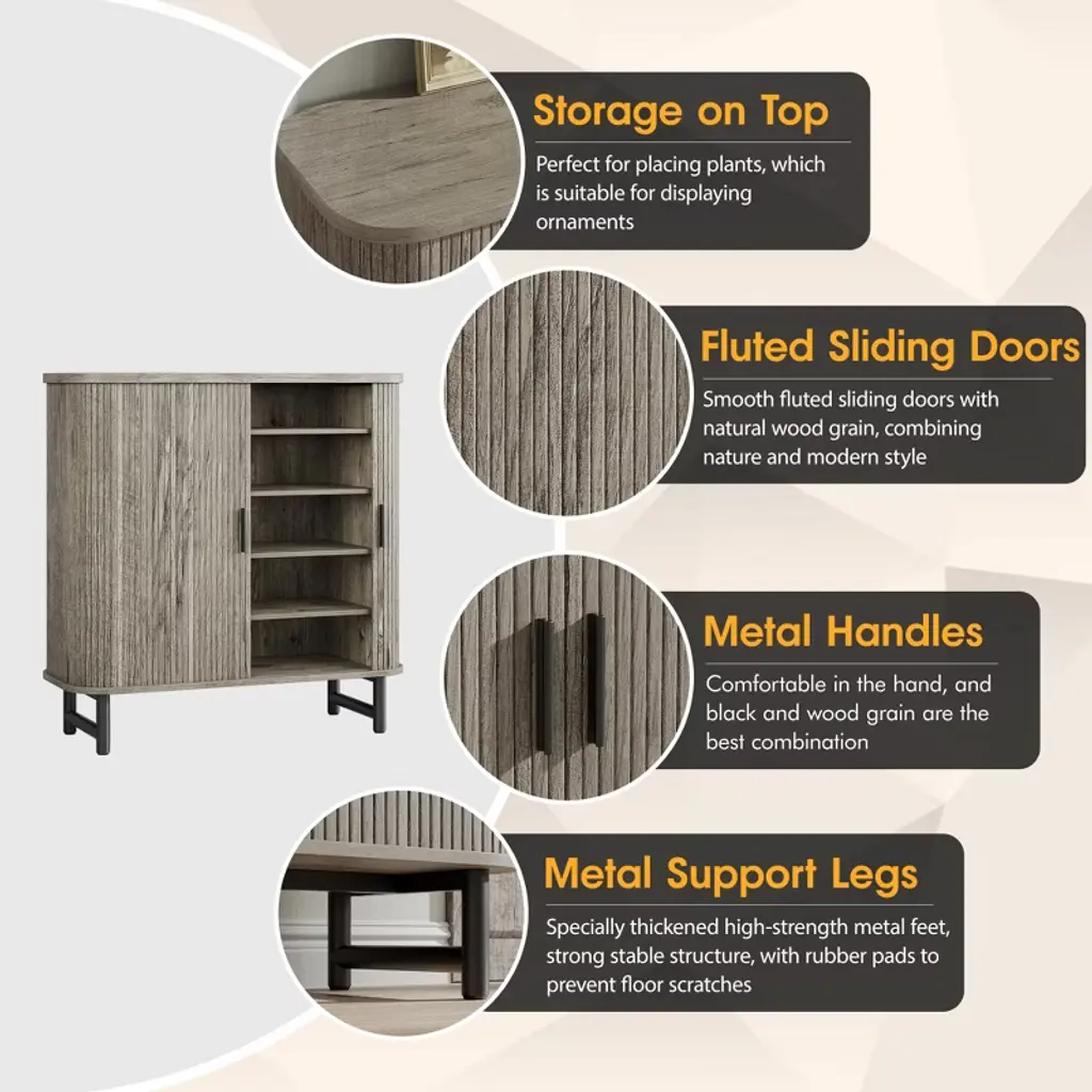 This shoe cabinet features smooth fluted sliding doors with "More Smooth with Use" technology—polished and waxed for easier operation over time, plus easy assembly. Its natural wood grain design adds modern elegance, blending with neutral decor. With 7 layers of storage (5 in doors, 1 top, 1 heightened bottom), it holds various shoes; the bottom eases cleaning. Four adjustable shelves (3 heights each, except the fixed 2nd) fit shoes of all types, even boots. Stylish and moisture-proof, it works as a shoe rack, kitchen pantry, etc., suitable for humid spaces like bathrooms.