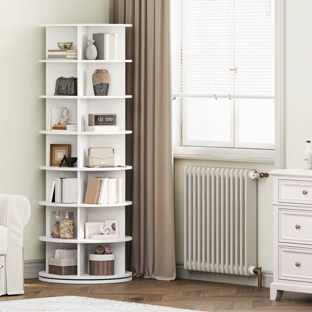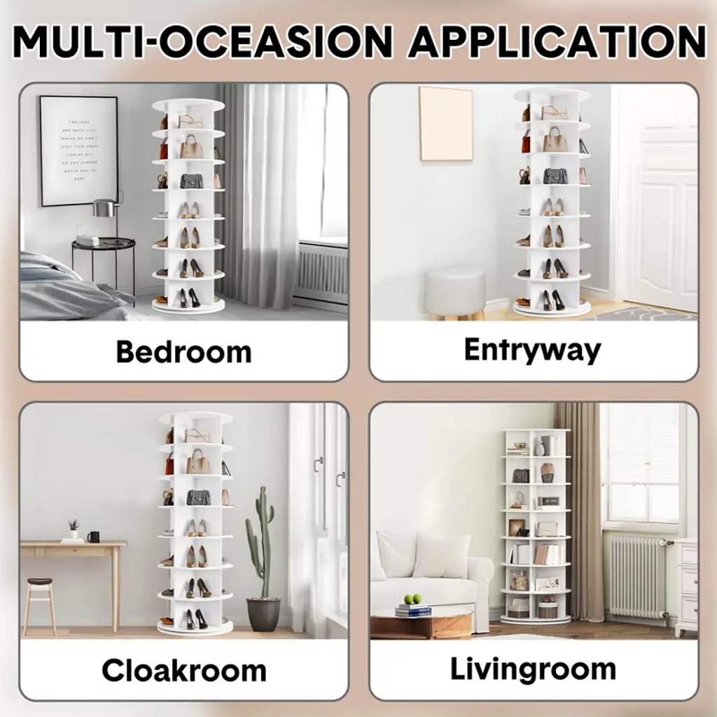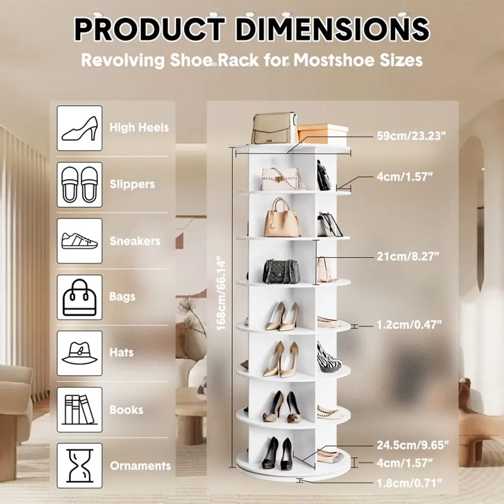 Product DescriptionThis 7-tier 360-degree rotating shoe rack tower maximizes storage while saving floor space, perfect for closets, bedrooms, or entryways. Its open design offers easy access and full visibility of shoes and accessories, preventing clutter and damage. Made from durable wood with a sturdy, wobble-free build, it doubles as a stylish organizer for shoes, handbags, and more. Quick, tool-free assembly makes it a convenient and elegant solution to keep your wardrobe neat and accessible.Product InformationColor: White/BlackMaterial: MelamineMounting Type: Floor MountShelf Type: Tiered ShelfShape: RoundSpecial Feature: FoldableItem Weight: 81.57 PoundsProduct Dimensions: 27.17"D x 25.98"W x 10.63"HAssembly Required: YesNumber of Items: 1Room Type: HallwayNumber of Shelves: 7