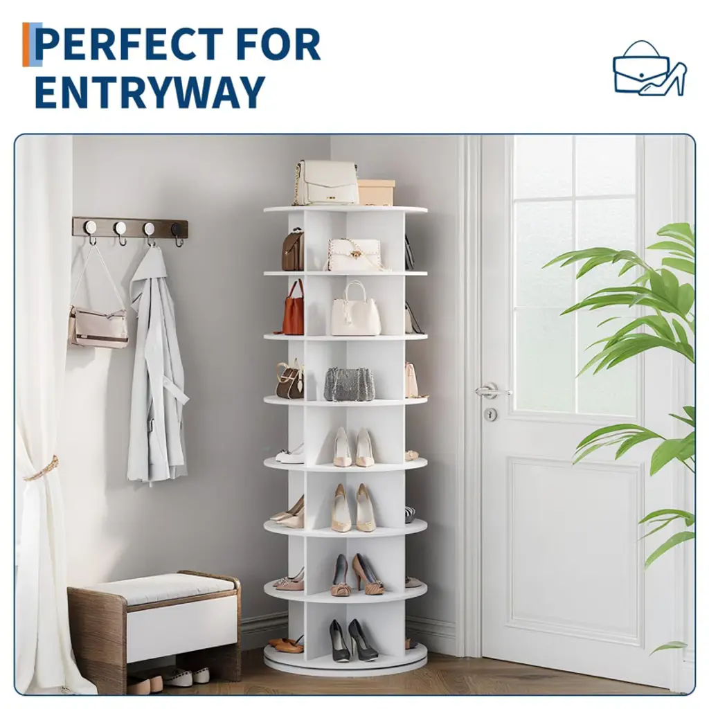 7-Tier Large Capacity: Organize up to 42 pairs of shoes with this spacious 7 tier rotating shoe rack, perfect for families or shoe lovers seeking a clutter-free entryway. 360° Rotating Design: Effortlessly access every pair of shoes with the smooth 360-degree revolving feature, making it easy to find and grab your favorite footwear in seconds. Space-Saving Vertical Storage: Maximize your floor space with the tall, round vertical design that fits neatly in entryways, closets, bedrooms, or hallways. Sturdy & Free Standing: Built with a stable, free-standing base, this shoe organizer offers reliable support and durability for daily use without the need for wall mounting. Modern White Finish: The sleek white finish and contemporary round shape blend seamlessly with any home décor, adding a stylish and functional storage solution to your space.