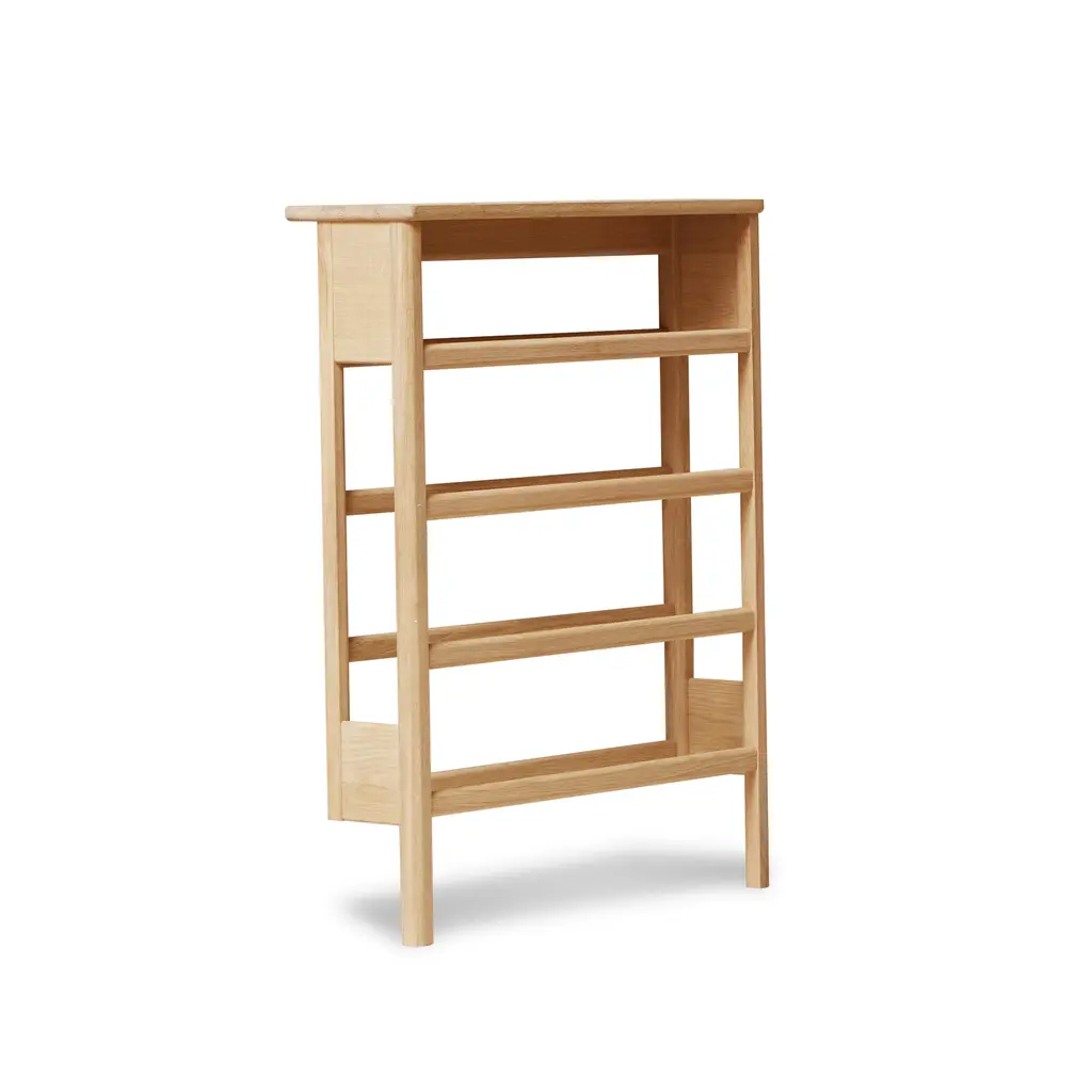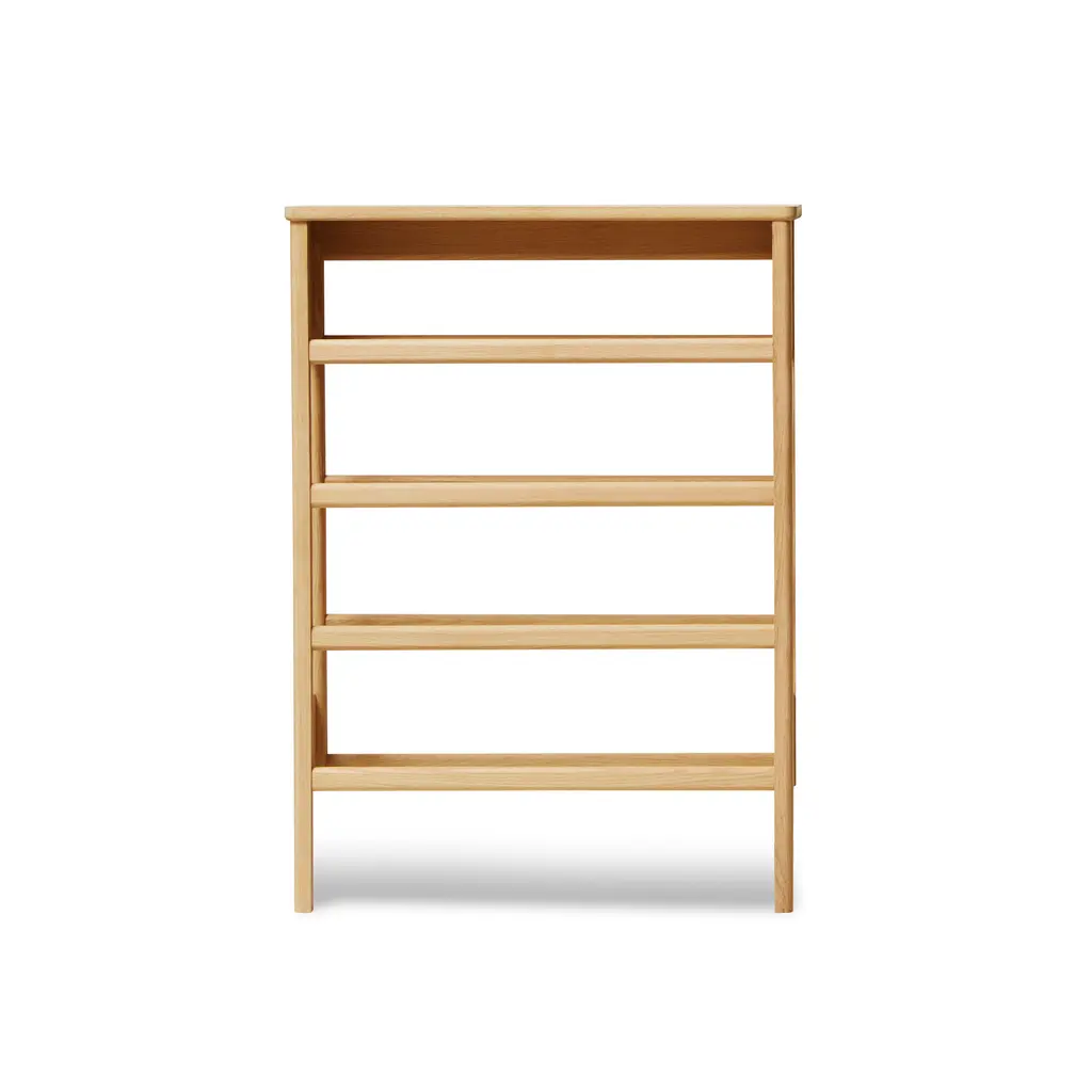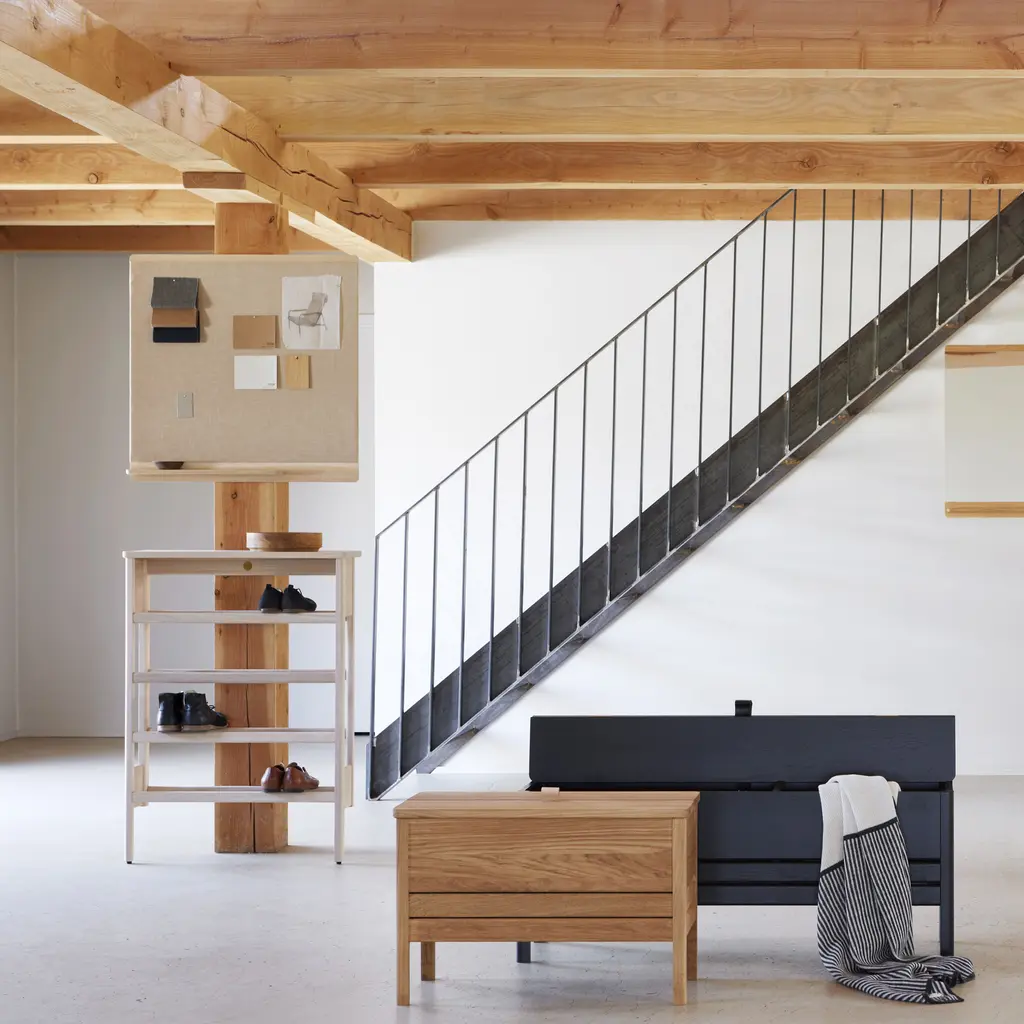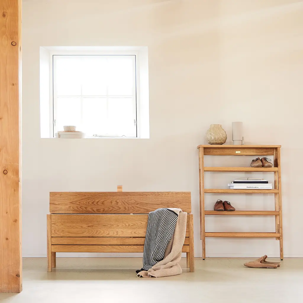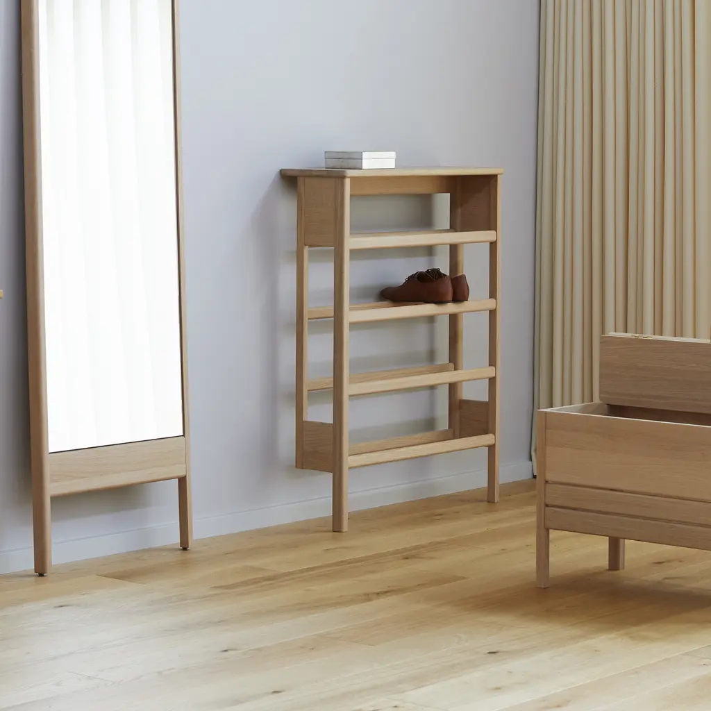The A Line Shoe Rack, blending form and function, is ingeniously designed to be both a shoe rack and a console table, ideal for narrow hallways, orderly utility rooms, or functional entrances. Crafted from sustainably sourced, premium oak, it features expertly rounded profiles, showcasing the finesse of traditional craftsmanship. The spacious top shelf extends beyond the shoe storage area, offering a convenient surface as a console table. This rack can comfortably accommodate up to twelve pairs of shoes, with three pairs fitting on each row, catering to a variety of shoe types. Its design allows for it to be conveniently leaned against the wall, offering ease of placement without the need for mounting. However, for added stability, mounting fittings are provided. This piece not only brings organization to your footwear but also adds a touch of elegant practicality to your home’s entryway.