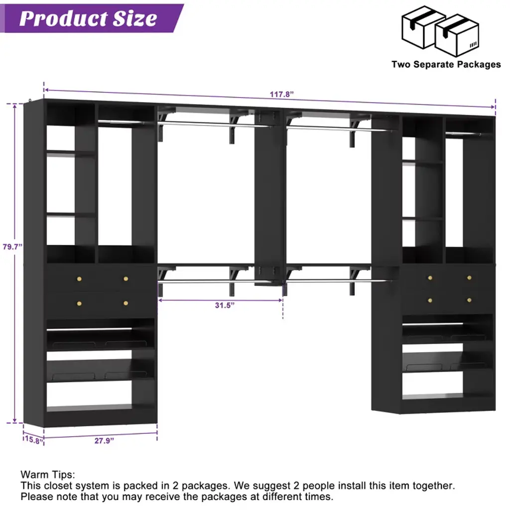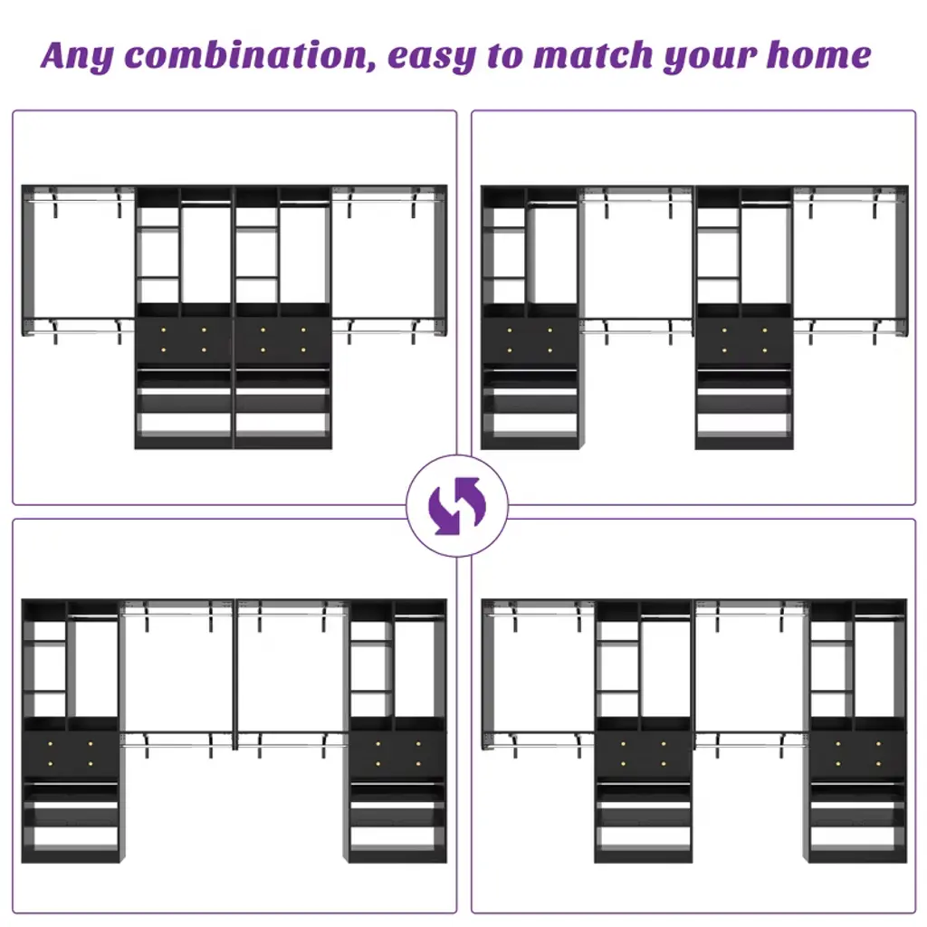 Aheaplus 117.8" Closet System With Wood Drawers, Shoe Racks, Hanging Rods