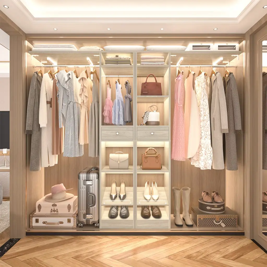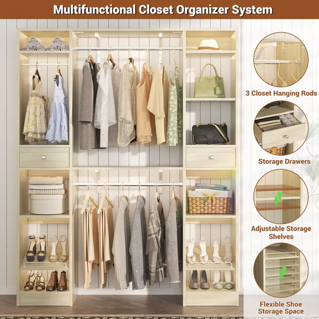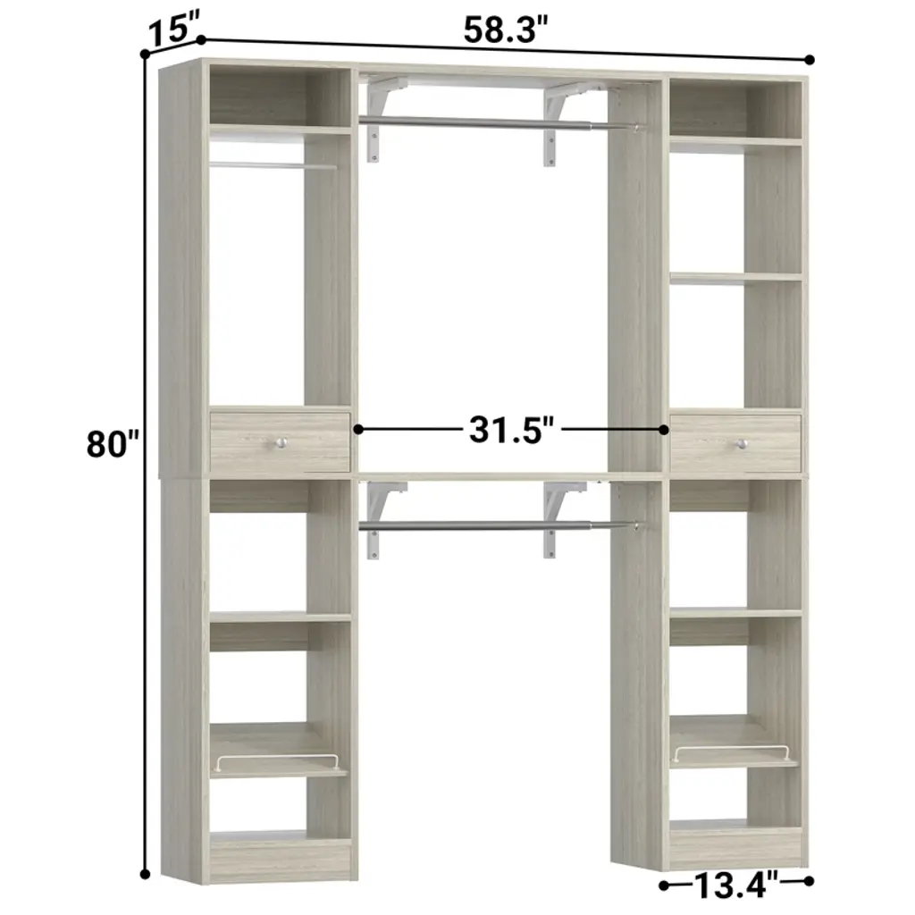 This closet system is thoughtfully designed to maximize storage efficiency. It boasts 3 hanging rods, 11 spacious shelves, and 2 versatile drawers, providing ample space to accommodate a wide range of clothing and accessories. The generous size and diverse storage options make it an ideal solution for both children and adults. The hanging rods and shelves offer flexibility in organizing, allowing you to customize the space to suit your needs. Whether you want to save space, hang more clothes, or adapt to the size of your home, this closet system is the perfect choice for optimizing your storage solutions.