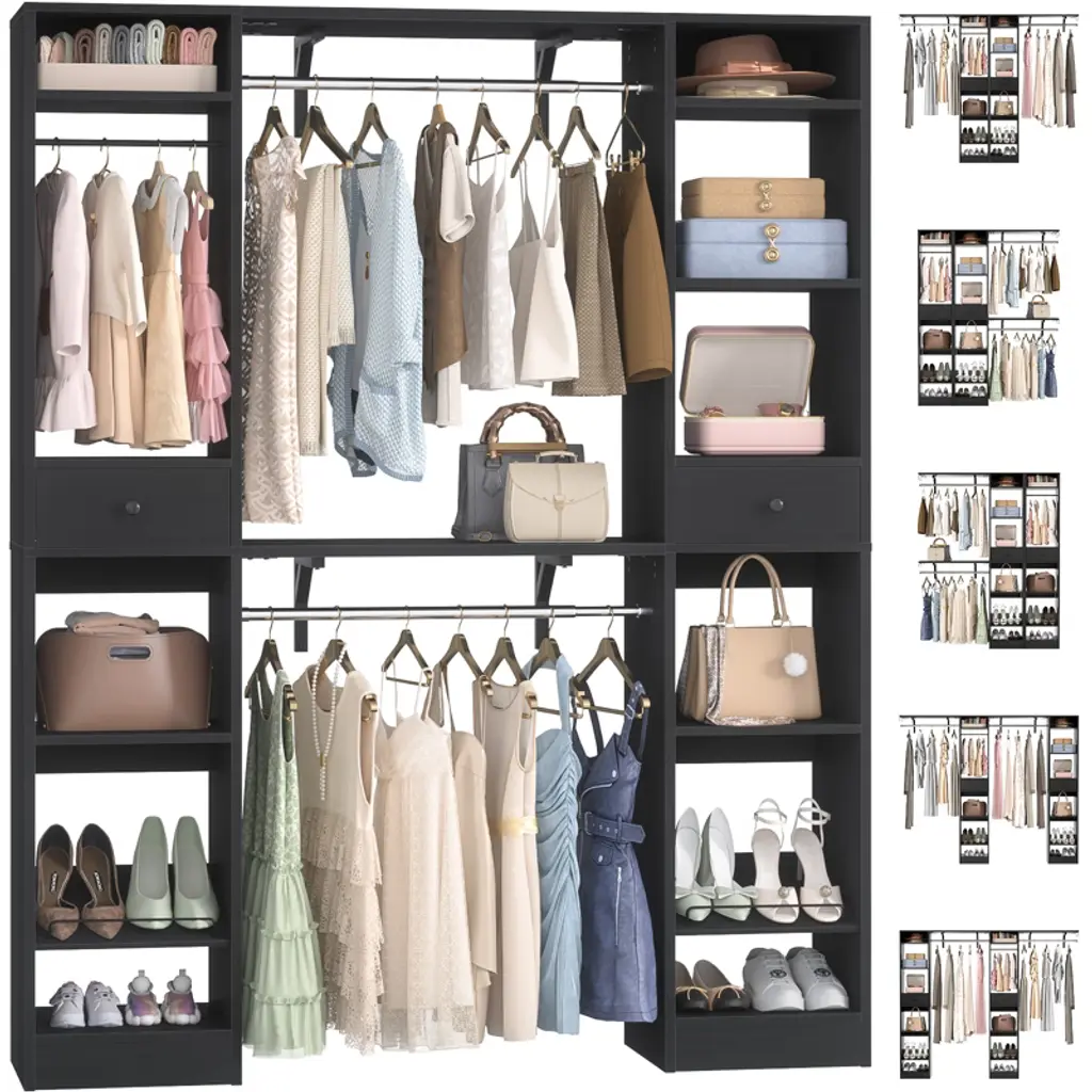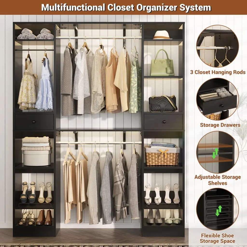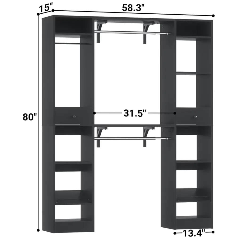 This closet system is thoughtfully designed to maximize storage efficiency. It boasts 3 hanging rods, 11 spacious shelves, and 2 versatile drawers, providing ample space to accommodate a wide range of clothing and accessories. The generous size and diverse storage options make it an ideal solution for both children and adults. The hanging rods and shelves offer flexibility in organizing, allowing you to customize the space to suit your needs. Whether you want to save space, hang more clothes, or adapt to the size of your home, this closet system is the perfect choice for optimizing your storage solutions.
