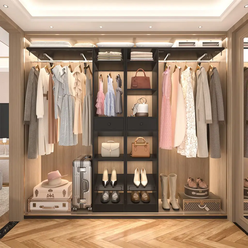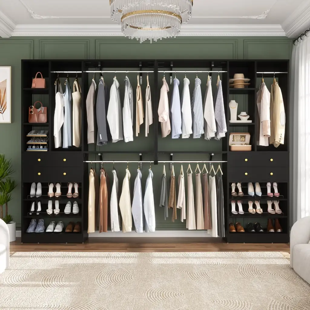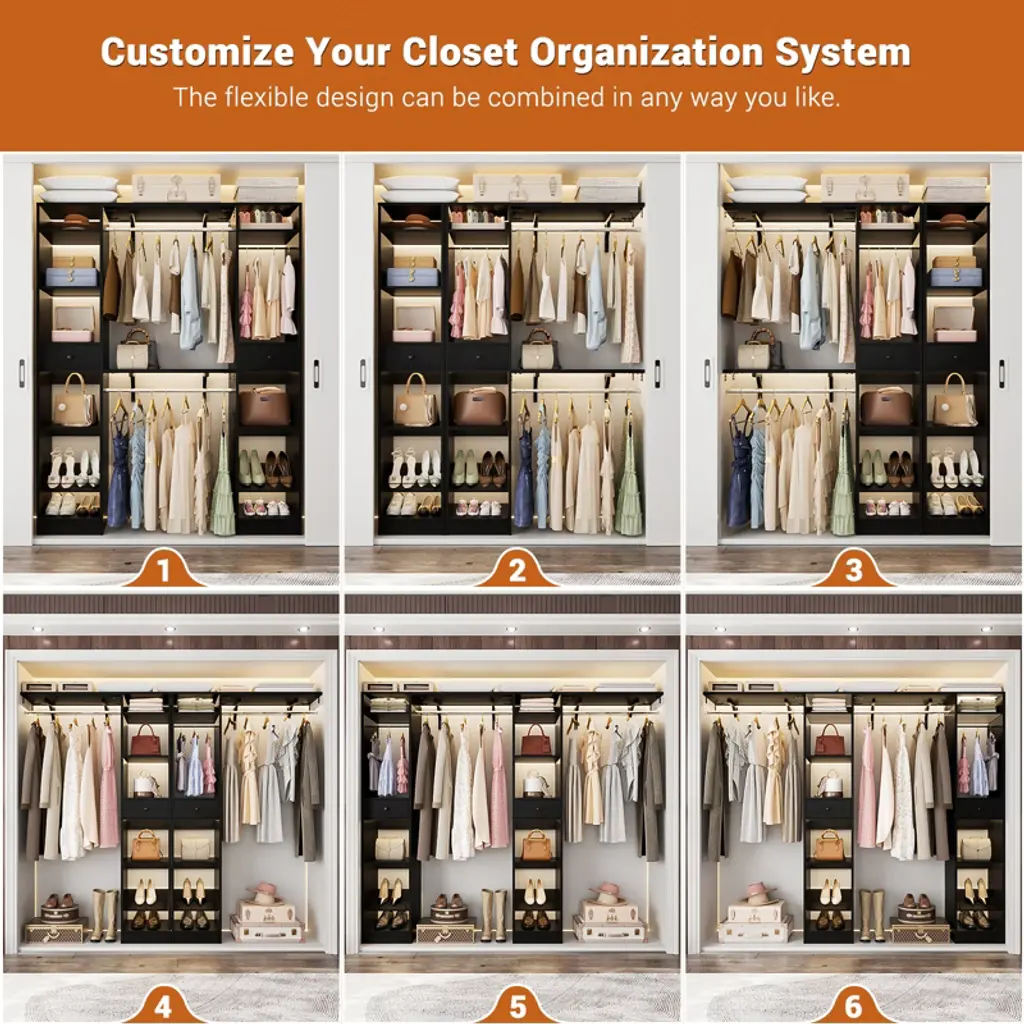 This closet system is thoughtfully designed to maximize storage efficiency. It boasts 3 hanging rods, 11 spacious shelves, and 2 versatile drawers, providing ample space to accommodate a wide range of clothing and accessories. The generous size and diverse storage options make it an ideal solution for both children and adults. The hanging rods and shelves offer flexibility in organizing, allowing you to customize the space to suit your needs. Whether you want to save space, hang more clothes, or adapt to the size of your home, this closet system is the perfect choice for optimizing your storage solutions.
