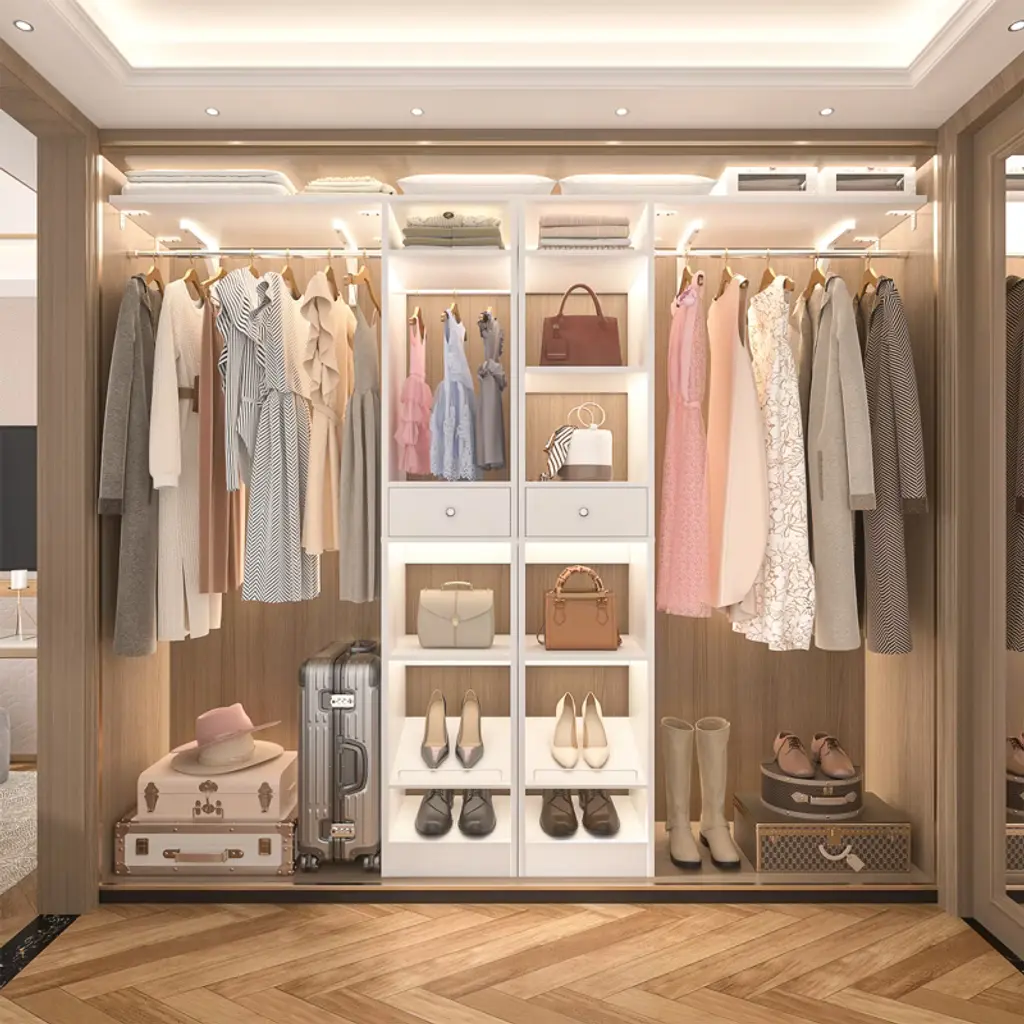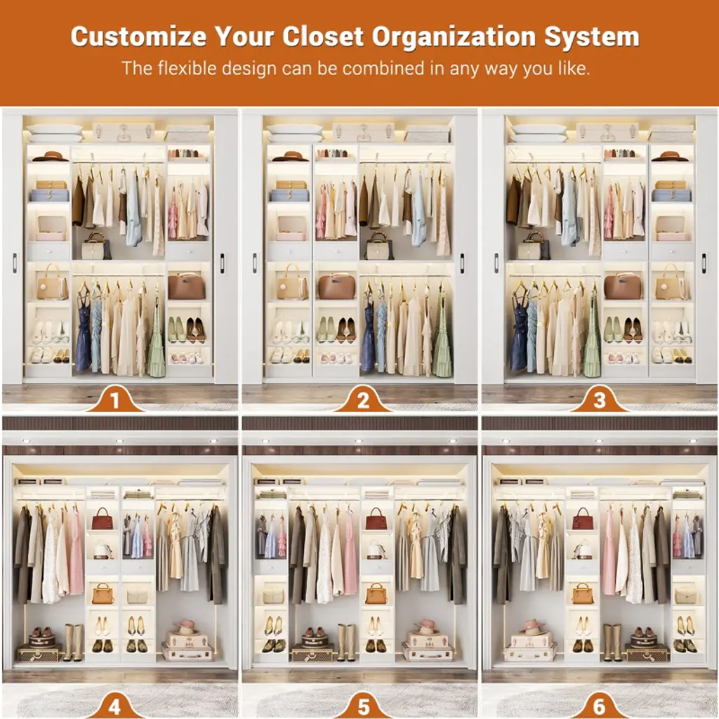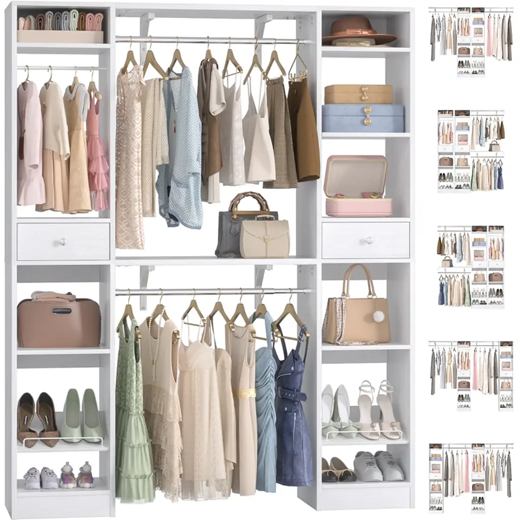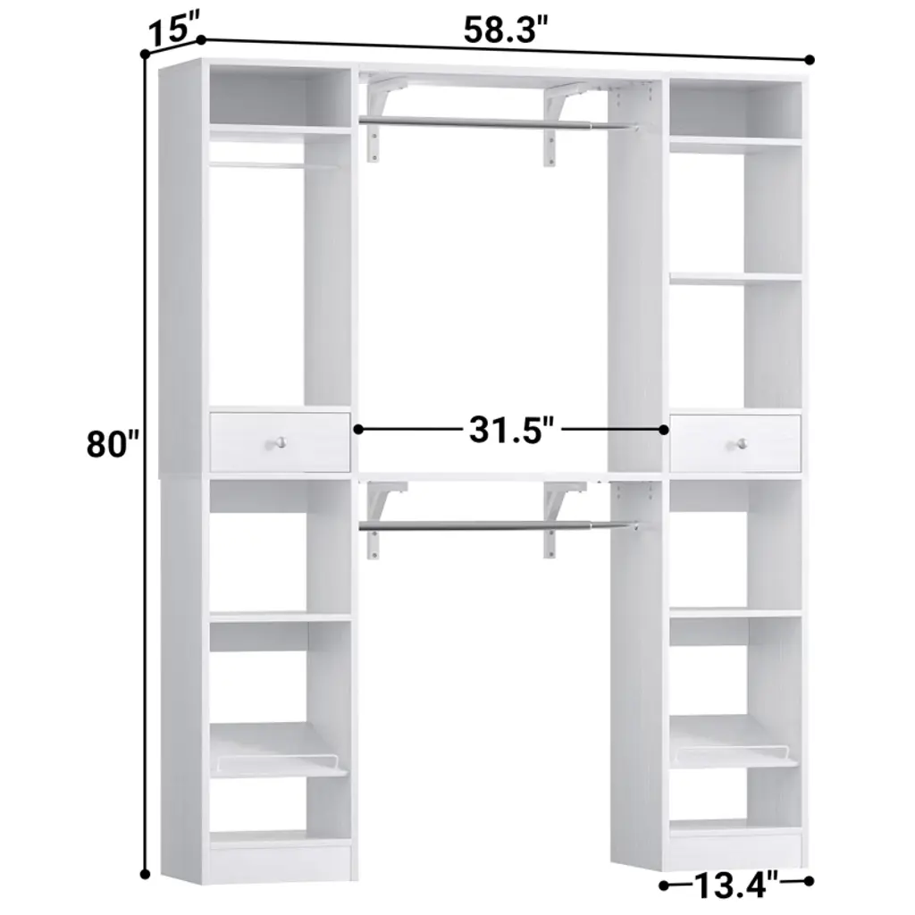 This closet system is thoughtfully designed to maximize storage efficiency. It boasts 3 hanging rods, 11 spacious shelves, and 2 versatile drawers, providing ample space to accommodate a wide range of clothing and accessories. The generous size and diverse storage options make it an ideal solution for both children and adults. The hanging rods and shelves offer flexibility in organizing, allowing you to customize the space to suit your needs. Whether you want to save space, hang more clothes, or adapt to the size of your home, this closet system is the perfect choice for optimizing your storage solutions.