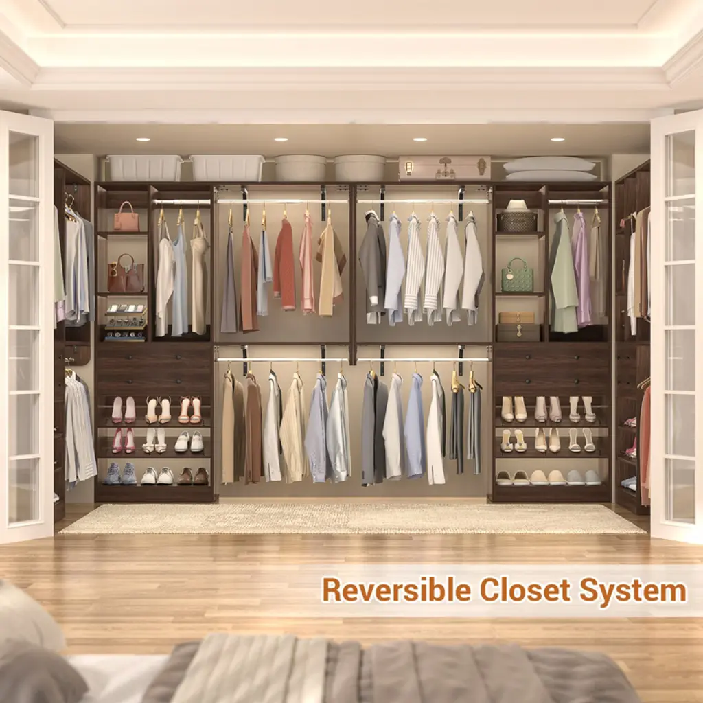 The Efficiency and Elegance Closet System is a stylish and functional solution designed to maximize your storage space while maintaining a clean, modern look. This contemporary walk-in closet wardrobe is ideal for anyone seeking to create a stylish and organized storage space. With features like large storage drawers, adjustable shelves, and sturdy hanging rods, this system offers versatile storage options that meet all your needs. Whether you have a small closet or a large walk-in, this system is designed to make the most of every available square inch, bringing order and style to your space.