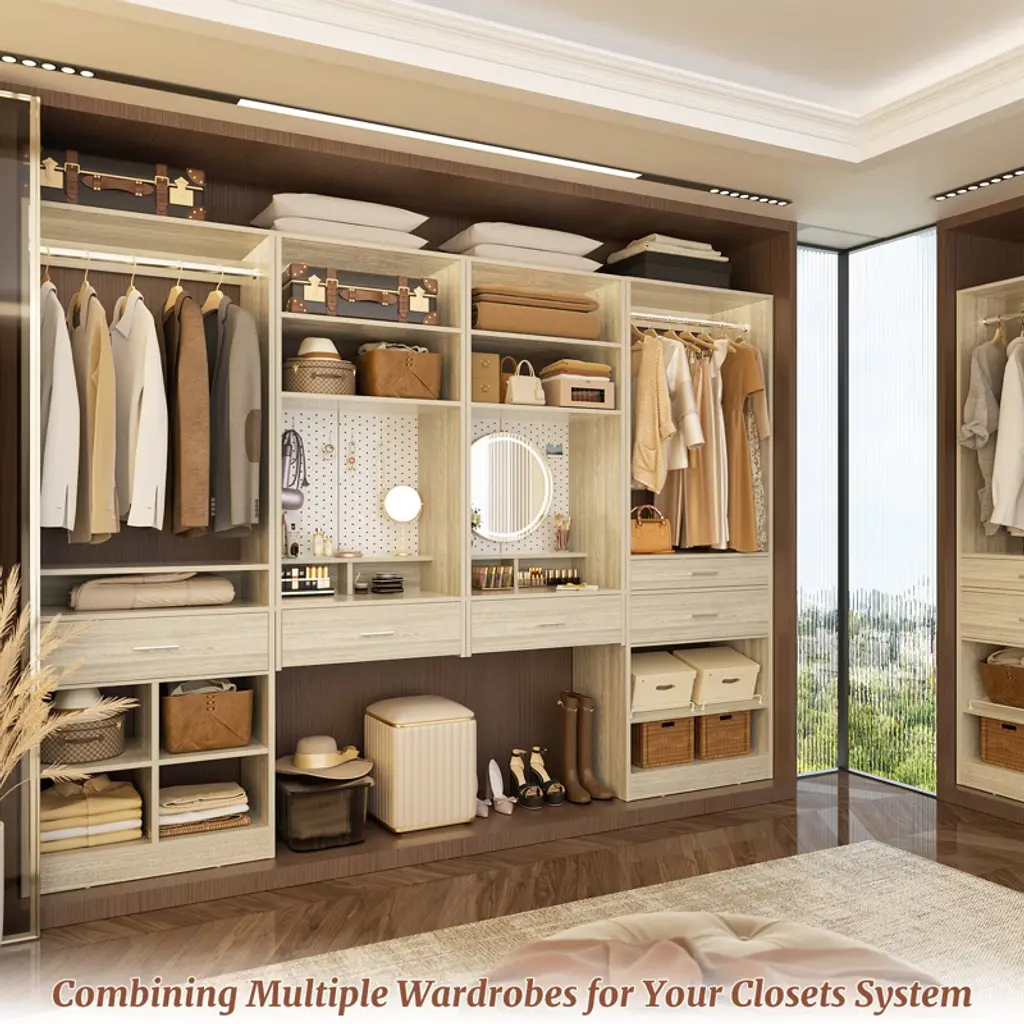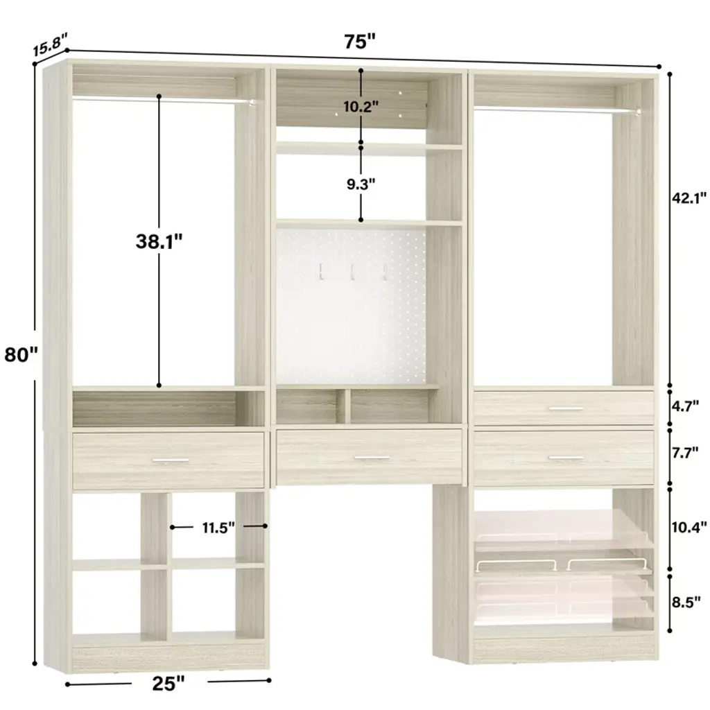 Our Closet System is not just about storage; it's about transforming your space into a more organized, efficient, and aesthetically pleasing environment. Whether you're looking to declutter your bedroom, create a home office, or simply enhance your living space, this set offers the flexibility and functionality you need. This comprehensive set includes two freestanding organizers and one wall-mounted unit, each measuring 25 inches in width, providing a total of 75 inches of storage space. With a depth of 15.8 inches and a height reaching up to 80 inches, these organizers are not just spacious but also designed to fit seamlessly into any room in your home. With a weight capacity of over 1800 lbs, you can trust that your belongings are safe and secure. Included: One freestanding closet organizer with an adjustable shoe rack One freestanding closet organizer with storage cubes One wall-mounted floating closet organizer with pegboard Size: 75'' W * 15.8'' D * 80'' H (Each organizer is 25'' W) Weight Capacity: 1800+lbs