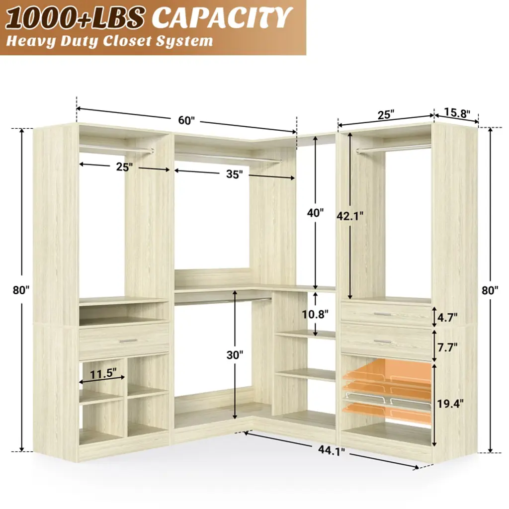 Is your home in need of a storage solution that not only organizes your belongings but also saves space? Our Space-Saving Closet System is designed to do just that, offering a blend of style, functionality, and adaptability that fits seamlessly into any room. Available in two configurations—an L-Shape (85" W x 35" D x 80" H) and a V-Shape (60" W x 60" D x 80" H)—to suit different room layouts, this closet set is perfect for maximizing your space while keeping everything in order. With a weight capacity of over 2000 lbs, you can trust that your belongings are safe and secure. The space-saving design ensures that you're making the most of every inch of your home, whether you're living in a small apartment or a spacious house. Included: One freestanding closet organizer with an adjustable shoe rack One freestanding closet organizer with storage cubes One wall-mounted floating closet organizer with pegboard L-Shape Size: 85'' W * 35'' D * 80'' H V-Shape Size: 60'' W * 60'' D * 80'' H Weight Capacity: 2000+lbs