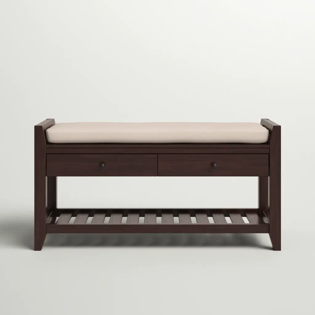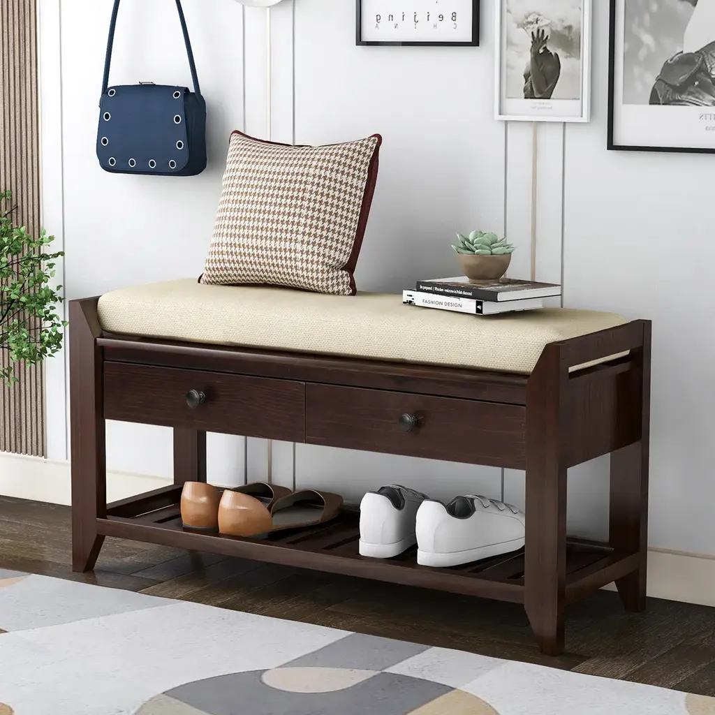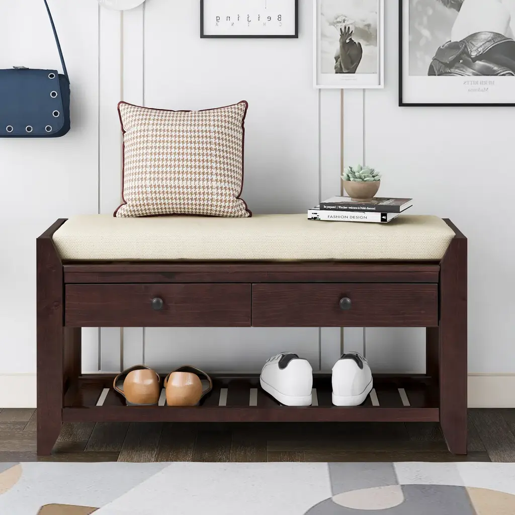 About This Product This entryway bench greets you upon your return home, inviting you to sit down, take your shoes off, and relax. Made from solid pine wood, this bench has two drawers in addition to its gridded shoe shelf, so you have a place to store out-the-door essentials like umbrellas, grocery tote bags, or sunglasses. The cushion is removable and has a removable cover in a washable polyester blend. We love the way that this bench’s simple design brings a laid-back feel to your foyer, and makes it easy to be just a little more organized. Features The carefully crafted silhouette emphasizes classic details, including tapered legs and a gridded base shoe rack with dual upper storage drawers fitted with matte black powder-coated knobs. Ideal for family use,this classic bench functions as the perfect inconspicuous storage option to tastefully store your personal belongings rather than leaving them out in the open and accumulating clutter. Two spacious sliding drawers sit directly underneath the upper bench seating area giving you easy access to sandals, kids'shoes and more while the underside gridded rack can hold additional shoes or storage baskets to add your own personal touch. Spacious seating area fitted with a soft, beige cushion for comfort and style. Ideal for family use,this classic bench functions as the perfect inconspicuous storage option to tastefully store your personal belongings. Two spacious sliding drawers sit directly underneath the upper bench seating area giving you easy access while the underside gridded rack can hold additional shoes or storage baskets With a spacious upper seating deck, it is fitted perfectly with a soft beige cushion that can be further customized with decorative throw pillows.With 5 colors to choose from. The carefully crafted silhouette emphasizes classic details, including tapered legs and a gridded base shoe rack with dual upper storage drawers fitted with matte black powder coated knobs. Functional & Compact: This bench proves to be more than an eye-catching accent piece and is manufactured to pull its weight with its heightened functionality. With a spacious upper seating deck, it is fitted perfectly with a soft beige cushion that can be further customized with decorative throw pillows. Comfortable sit down and take your time while you put on your or your child’s shoes instead of uncomfortably crouching at the front door. Add a touch of organic essence to your abode with this wooden storage bench. The taupe slightly weathered natural wooden finish adds the perfect understated accent to any home, blending in seamlessly with any surrounding décor with 5 shades to choose from. The carefully crafted silhouette emphasizes classic details, including tapered legs and a gridded base shoe rack with dual upper storage drawers fitted with matte black powder coated knobs. Two spacious sliding drawers for convenient storage. Versatile Storage Solutions: This bench features two sliding drawers and a gridded shoe rack, providing easy access to footwear and space for storage baskets. It helps keep your entryway tidy and free from clutter. This bench is outfitted with two arm handles for easy mobility Two spacious sliding drawers sit directly underneath the upper bench seating area giving you easy access to sandals, kids’ shoes, and more. This bench proves to be more than an eye-catching accent piece and is manufactured to pull its weight with its heightened functionality. With a spacious upper seating deck, it is fitted perfectly with a soft beige cushion that can be further customized with decorative throw pillows. Comfortable sit down and take your time while you put on you or your child's shoes instead of uncomfortably crouching at the front door. Compact in design this piece also makes a big impact with a small foot print. Two easily accessible sliding drawers for storage of everyday items like shoes and accessories. Add a touch of organic essence to your abode with this wooden storage bench. The taupe slightly weathered natural wooden finish adds the perfect understated accent to any home, blending in seamlessly with any surrounding décor with 5 shades to choose from. The carefully crafted silhouette emphasizes classic details, including tapered legs and a gridded base shoe rack with dual upper storage drawers fitted with matte black powder coated knobs. Ideal for family use, this classic bench functions as the perfect inconspicuous storage option to tastefully store your personal belongings rather than leaving them out in the open and accumulating clutter. Two spacious sliding drawers sit directly underneath the upper bench seating area giving you easy access to sandals, kids’ shoes, and more while the underside gridded rack can hold additional shoes or storage baskets to add your own personal touch. Durable construction using pine wood and medium-density fiberboard. Comfortable Seating Area: The spacious upper seat is fitted with a soft beige cushion, perfect for sitting comfortably while putting on shoes. Add decorative throw pillows to customize the bench and enhance your entryway’s style. Solidly constructed from quality pine wood top, ensuring durability and long-term use. This bench is manufactured with a premium build compared to competitors. Constructed with thick slabs of pine wood, it has the durability to effortlessly withstand daily use from you and your family and become a household stable. Smoothed and polished to perfection, the wood build is sealed with a protective wood coating this bench is designed to resist humidity while also making it easy to spot clean for dust. Built in handles make it easy to transfer from one place to another. 【Details】★Material:Pine wood top, bottom shelf and legs;MDF drawers ★Weight Capacity:Top shelf: 220 LBS; Bottom shelf: 66 LBS; Drawer: 17 LBS ★Drawer Interior Dimensions:15.3"L x 9.5"W x 1.9"H ★Finish:Distressed finish ★Finished Back:Yes ★Package Number:1 ★Assembly Requi