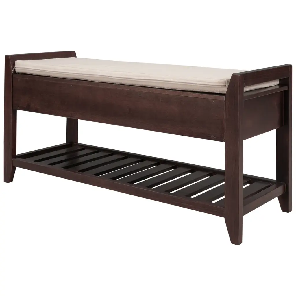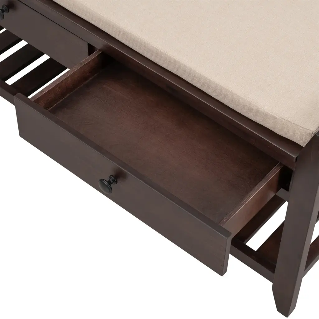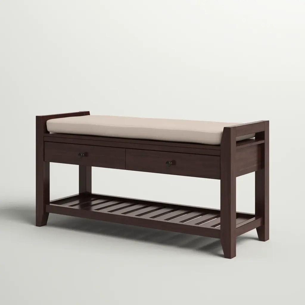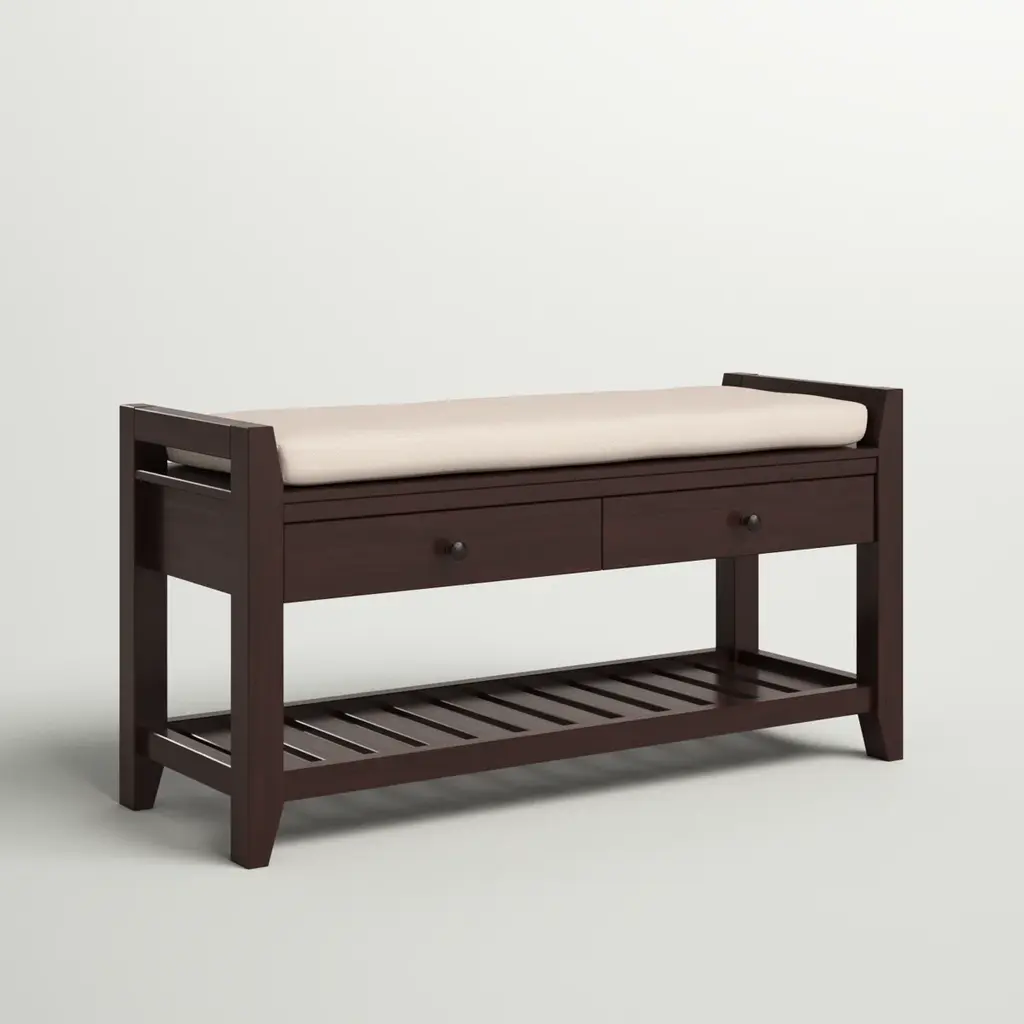 About This Product This entryway bench greets you upon your return home, inviting you to sit down, take your shoes off, and relax. Made from solid pine wood, this bench has two drawers in addition to its gridded shoe shelf, so you have a place to store out-the-door essentials like umbrellas, grocery tote bags, or sunglasses. The cushion is removable and has a removable cover in a washable polyester blend. We love the way that this bench’s simple design brings a laid-back feel to your foyer, and makes it easy to be just a little more organized. Features The carefully crafted silhouette emphasizes classic details, including tapered legs and a gridded base shoe rack with dual upper storage drawers fitted with matte black powder-coated knobs. Ideal for family use,this classic bench functions as the perfect inconspicuous storage option to tastefully store your personal belongings rather than leaving them out in the open and accumulating clutter. Two spacious sliding drawers sit directly underneath the upper bench seating area giving you easy access to sandals, kids'shoes and more while the underside gridded rack can hold additional shoes or storage baskets to add your own personal touch. Spacious seating area fitted with a soft, beige cushion for comfort and style. Ideal for family use,this classic bench functions as the perfect inconspicuous storage option to tastefully store your personal belongings. Two spacious sliding drawers sit directly underneath the upper bench seating area giving you easy access while the underside gridded rack can hold additional shoes or storage baskets With a spacious upper seating deck, it is fitted perfectly with a soft beige cushion that can be further customized with decorative throw pillows.With 5 colors to choose from. The carefully crafted silhouette emphasizes classic details, including tapered legs and a gridded base shoe rack with dual upper storage drawers fitted with matte black powder coated knobs. Functional & Compact: This bench proves to be more than an eye-catching accent piece and is manufactured to pull its weight with its heightened functionality. With a spacious upper seating deck, it is fitted perfectly with a soft beige cushion that can be further customized with decorative throw pillows. Comfortable sit down and take your time while you put on your or your child’s shoes instead of uncomfortably crouching at the front door. Add a touch of organic essence to your abode with this wooden storage bench. The taupe slightly weathered natural wooden finish adds the perfect understated accent to any home, blending in seamlessly with any surrounding décor with 5 shades to choose from. The carefully crafted silhouette emphasizes classic details, including tapered legs and a gridded base shoe rack with dual upper storage drawers fitted with matte black powder coated knobs. Two spacious sliding drawers for convenient storage. Versatile Storage Solutions: This bench features two sliding drawers and a gridded shoe rack, providing easy access to footwear and space for storage baskets. It helps keep your entryway tidy and free from clutter. This bench is outfitted with two arm handles for easy mobility Two spacious sliding drawers sit directly underneath the upper bench seating area giving you easy access to sandals, kids’ shoes, and more. This bench proves to be more than an eye-catching accent piece and is manufactured to pull its weight with its heightened functionality. With a spacious upper seating deck, it is fitted perfectly with a soft beige cushion that can be further customized with decorative throw pillows. Comfortable sit down and take your time while you put on you or your child's shoes instead of uncomfortably crouching at the front door. Compact in design this piece also makes a big impact with a small foot print. Two easily accessible sliding drawers for storage of everyday items like shoes and accessories. Add a touch of organic essence to your abode with this wooden storage bench. The taupe slightly weathered natural wooden finish adds the perfect understated accent to any home, blending in seamlessly with any surrounding décor with 5 shades to choose from. The carefully crafted silhouette emphasizes classic details, including tapered legs and a gridded base shoe rack with dual upper storage drawers fitted with matte black powder coated knobs. Ideal for family use, this classic bench functions as the perfect inconspicuous storage option to tastefully store your personal belongings rather than leaving them out in the open and accumulating clutter. Two spacious sliding drawers sit directly underneath the upper bench seating area giving you easy access to sandals, kids’ shoes, and more while the underside gridded rack can hold additional shoes or storage baskets to add your own personal touch. Durable construction using pine wood and medium-density fiberboard. Comfortable Seating Area: The spacious upper seat is fitted with a soft beige cushion, perfect for sitting comfortably while putting on shoes. Add decorative throw pillows to customize the bench and enhance your entryway’s style. Solidly constructed from quality pine wood top, ensuring durability and long-term use. This bench is manufactured with a premium build compared to competitors. Constructed with thick slabs of pine wood, it has the durability to effortlessly withstand daily use from you and your family and become a household stable. Smoothed and polished to perfection, the wood build is sealed with a protective wood coating this bench is designed to resist humidity while also making it easy to spot clean for dust. Built in handles make it easy to transfer from one place to another. 【Details】★Material:Pine wood top, bottom shelf and legs;MDF drawers ★Weight Capacity:Top shelf: 220 LBS; Bottom shelf: 66 LBS; Drawer: 17 LBS ★Drawer Interior Dimensions:15.3"L x 9.5"W x 1.9"H ★Finish:Distressed finish ★Finished Back:Yes ★Package Number:1 ★Assembly Requi