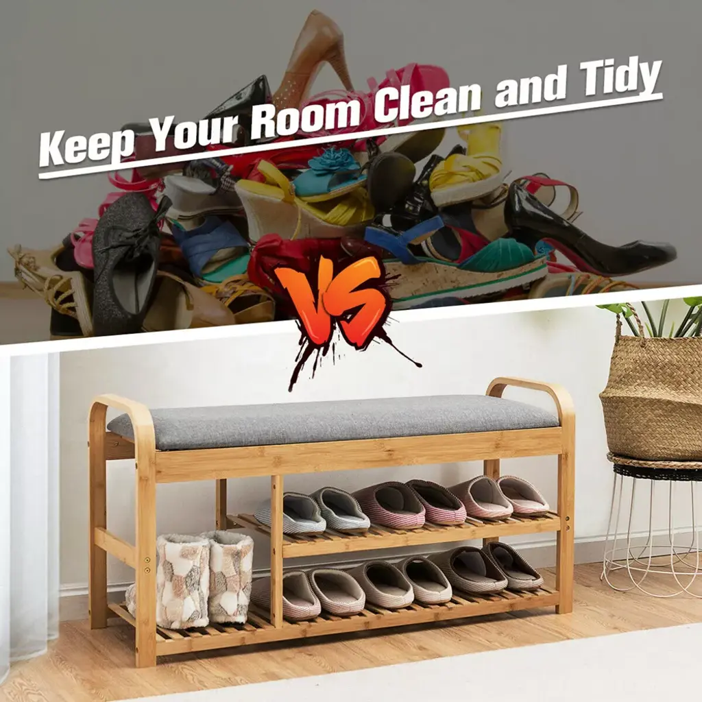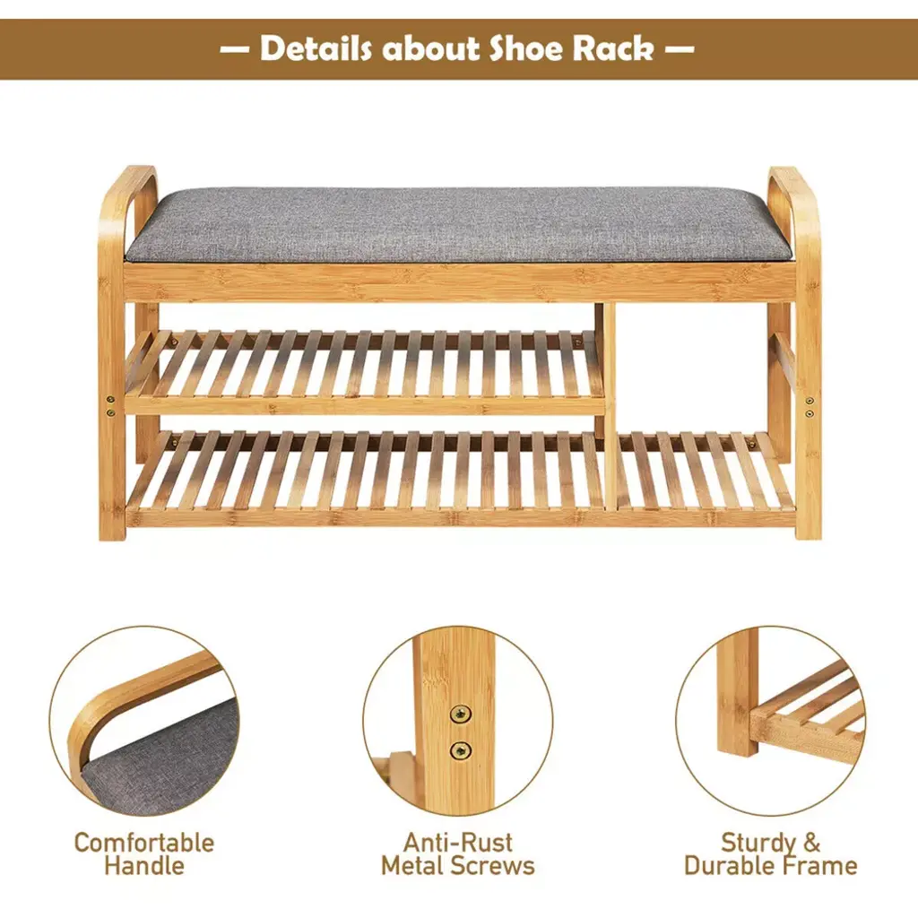 Made of premium bamboo and high-density sponge, the shoe rack with sturdy frame is perfectly combined with sponge cushion to give you extraordinary comfort. And the round corners of the bench armrests are smooth and will not harm you or your family. The size of shoe rack is 40''L x 13''W x 20''H, which allowing you to store up 7 pairs of shoes. With instructions and required accessories, the shoe rack is easy to assemble in short time. Its stylish modern appearance and ample capacity make it suitable for a variety of occasions.FeaturesPremium bamboo frame ensures firmness and wear-resistant Three layers of shoe rack with two different heights Thick and comfortable seat for 2 people sitting together Ergonomic height adds a convenient seat to the shoe rack Two handles help you to move the bench easily Easy to assemble according the instructionsColor: Natural and Grey Material: Bamboo, MDF, Sponge, Linen Cloth Overall Dimension: 40''L x 13''W x 20''H Product Weight: 15 lbs Weight Capacity: 330 lbs Package include: 1 x Shoe Rack 1 x Instructions