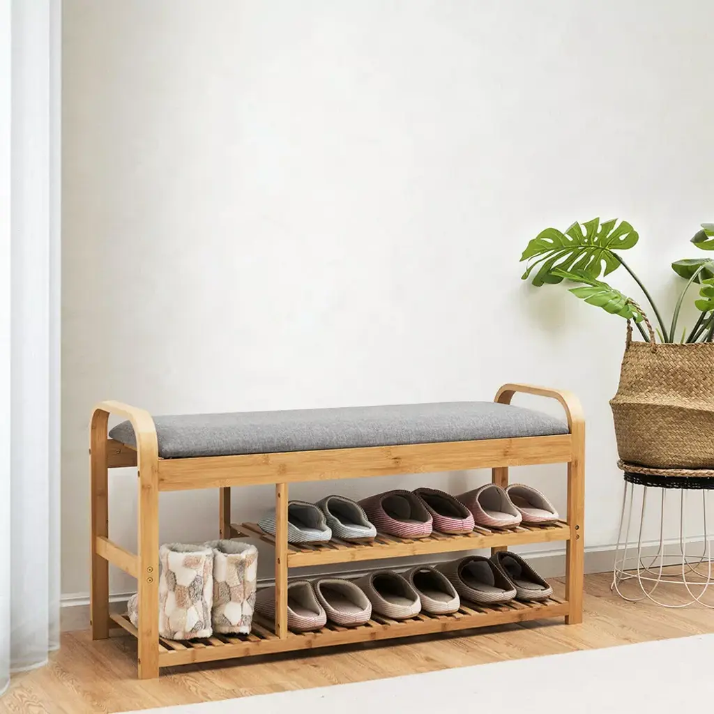 Costway Shoe Rack Entryway 3-tier Bamboo Shoe Bench Organizer W/cushion Modern Stool