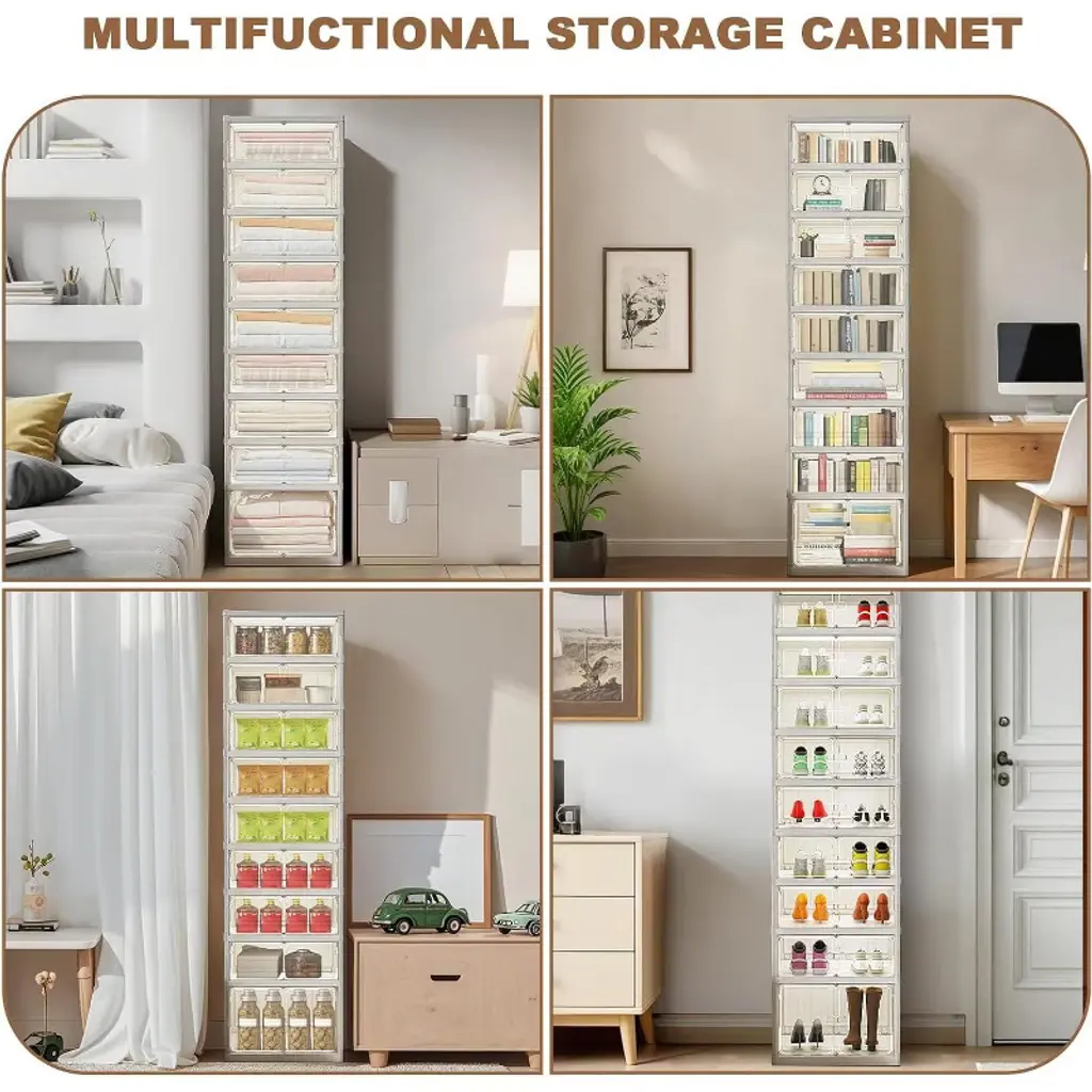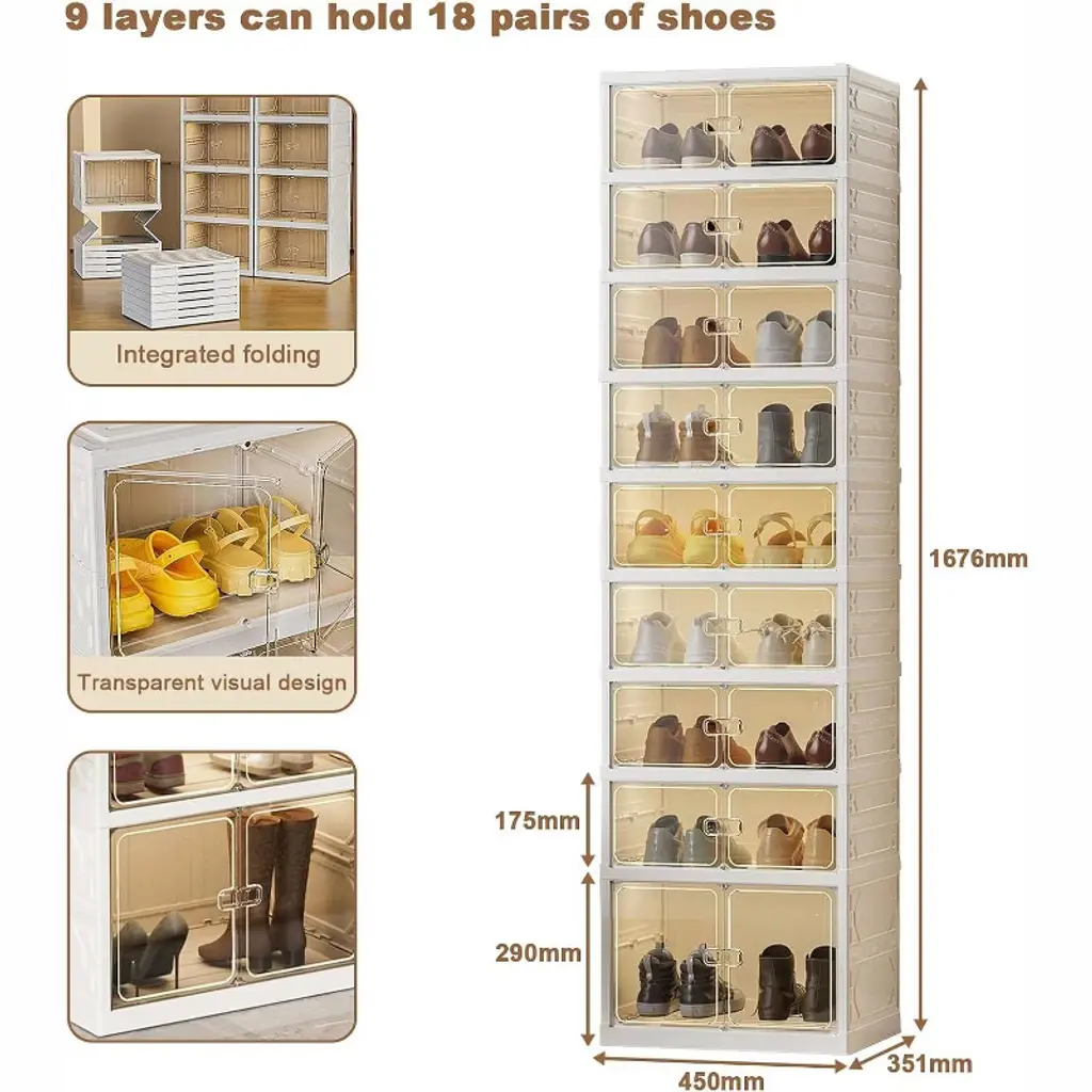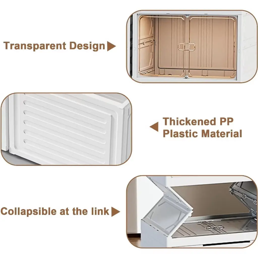 Contenitore multifunzionale: la scatola pieghevole per scarpe non è limitata alla conservazione delle scarpe. È stato progettato per soddisfare le più diverse esigenze di archiviazione. Può contenere Non Solo Una Varietà Di Tipi Di Scarpe Da Uomo E Donna, Comprese Scarpe Sportive, Suole Piatte, Tacchi Alti, Ecc. Inoltre, può essere utilizzato per conservare oggetti quotidiani come libri, giocattoli, cosmetici, snack, articoli da toeletta e oggetti da collezione. Le scatole trasparenti per scarpe possono essere impilate: le porte magnetiche trasparenti facilitano la rimozione delle scarpe e allo stesso tempo impediscono la polvere, per garantire che l'interno del portascarpe sia pulito e ordinato. L'apertura di ventilazione è stata progettata per favorire la circolazione dell'aria e prevenire gli odori. Design impilabile, facile da piegare, conservare o trasportare, adatto per una varietà di scenari, sia in camera da letto, soggiorno, camera da letto, soggiorno, camera da letto, camera da letto, camera da letto, camera da letto, soffitta