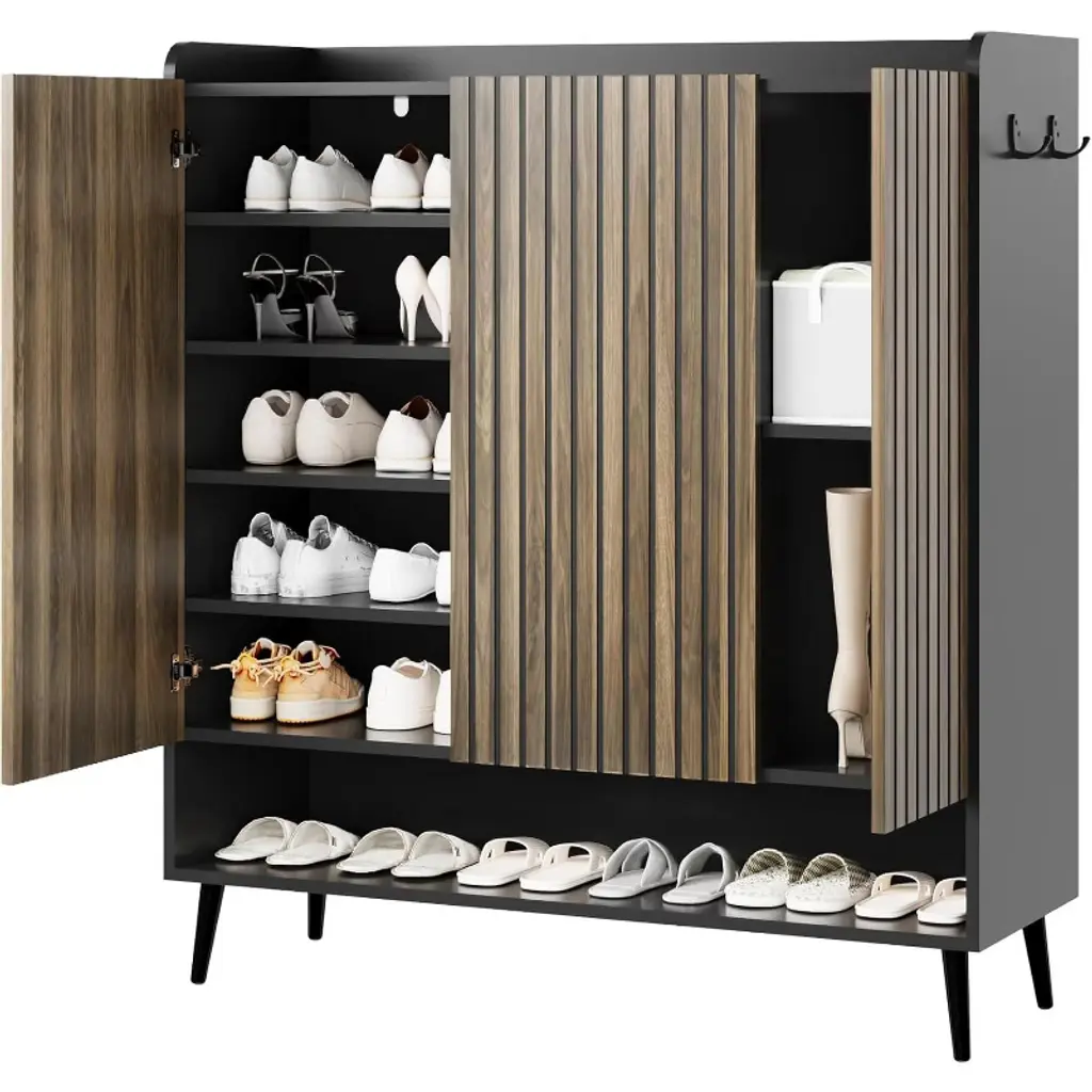 Transform your entryway organization with the COZONY 4-Door Shoe Cabinet, designed to provide sophisticated storage solutions for modern homes. This spacious cabinet features three convenient doors that open to reveal multiple tiers of organized storage, including sections for different footwear types. The contemporary handleless design with raised door edges creates a seamless aesthetic that complements minimalist interiors while ensuring easy access to your belongings. Integrated metal hooks on the sides offer practical storage for keys, bags, and everyday essentials, keeping your entryway clutter-free. Safety-rounded corners provide protection in busy households, making this cabinet ideal for families with children and pets. Crafted from durable materials with sturdy construction, this freestanding unit delivers reliable performance while maintaining a sleek profile that enhances your living space.