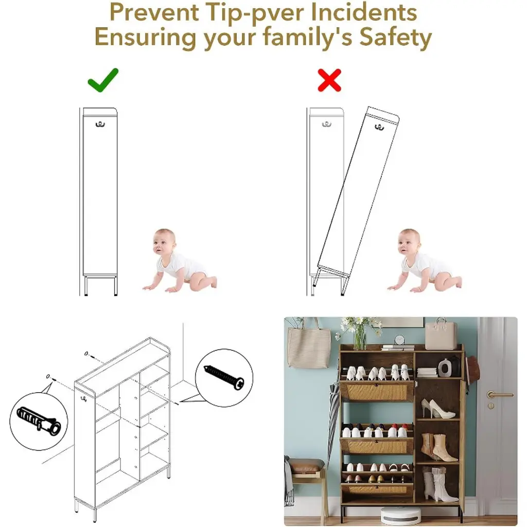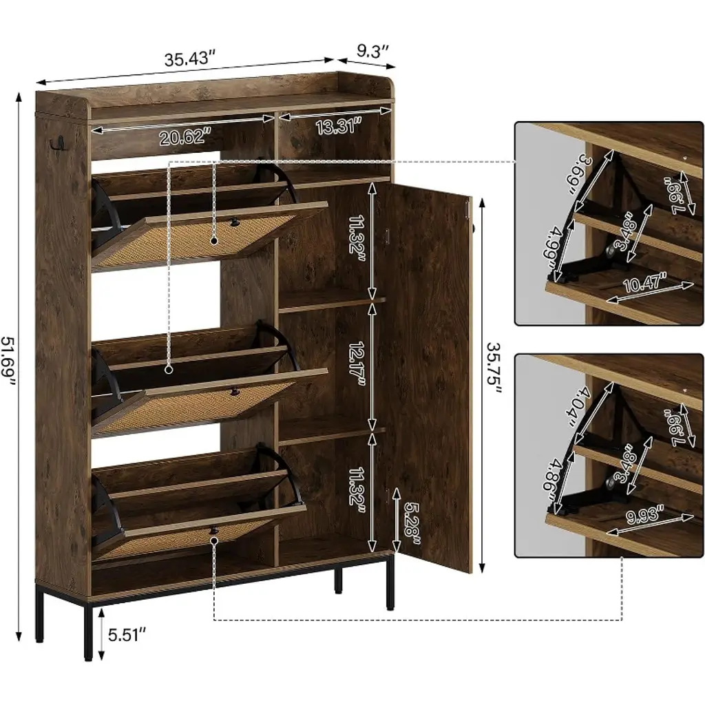 Cuisinsmart 3 Tier Free Standing Shoe Cabinet With Natural Rattan, Shoe Organizer With Adjustable Shelves, Narrow Shoe Rack For Hallway, Pomegranate