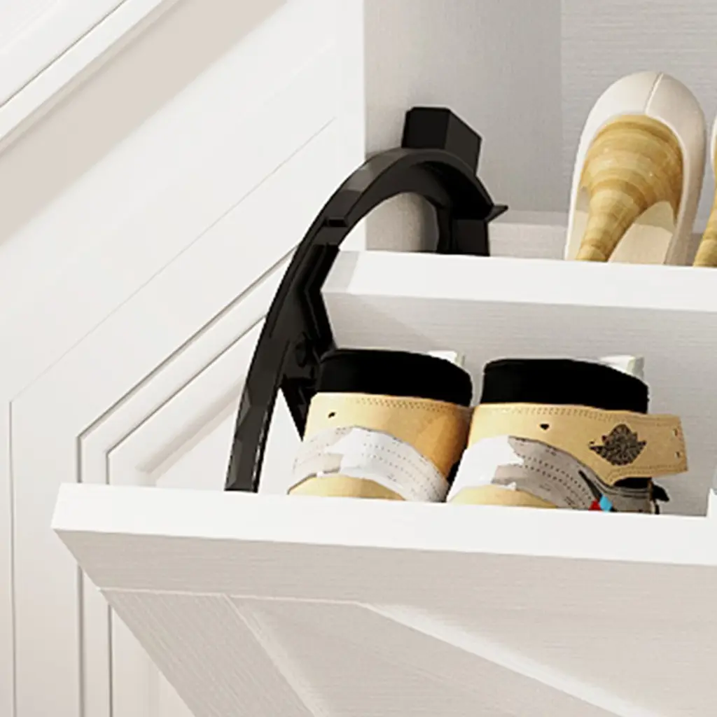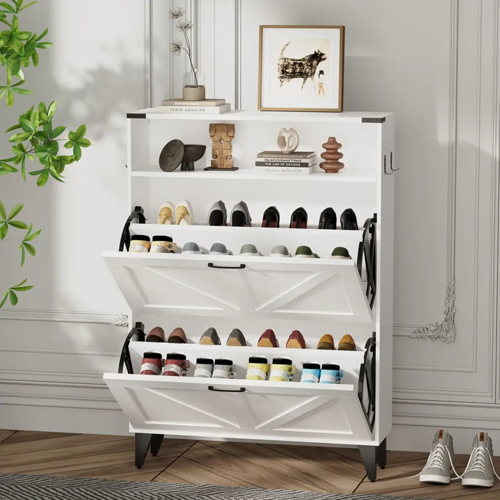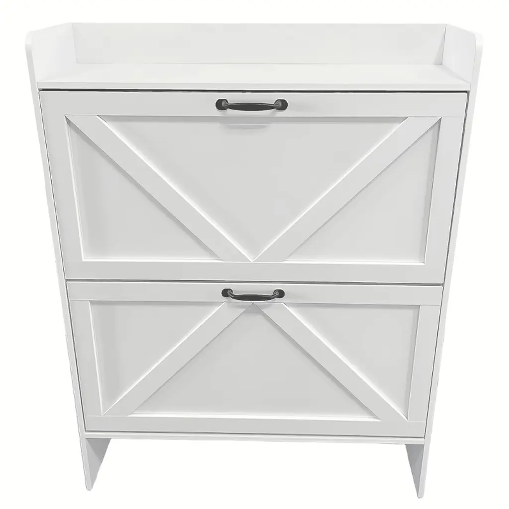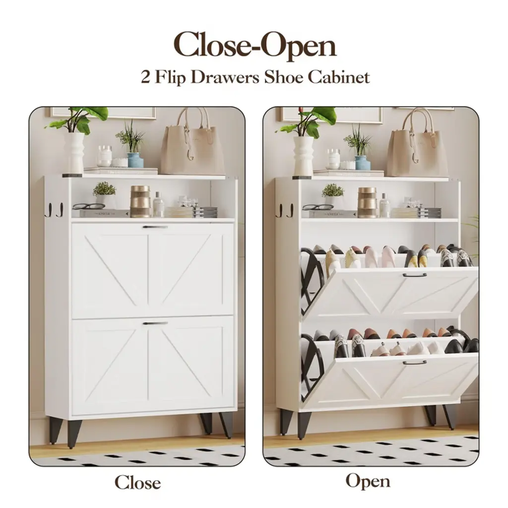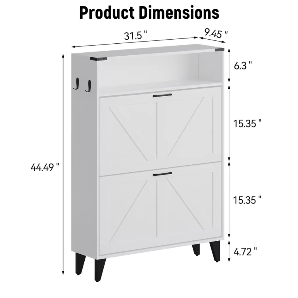 This freestanding shoe organizer is designed with two convenient flip drawers and an open storage shelf, making it ideal for any foyer, entryway, or front door entrance. Say goodbye to cluttered floors and welcome a tidy, welcoming space with this sleek and stylish cabinet!Feature:The shoe cabinet features a farmhouse-inspired design that seamlessly blends with a variety of decor styles. While designed primarily as a shoe storage cabinet, its versatility allows it to serve multiple purposes. Designed with a narrow feature, this shoe organizer is perfect for small spaces.Stay organized with the shoe rack cabinet, featuring two flip drawers that provide ample space for your shoes.Specification:Color: WhiteMaterial: Particle BoardFull Size: 31.5''×9.45''×44.49''Open Shelf Size: 31.5''×9.45''×6.3''Each Flip Drawer Height: 15.35''Leg Height: 4.72''Packing list: Shoe Storage Cabinet with 2 Flip Drawers(including instruction manual and accessories)Note:Carefully follow the installation instructions when assembling the cabinet. Before beginning the installation process, ensure that you have all the parts and tools you need.Before making a purchase, consider factors like height, width, and depth to ensure the size of the item you are considering fits your need.