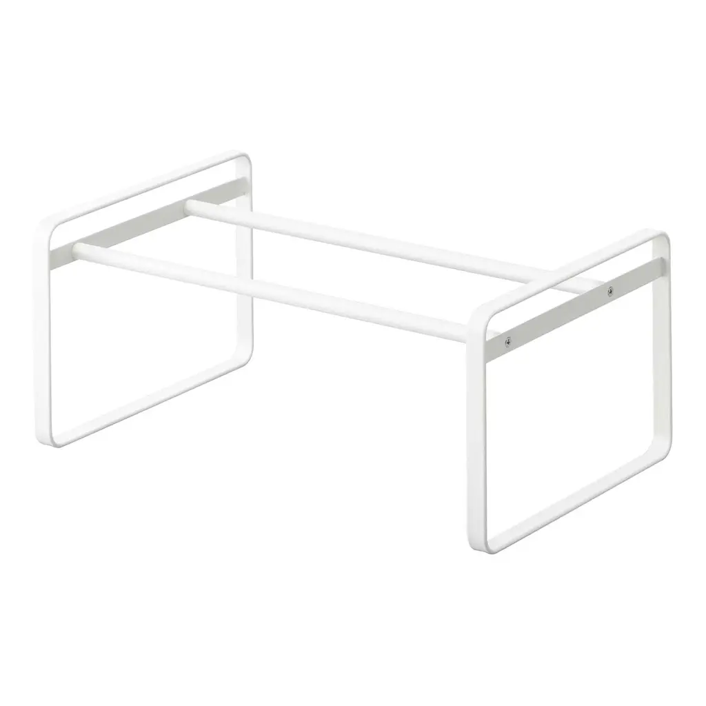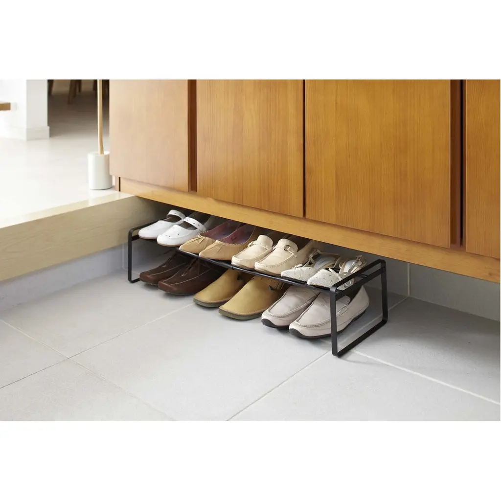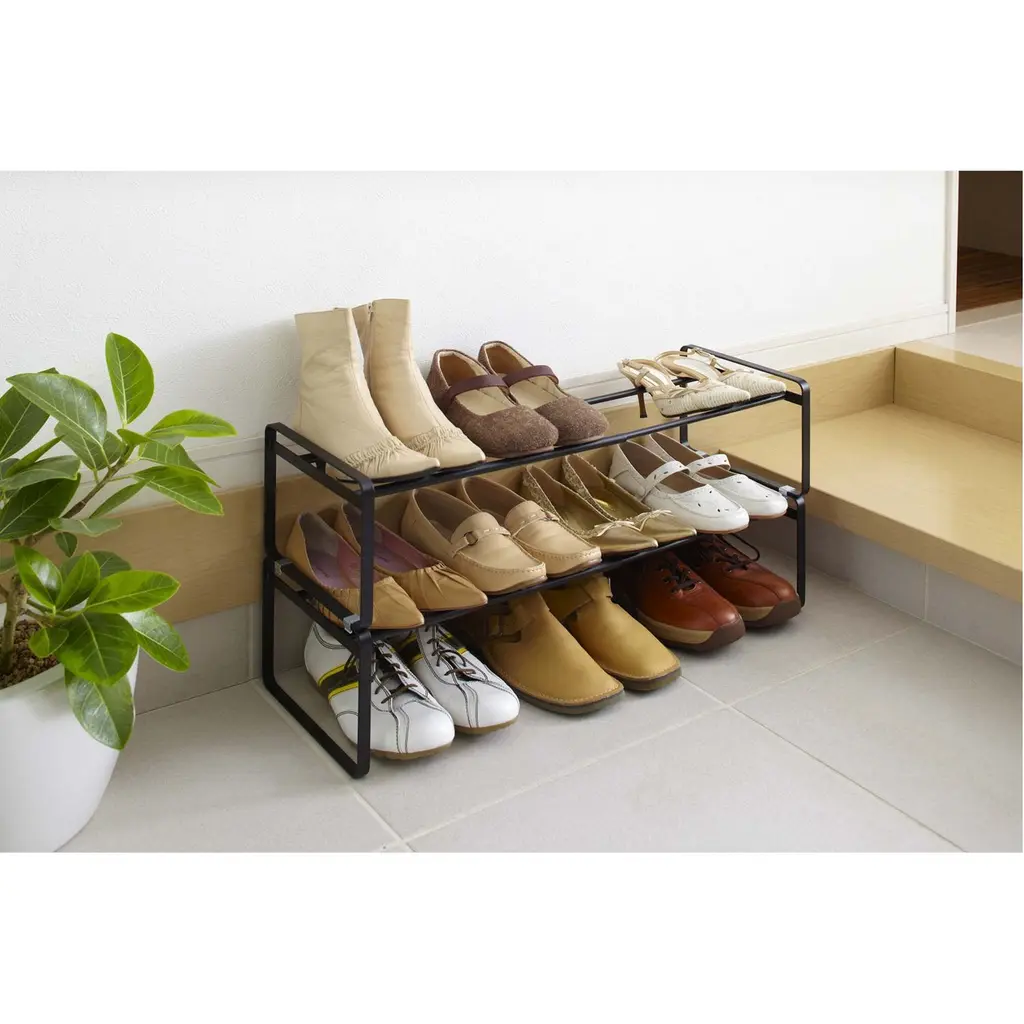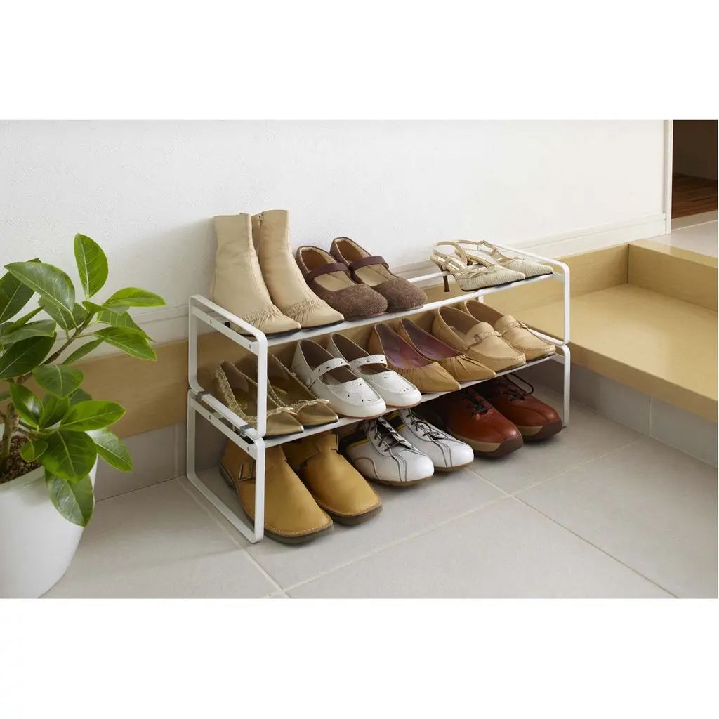 An open steel frame makes for an attractive, modern shoe organizer aesthetic. This simply designed shoe rack is stackable to ensure maximum capacity. Expandable length to perfectly fit the needs of your space.Each rack holds up to six pairs of shoes. Stack them on top of each other to double or triple shoe storage space. Steel clips keep the frames securely in place.Everyone's home is unique, which is why this shoe-rack was designed to be adaptable. This simply designed shoe rack is stackable to ensure maximum capacity, and expandable to fit spaces both wide and narrow. Make this shoe rack work for your space, not the other way around. Each rack holds up to four pairs of shoes.Dimensions + DetailsMaterials: SteelDimensions: L 9.8 x W 27.6 x H 6.9 inchesProduct Weight: 2 lbs.Load-bearing weight: Tiers: 6.6 lbs.Assembly: RequiredHardware + Tools: ProvidedDesigned in JapanManufactured in ChinaYamazaki brings thought and creativity to everyday items through design inspired by life in Japan. Life in Japan, and any city, leaves residents short on space.Yamazaki products are not only decorative, but functional. Organization, storage, and saving space are the points of focus in all of Yamazaki's design. The brand's mission is to continually develop new products to improve the quality of everyday life.ワクワクする心に従い行動する。We always welcome a challenge.We don't believe in staying the way we are.We were born in order to change.