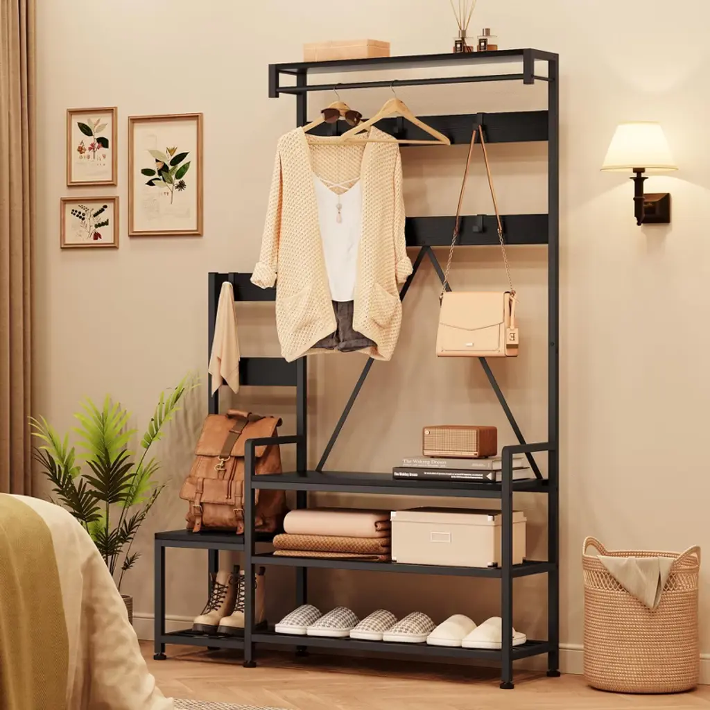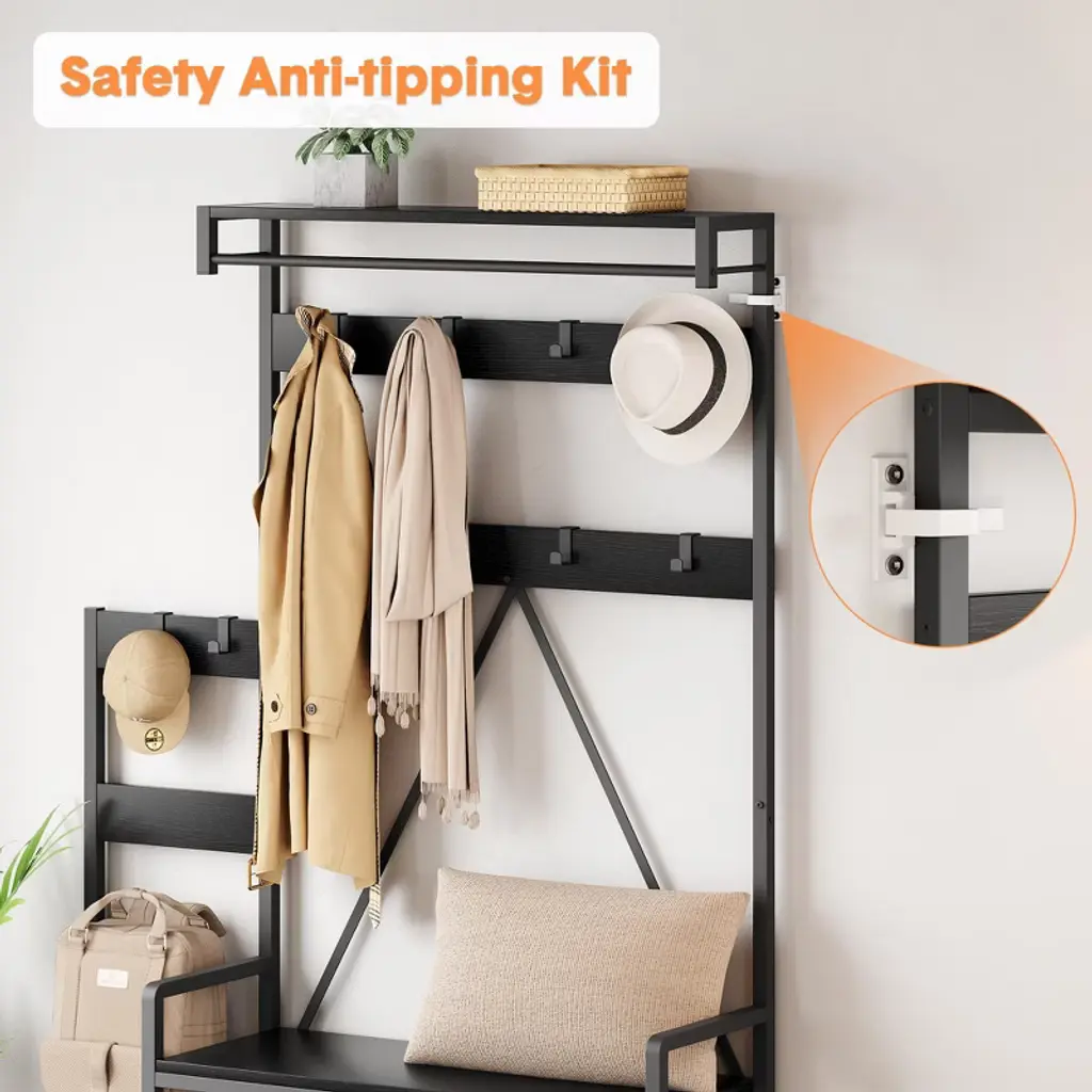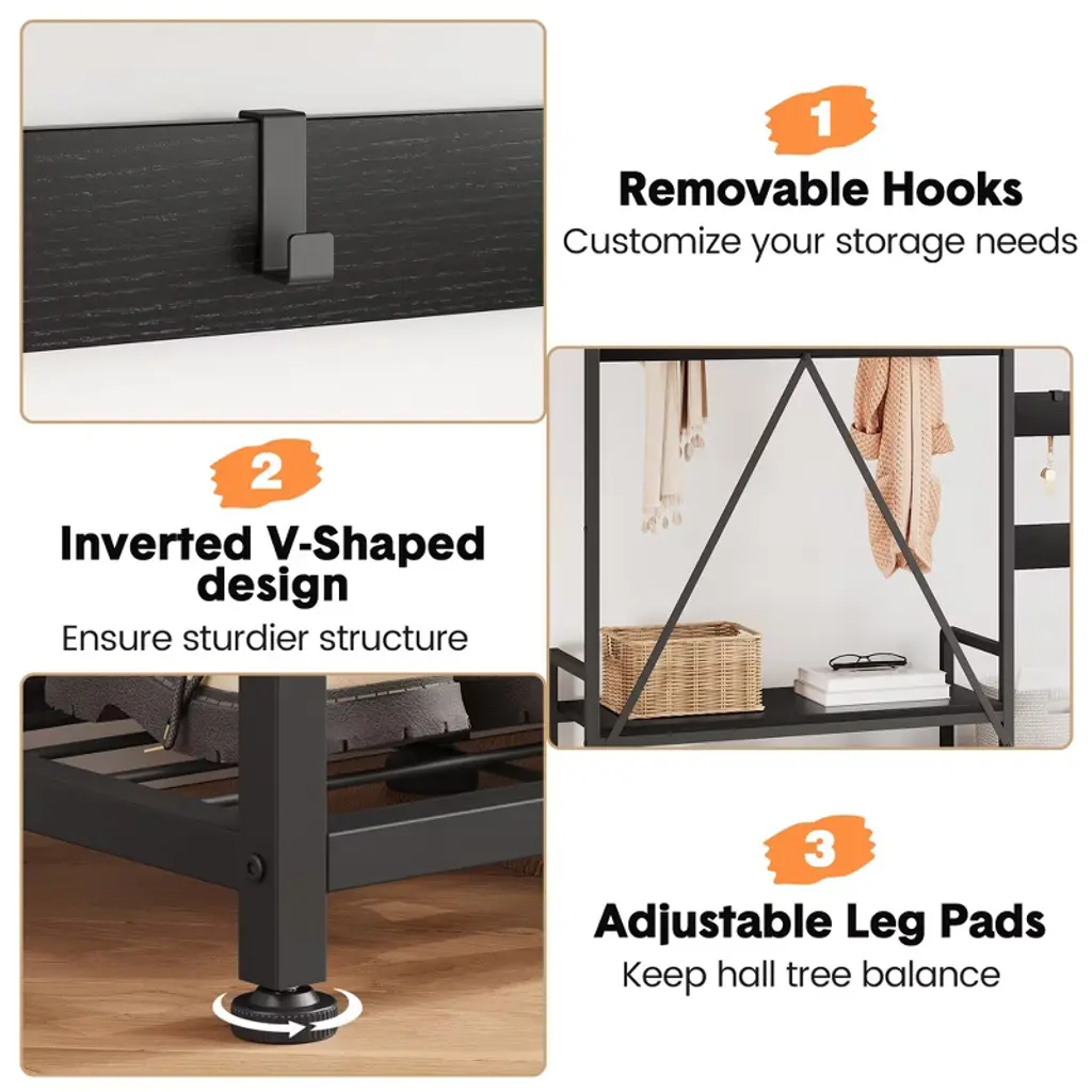 Thanks to the high-density MDF board and well-structured metal frame design, this coat rack shoe bench can withstand the challenge of long-term use. What's more, the sturdy Inverted V-shaped support and anti-tipping straps enhance the security and stability of this hall tree to hold up to 300 pounds. adjustable feet can keep the unit level on uneven flooring and protect the ground from scratches. This Industrial hall tree combines coat hooks, a hanging bar, a bench, a shoe rack, and storage shelves to provide a comprehensive and stylish space-saving solution that meets your different storage or display needs and keeps your entryway clutter-free and your outerwear and footwear neatly organized.