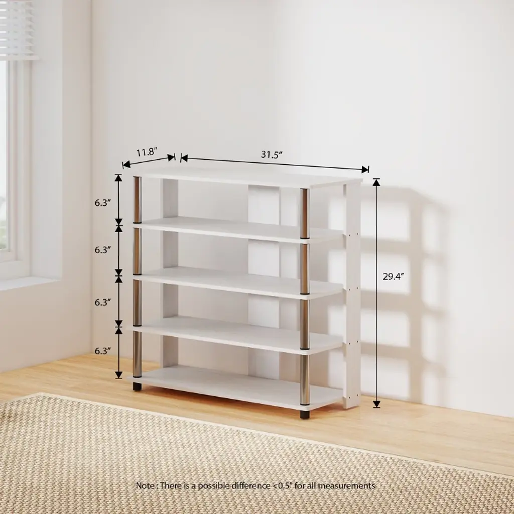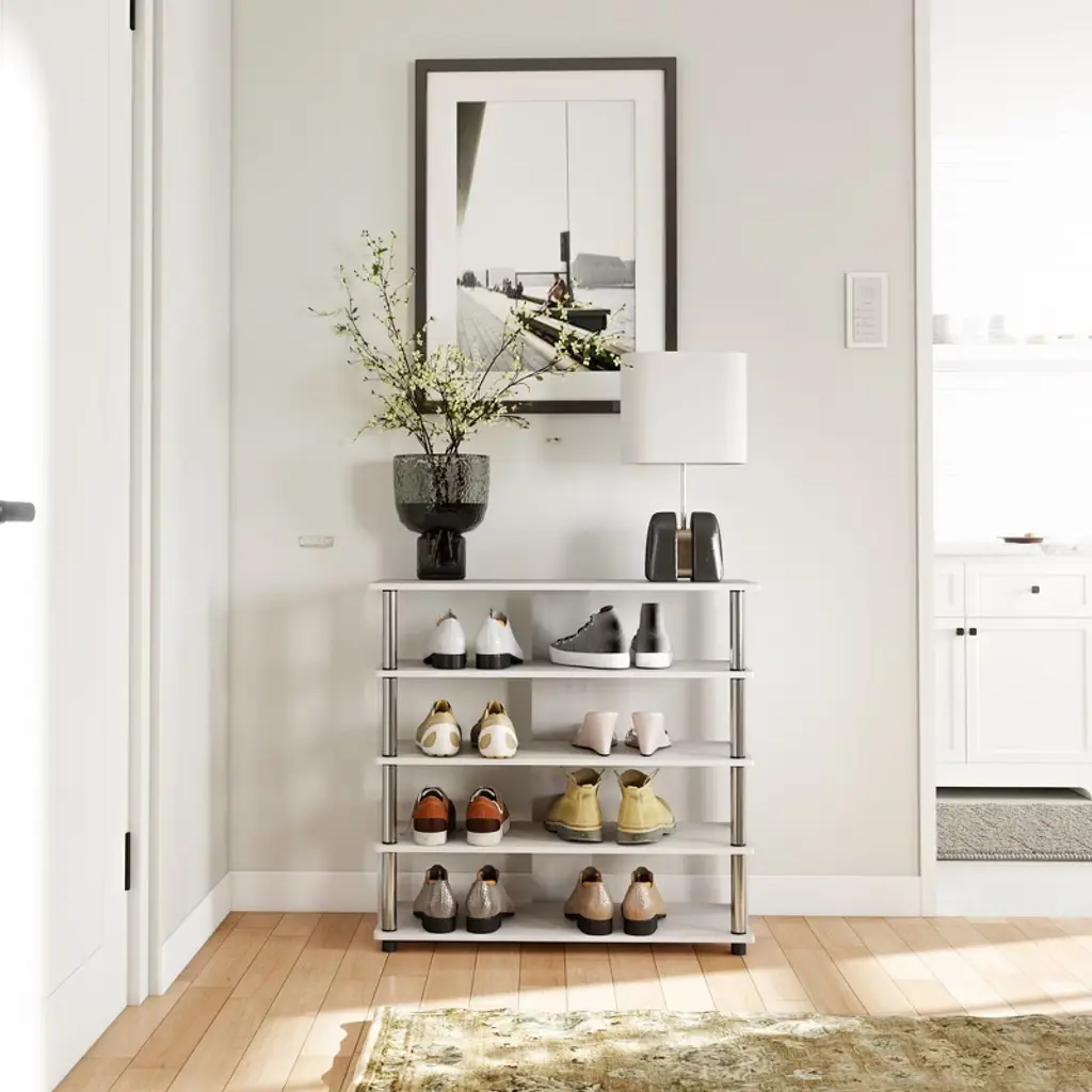 Keep your space neat and stylish with this 5-tier shoe rack from HOMLUX. Designed to hold up to 12 pairs of shoes, it’s perfect for entryways, closets, or mudrooms. Made with durable composite wood and sturdy stainless steel tubes, it offers lasting support and stability. The open-shelf design makes it easy to access your footwear, while the tool-free assembly ensures a quick, hassle-free setup.