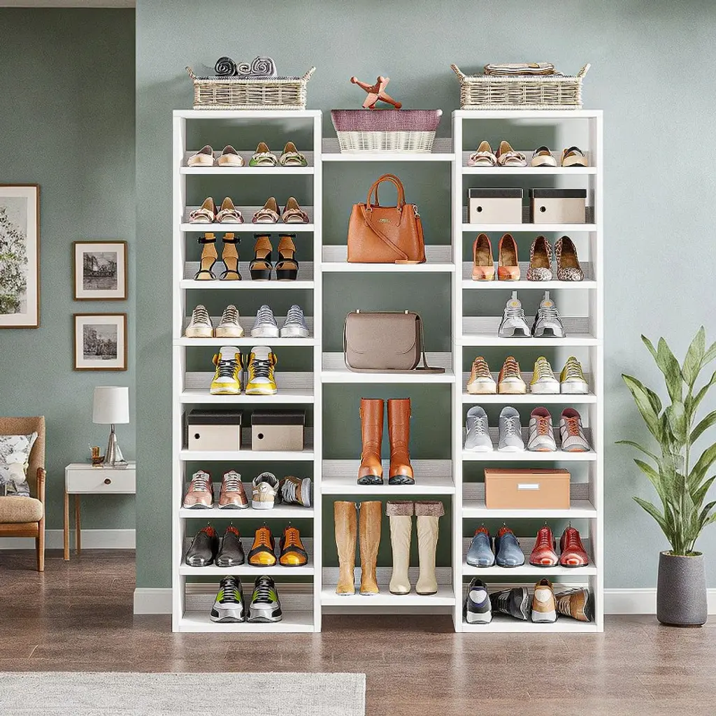 Its modern minimalist design, featuring waterproof and wear-resistant white paint, complements any room decor seamlessly. Perfect for entryways, bedrooms, hallways, living rooms, or closets, this shoe rack not only keeps your shoes organized but also adds a touch of elegance to your home.