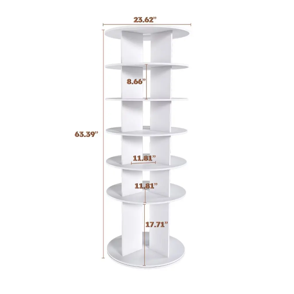 Make your shoes neat and organized with this rotating shoe rack tower lazy susan; The space saving design can hold up many shoes or bags in a compact space; SIZE: 23.7"W x 23.7"D x 63.39"H