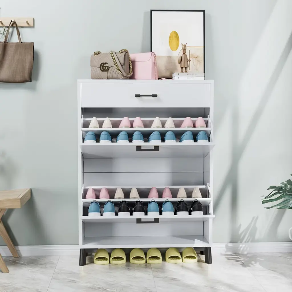 This wooden concealed shoe cabinet features two flip-top drawers, each with two tiers, each capable of holding four pairs of shoes. There's also a storage drawer perfect for car keys or other small items. This stylish and minimalist shoe cabinet is a space-saving addition, perfect for an entryway, hallway, living room, or porch.