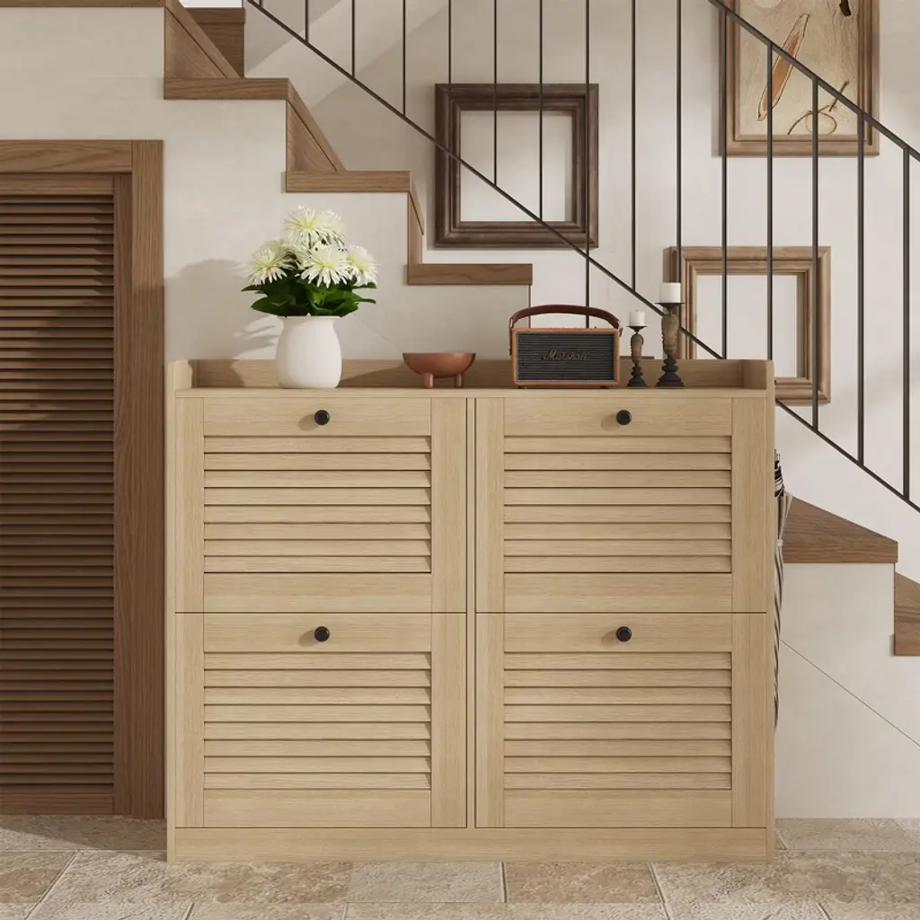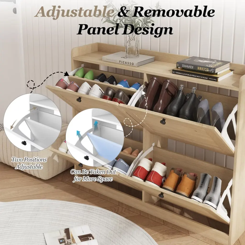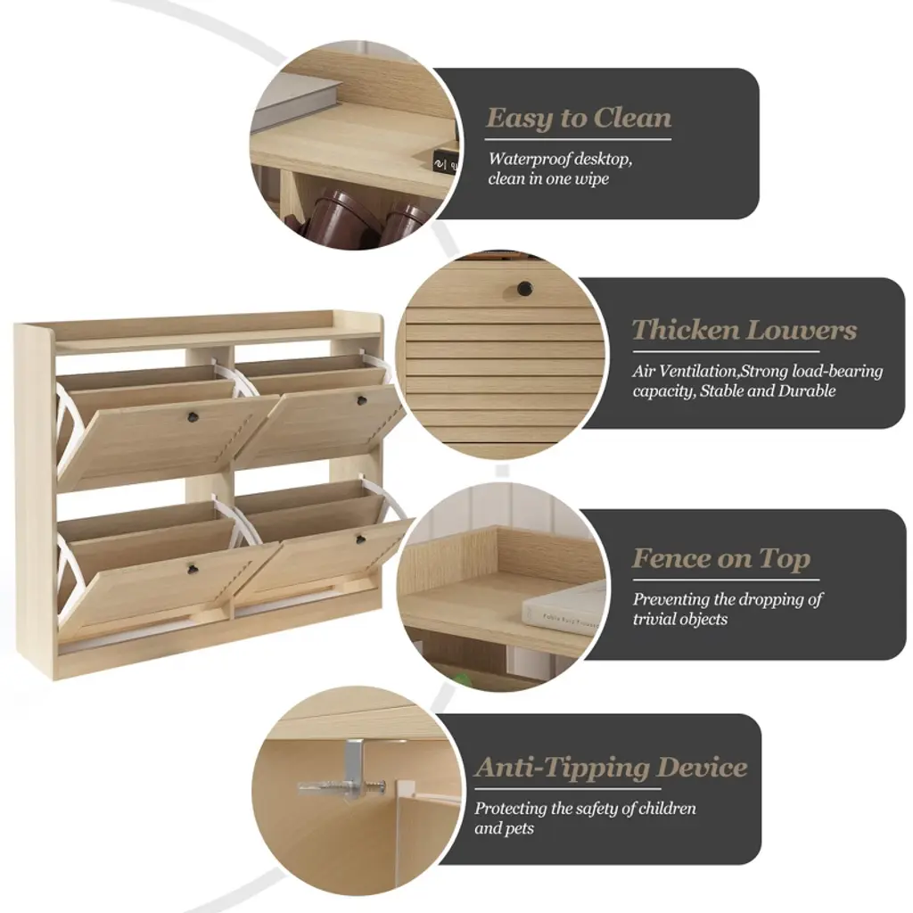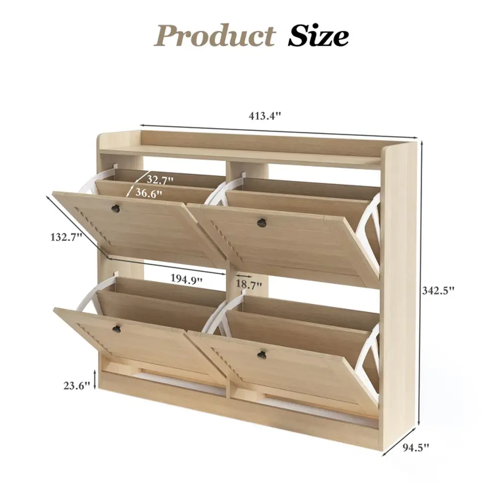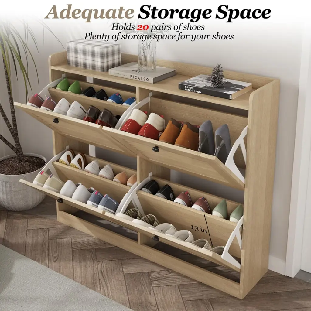 Large Shoe Storage Cabinet with Flip Doors ¨C Narrow Entryway Shoe Organizer with 4 Adjustable Shelves, Freestanding Hidden Shoe Rack for HallwayProduct Description:Space-Saving Shoe Storage Solution for Modern HomesKeep your entryway, hallway, or living room clutter-free with the TROPOW Large Shoe Storage Cabinet. Designed for small spaces, this narrow shoe organizer combines functionality with sleek aesthetics. Its flip-front drawers and adjustable shelves accommodate 24¨C32 pairs of shoes, from flats to high heels, while the white engineered wood finish blends seamlessly with any decor.Key Features:1. Maximized Storage Capacity Holds 24¨C32 pairs of shoes (exact number depends on shoe size). 4 flip-front drawers with dual-layer storage per drawer. Dimensions: 34.25"H ¡Á 41.34"W ¡Á 9.45"D ¨C fits snugly in tight spaces like entryways or apartment hallways. 2. Adjustable & Versatile Design Removable/Adjustable shelves via dual grooves to fit: Low-top sneakers or flats (standard layout). Mid-calf boots or high heels (adjust shelf height). Multi-functional top surface for keys, decor, or small potted plants. 3. Sturdy & Safe Construction Durable engineered wood with scratch-resistant, wipe-clean finish. Anti-tipping kit included for wall anchoring (child/pet safety). Freestanding design with wooden legs for stability. 4. Hassle-Free Assembly & Support Tools & instructions included ¨C two-person assembly in ~30 mins. 24-hour customer service ¨C free replacement for shipping damage. Technical Specifications:AttributeDetailsBrandTROPOWModelFlip-Door Shoe CabinetColorWhiteMaterialEngineered Wood (Chipboard)Dimensions41.34"D ¡Á 9.45"W ¡Á 34.25"HWeight52.9 lbsDrawers4 flip-front drawersShelf TypeAdjustable/Removable (2 layers per drawer)Max Load CapacitySupports full storage of shoes (exact weight limit not specified)MountingFreestanding (wall-mount anti-tip kit included)Special FeatureScratch-resistant, space-saving, narrow profileWhy Choose This Shoe Cabinet?? Hidden Storage: Flip drawers conceal shoes, maintaining a tidy appearance.? Small-Space Optimized: Only 9.45" deep ¨C ideal for narrow hallways.? Family-Friendly: Anti-tip device enhances safety for homes with kids/pets.? Easy Maintenance: Smooth surface wipes clean with a damp cloth.