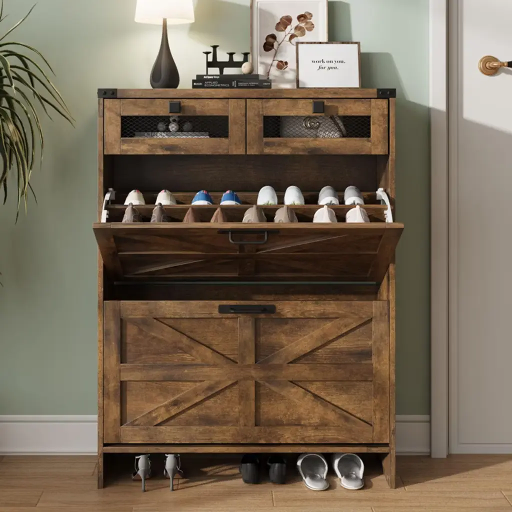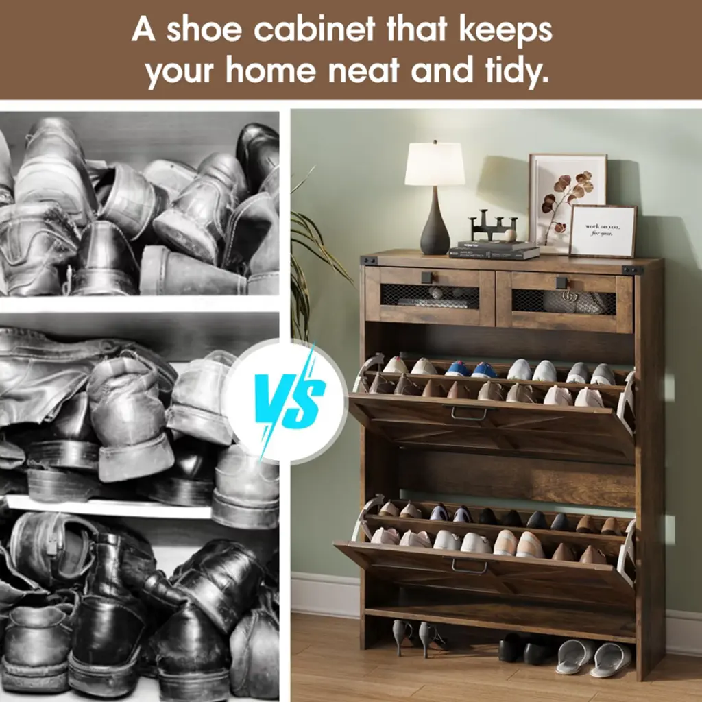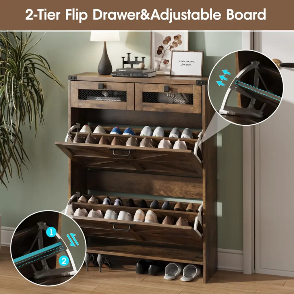 This farmhouse-style slim shoe cabinet blends rustic charm with practical storage, featuring wood grain finish, wire mesh drawers, wooden slat door panels, and iron corner accents. It offers 2 flip drawers (each with 2 tiers and removable dividers) and 2 additional drawers for keys/wallets, fitting neatly in entryways with its slim 23.6"W9.4"D38.6"H design. Made of quality MDF with anti-tipping device for safety, it assembles easily with labeled parts, keeping homes tidy while adding farmhouse warmth to any space.