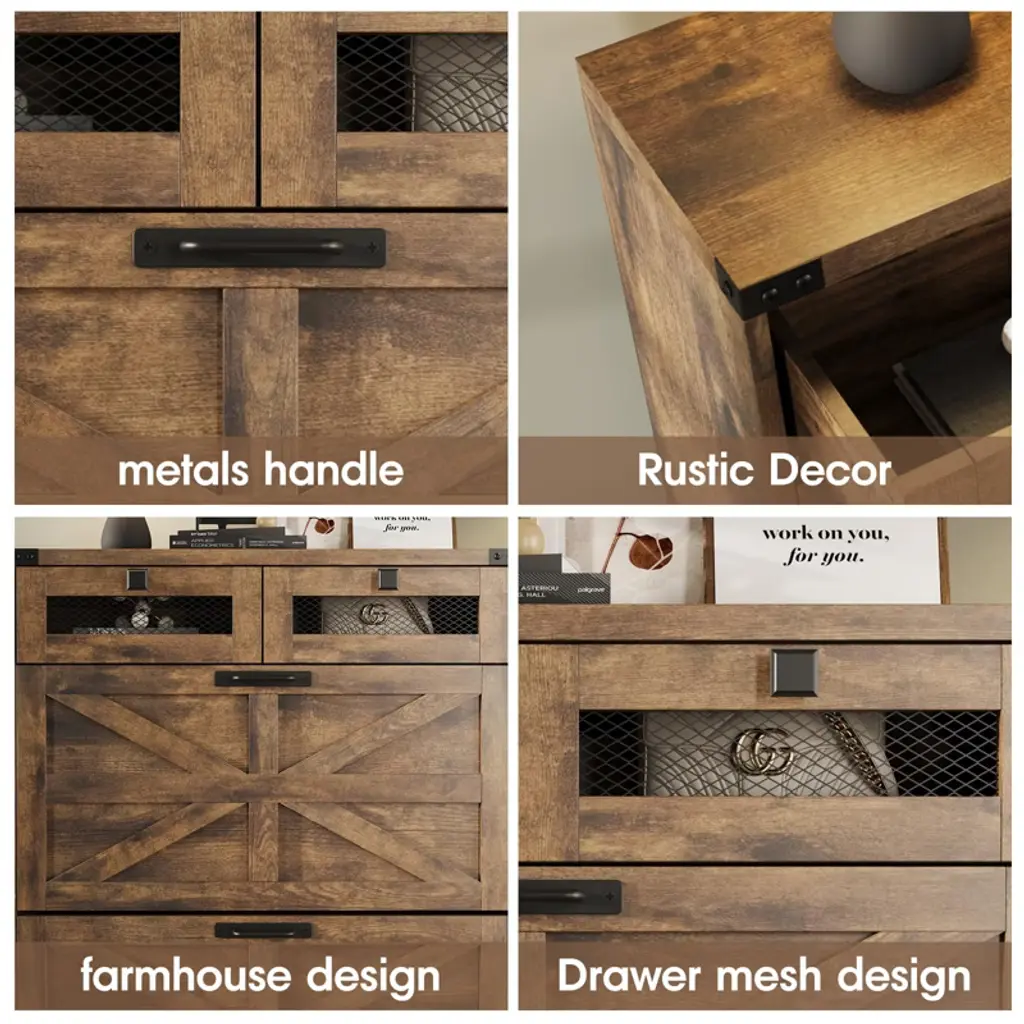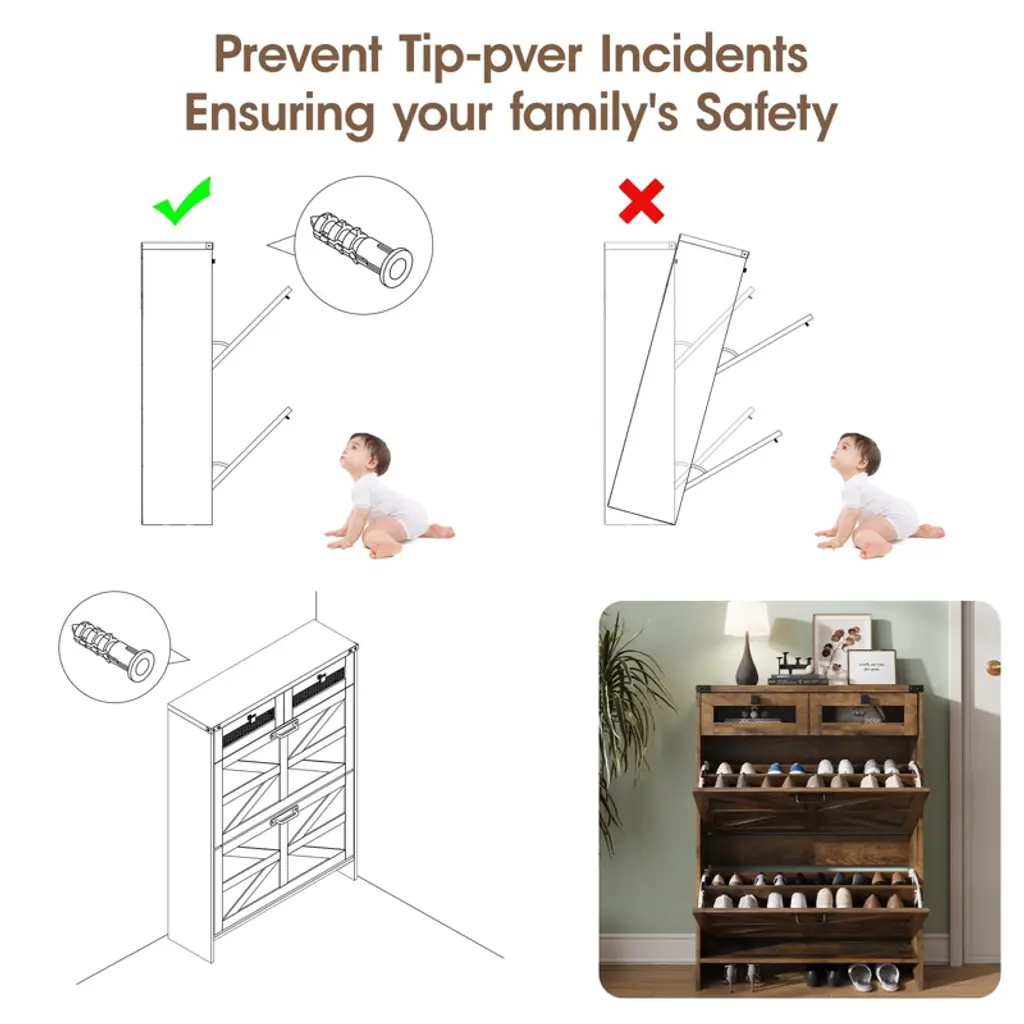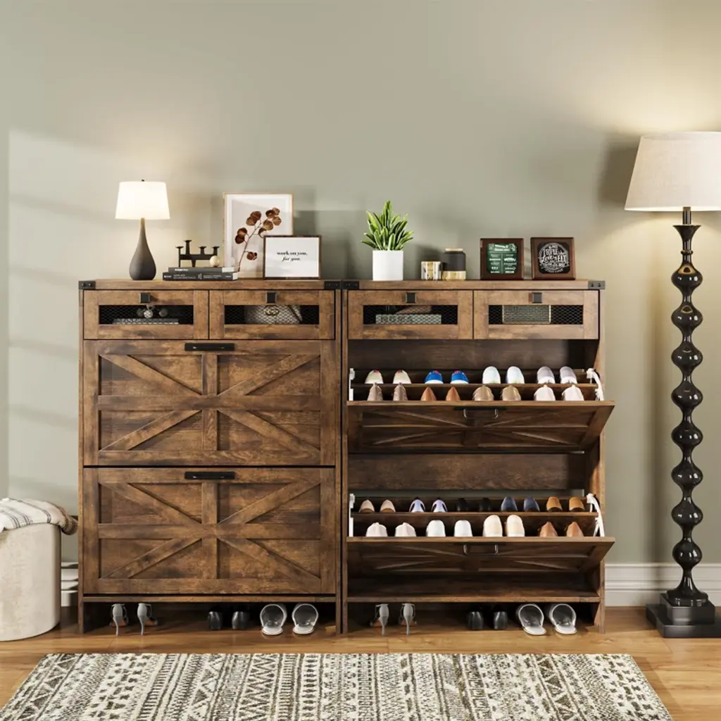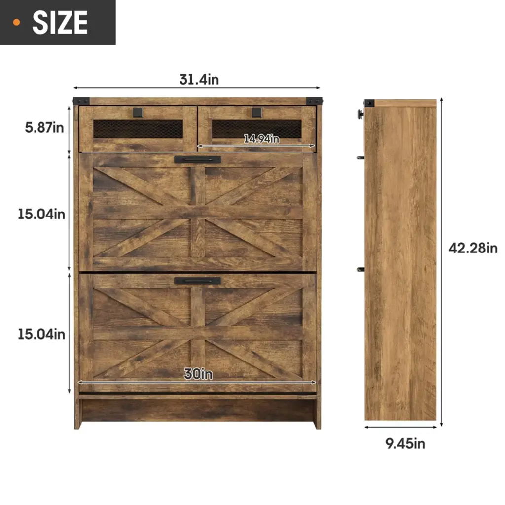 This farmhouse-style slim shoe cabinet blends rustic charm with practical storage, featuring wood grain finish, wire mesh drawers, wooden slat door panels, and iron corner accents. It offers 2 flip drawers (each with 2 tiers and removable dividers) and 2 additional drawers for keys/wallets, fitting neatly in entryways with its slim 23.6"W9.4"D38.6"H design. Made of quality MDF with anti-tipping device for safety, it assembles easily with labeled parts, keeping homes tidy while adding farmhouse warmth to any space.