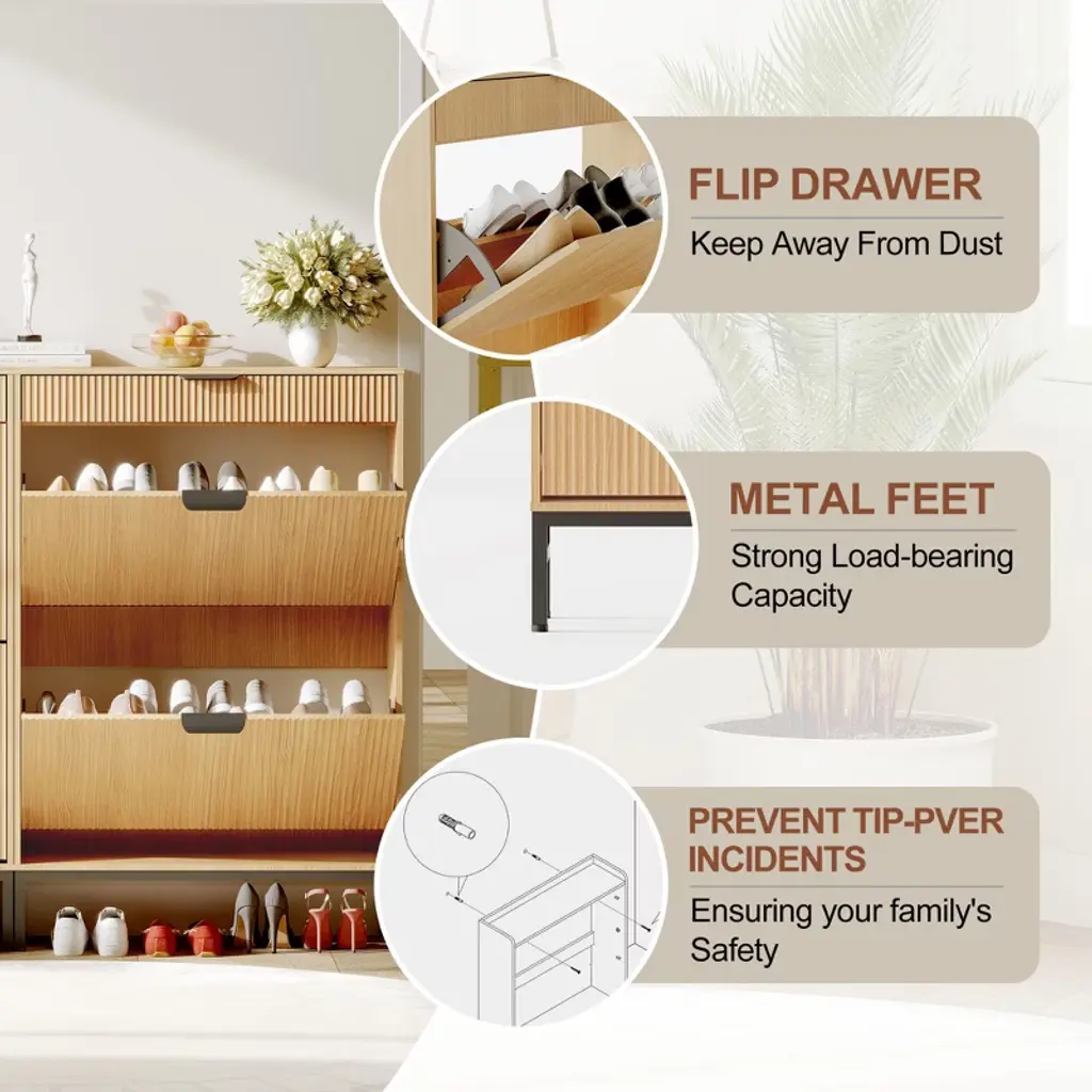 Keep your entryway neat and stylish with this slim farmhouse shoe storage organizer. Featuring two spacious flip drawers with dual tiers and a large top drawer for accessories, it offers ample and hidden storage designed to maximize space in small rooms or apartments.