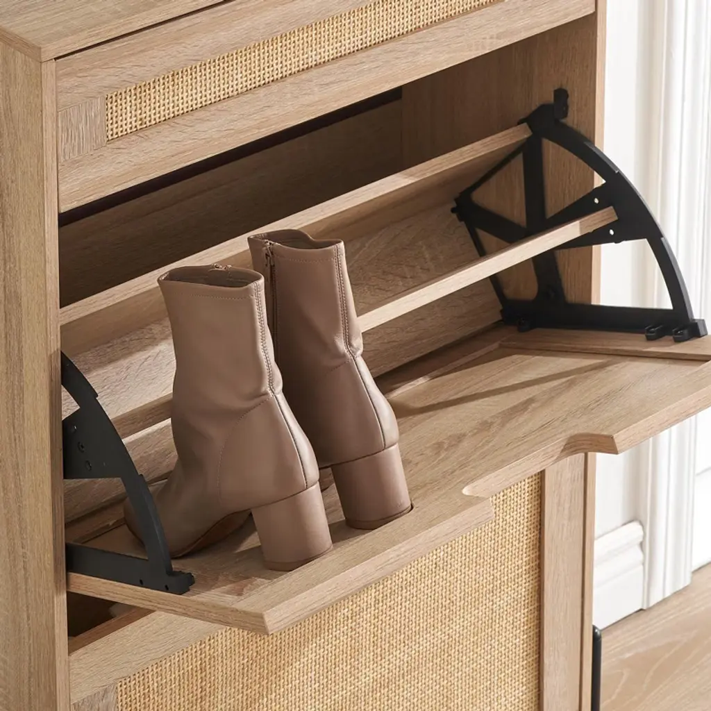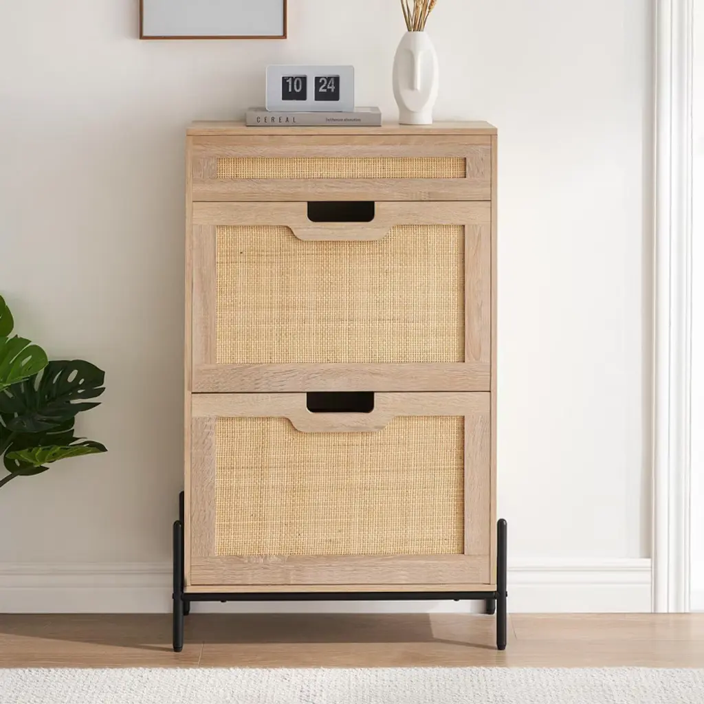 Natural Rattan 3 Flip Drawers Shoe Cabinet, Narrow Shoe Storage Cabinet With 3-tier Adjustable Shelves, Freestanding Shoe Rack Organizer