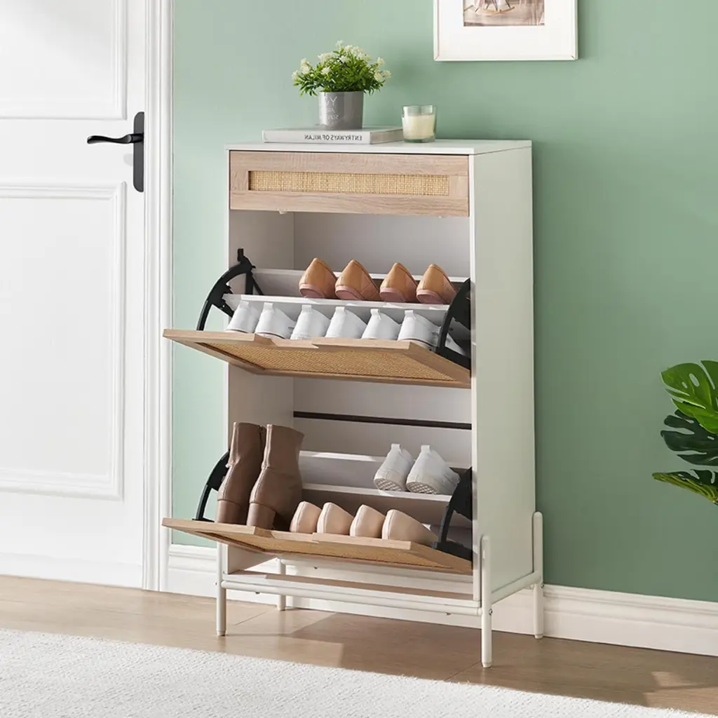 This shoe cabinet is not just a shoe storage solution; it’s a statement of style that seamlessly integrates into your home decor while providing functionality. Designed for modern living, this shoe cabinet offers ample storage space while enhancing the aesthetic appeal of your entryway, hallway, or mudroom.Feature:The rattan shoe cabinet features a stunning combination of natural rattan and a sleek frame, creating an elegant look that enhances any decor style.With multiple compartments, the shoe organizer can accommodate a variety of shoe sizes and styles.Designed with urban living in mind, this shoe rack cabinet maximizes storage without taking up too much floor space.The design of the rattan doors promotes airflow, preventing moisture build-up and keeping your shoes fresh. Specification:Color: White+OakMaterial: PBFull Size: 24''×9.4''×40.3''Flip Door Size: 22.5''×13.4''Drawer Door Size: 24''×4.7''Leg Height: 3.7'' Packing List:1×Rattan Shoe Cabinet1×Instruction1×Assembly Kit Note:The storage quantity is up to the style of your shoes and size.Before making a purchase, make sure to measure the space you plan to place the shoe cabinet in. The size of the selected shoe cabinet should match the space in your home.