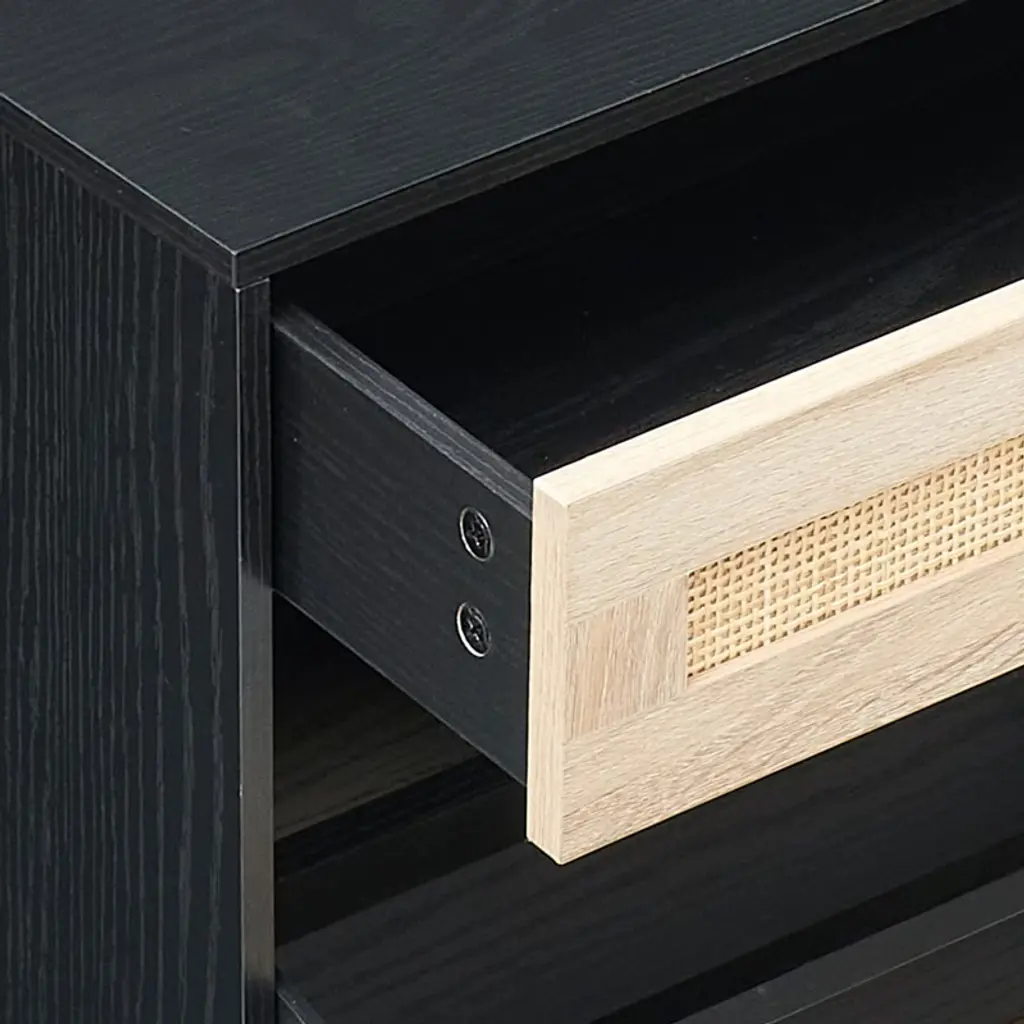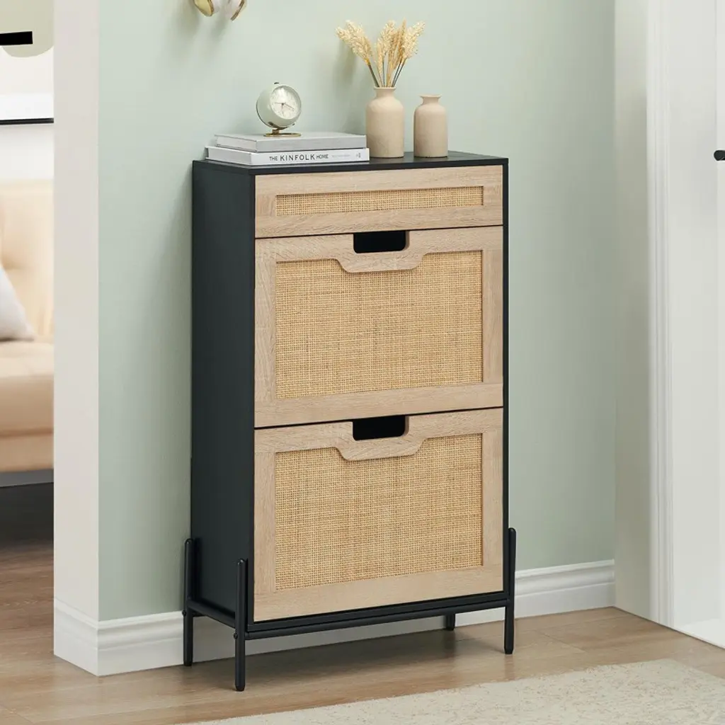 This shoe cabinet is not just a shoe storage solution; it’s a statement of style that seamlessly integrates into your home decor while providing functionality. Designed for modern living, this shoe cabinet offers ample storage space while enhancing the aesthetic appeal of your entryway, hallway, or mudroom.Feature:The rattan shoe cabinet features a stunning combination of natural rattan and a sleek frame, creating an elegant look that enhances any decor style.With multiple compartments, the shoe organizer can accommodate a variety of shoe sizes and styles.Designed with urban living in mind, this shoe rack cabinet maximizes storage without taking up too much floor space.The design of the rattan doors promotes airflow, preventing moisture build-up and keeping your shoes fresh. Specification:Color: Black+OakMaterial: PBFull Size: 24''×9.4''×40.3''Flip Door Size: 22.5''×13.4''Drawer Door Size: 24''×4.7''Leg Height: 3.7'' Packing List:1×Rattan Shoe Cabinet1×Instruction1×Assembly Kit Note:The storage quantity is up to the style of your shoes and size.Before making a purchase, make sure to measure the space you plan to place the shoe cabinet in. The size of the selected shoe cabinet should match the space in your home.