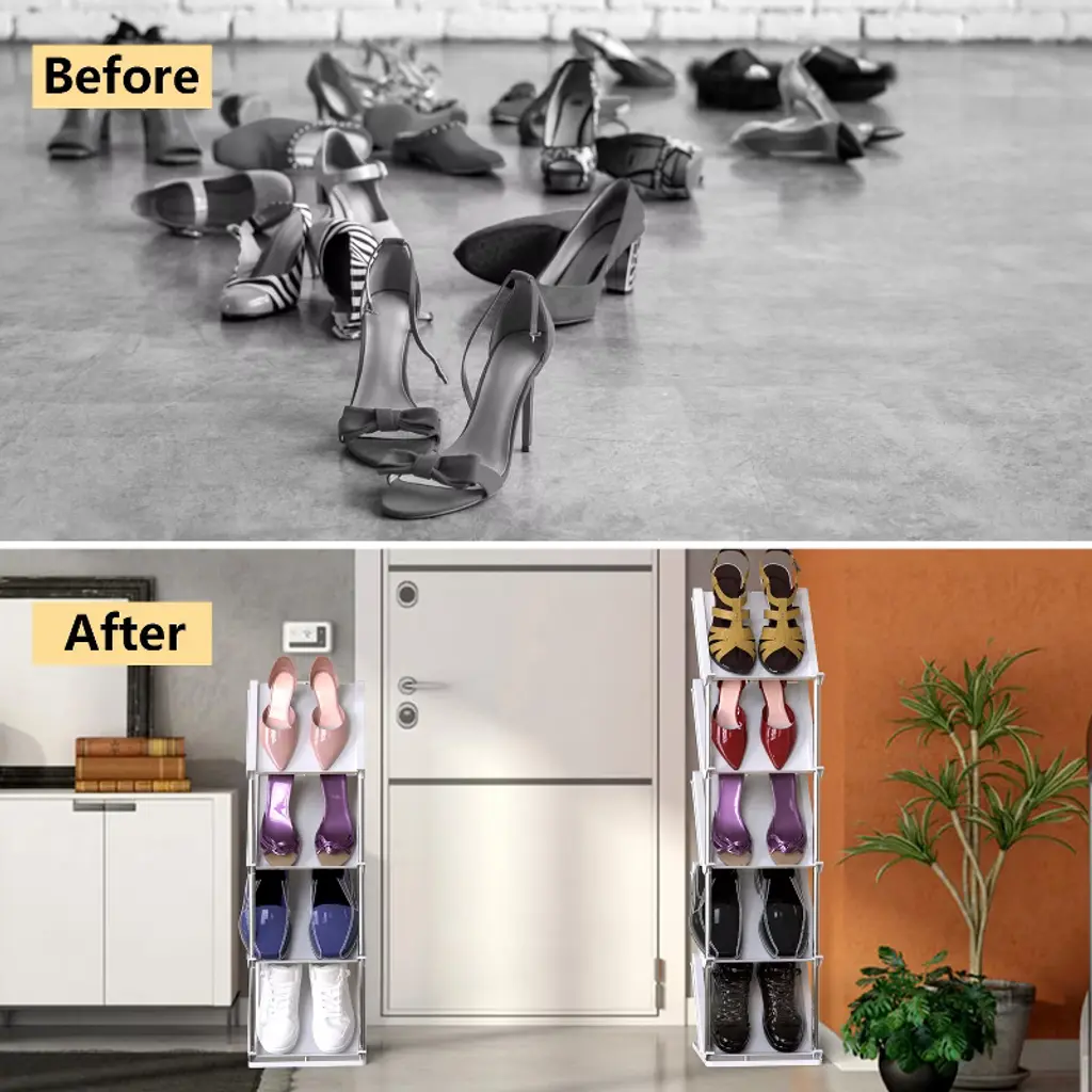 8-Tier Vertical Shoe Rack – Space-Saving, Stackable Organizer for Entryway, Bedroom & Closet Maximize your space with this innovative 8-Tier Vertical Shoe Rack, designed to fit into narrow and compact areas while keeping your shoes neatly organized. The unique sloping design ensures that it occupies only a small floor space of 10.23x10.62 inches, making it the perfect solution for tight spaces like entryways, hallways, and closets. Key Features: Space-Saving Design: The narrow, vertical structure and sloping shelves allow for a tidy, organized shoe storage solution that doesn't take up much space, ideal for entryways, bedrooms, or small areas. Customizable & Stackable: Thanks to its flexible design with side slots, you can easily adjust the rack into multiple configurations. The perfect fit in any space. It’s perfect for tight corners or under desks. Durable & Safe: Crafted from smooth, rounded PP plates and rustproof stainless steel rods, this shoe rack is not only strong and stable but also safe to use around children, with no sharp edges to worry about. Each layer can hold up to 6.6 lbs, making it sturdy enough for various shoe types. Tool-Free Assembly: Assembling this shoe rack is quick and easy with no tools or screws required. Simply follow the included instructions, and you can have your rack set up in just 5 minutes. Versatile & Practical: Whether you need storage for boots, high heels, sneakers, or flats, this narrow shoe rack is perfect for all types of footwear. Its compact design makes it ideal for use in corners, closets, corridors, wardrobes, bedrooms, or even in a study room. Specifications: Material: PP Plates & Stainless Steel Rods Color : Grey Size : 8-Tier Tier Load Capacity: 6.6 lbs per tier Total Load Capacity: 53 lbs (8-Tier) Assembly Required: Yes, easy tool-free assembly Dimensions (8-Tier): 10.23 x 10.62 x 64.37 inches (L x W x H) Weight (8-Tier): 4.84 lbs Package Includes: 8 x Layer Plates 1 x Bottom Plate 22 x Supportive Rods 1 x User Manual