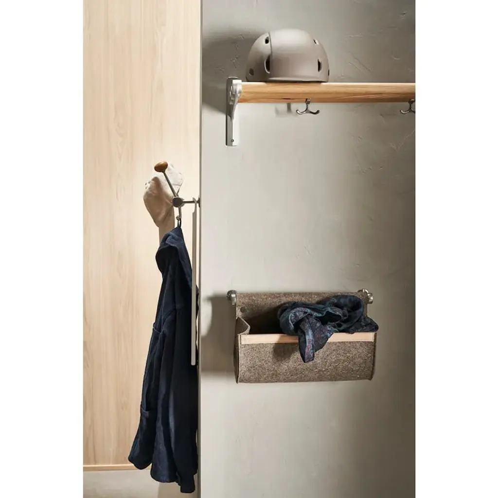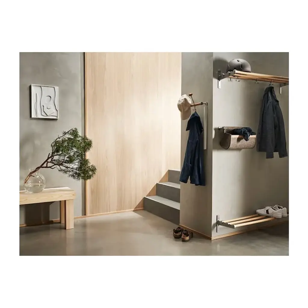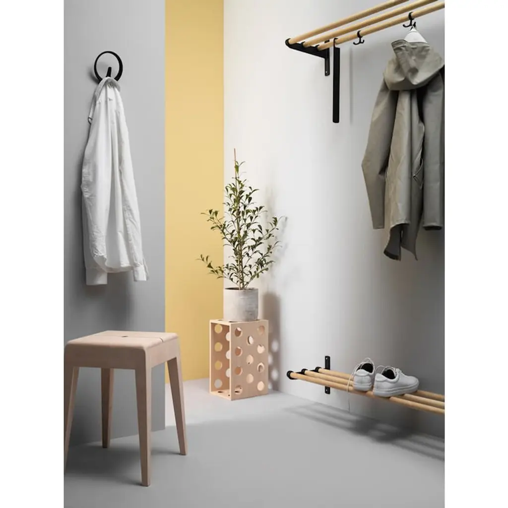 Essem Design's Nostalgi rack is a versatile storage solution for both your hats and shoes – its purpose entirely depends on the height at which you choose to install it. Positioned closer to the ground, the Nostalgi becomes a handy shoe rack for your favorite sneakers, beloved boots, and other footwear. When mounted higher on the wall, it offers a convenient shelf for storing hats, caps, and other accessories. The storage capacity can be further improved with additional hooks that attach to the metal structure of the shelf. The package includes three separate mounting hooks. Originally designed by Gunnar Bolin in 1937, the Nostalgi shelf is made of durable birch. This design classic effortlessly increases the functionality of the entryway, hallway, or bedroom wall.