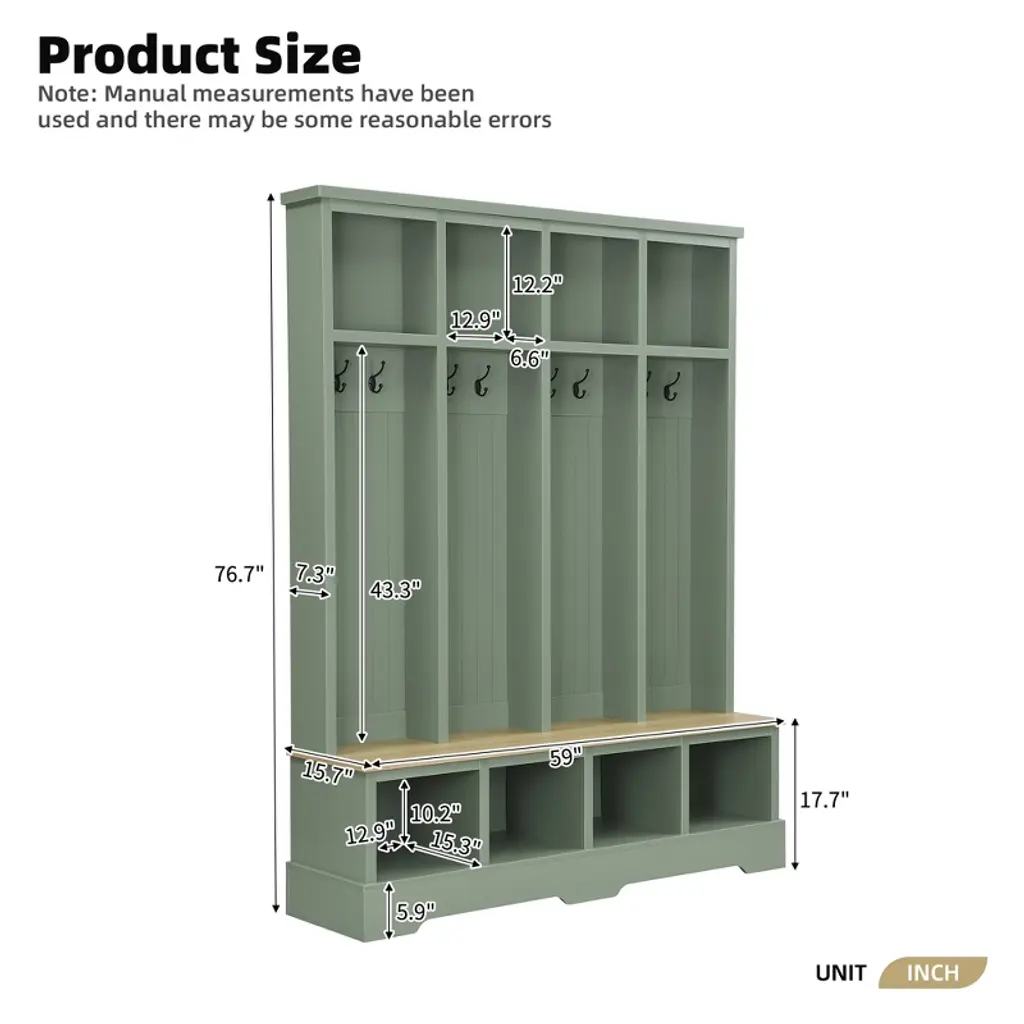 Orrd 59" Farmhouse Hall Tree Bench With 8 Hooks & Storage, 3-in-1 Entryway Organizer For Mudroom, Shoe Rack, Rustic Style,green