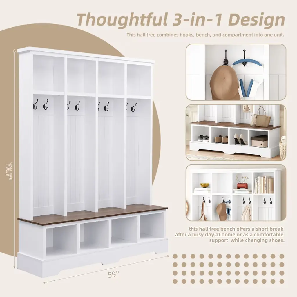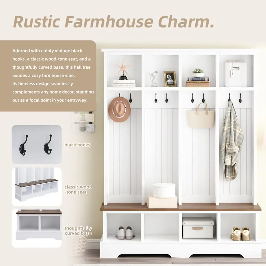 Maximize your entryway with this 59" Farmhouse Hall Tree! Features 8 hooks, open storage compartments & a sturdy bench. Perfect for organizing coats, shoes & bags in mudroom or living room. Rustic charm meets modern function. Easy assembly & anti-tip safety included.