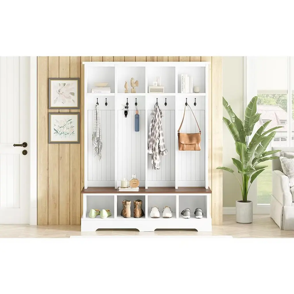 Orrd 59" Farmhouse Hall Tree Bench With 8 Hooks & Storage, 3-in-1 Entryway Organizer For Mudroom, Shoe Rack, Rustic Style,white