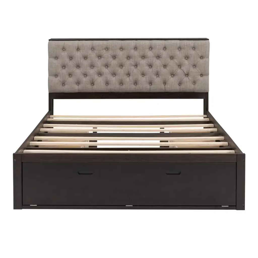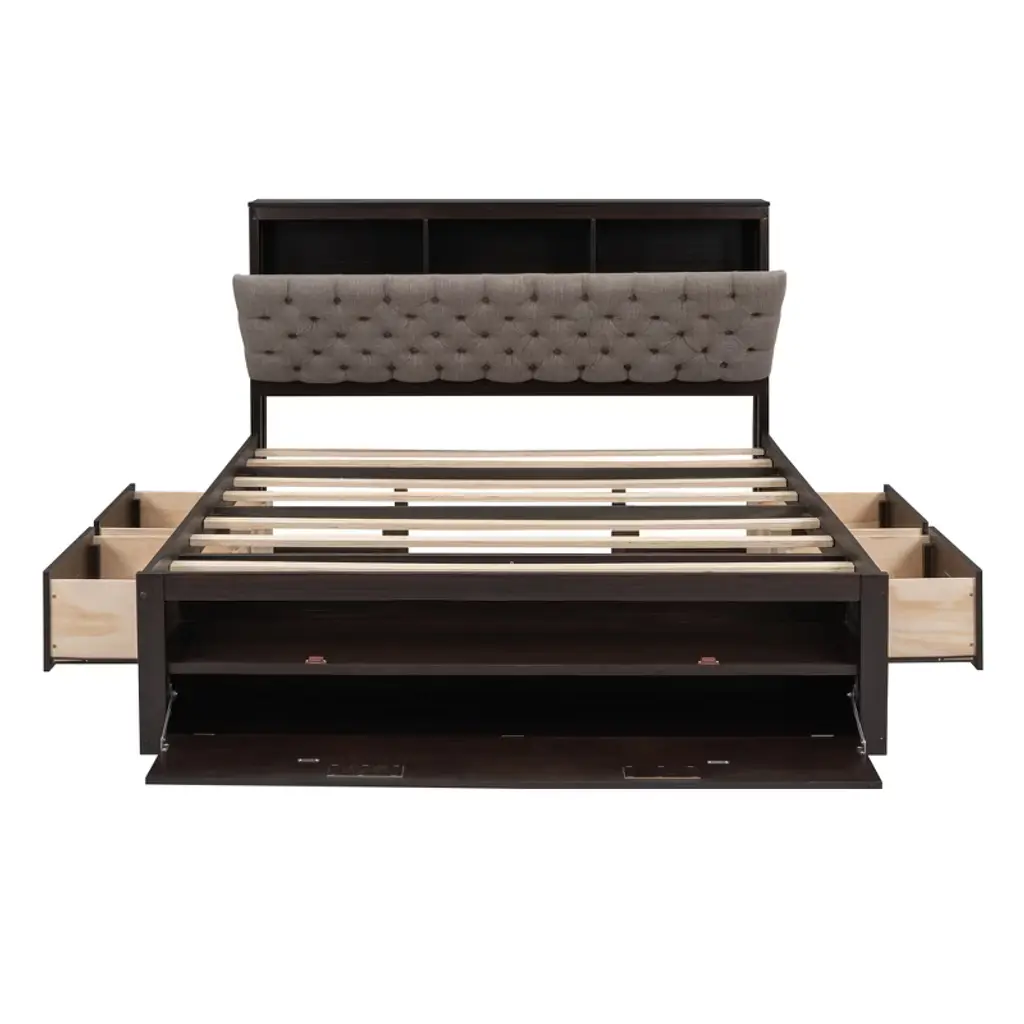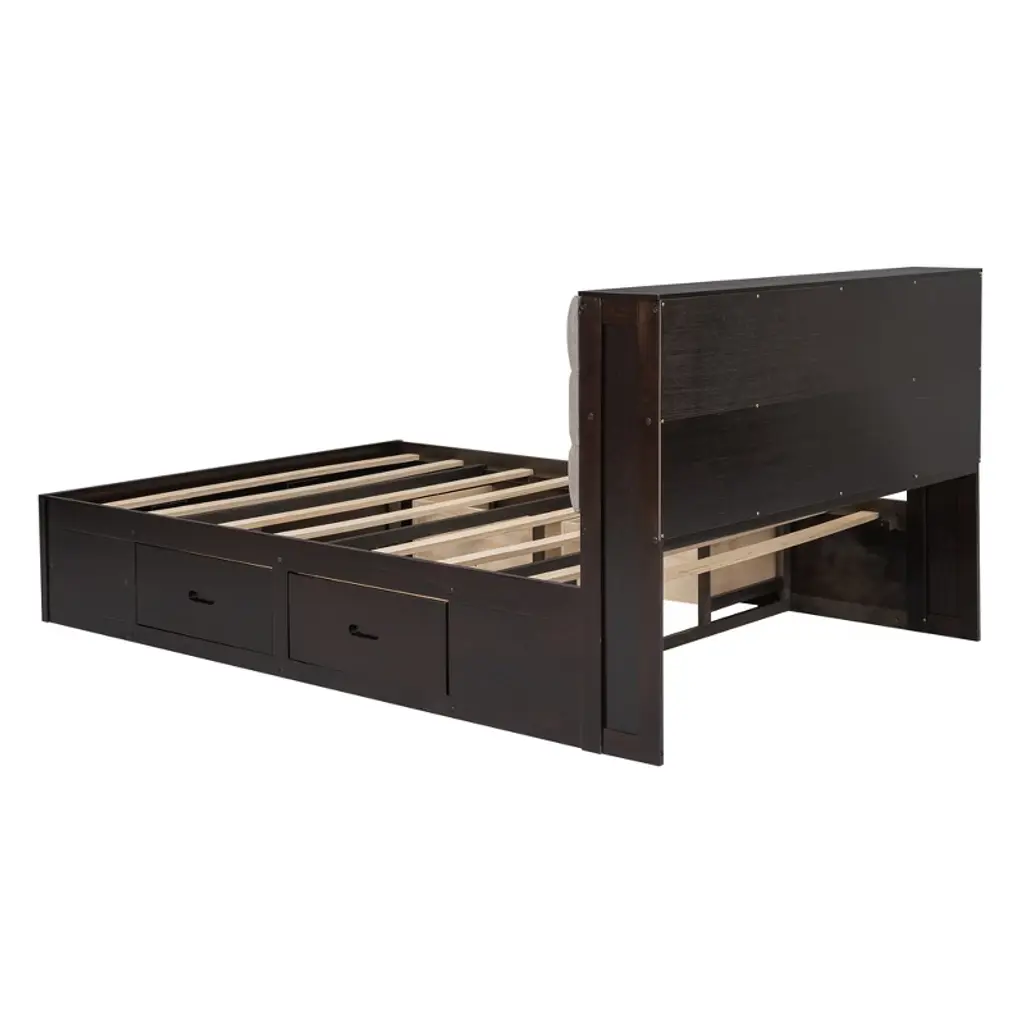 Queen Size Bed With Storage Upholstery Headboard And 4 Drawers, Wood Platform Bed Frame With Shoe Rack For Kids Teens Adults, Espresso